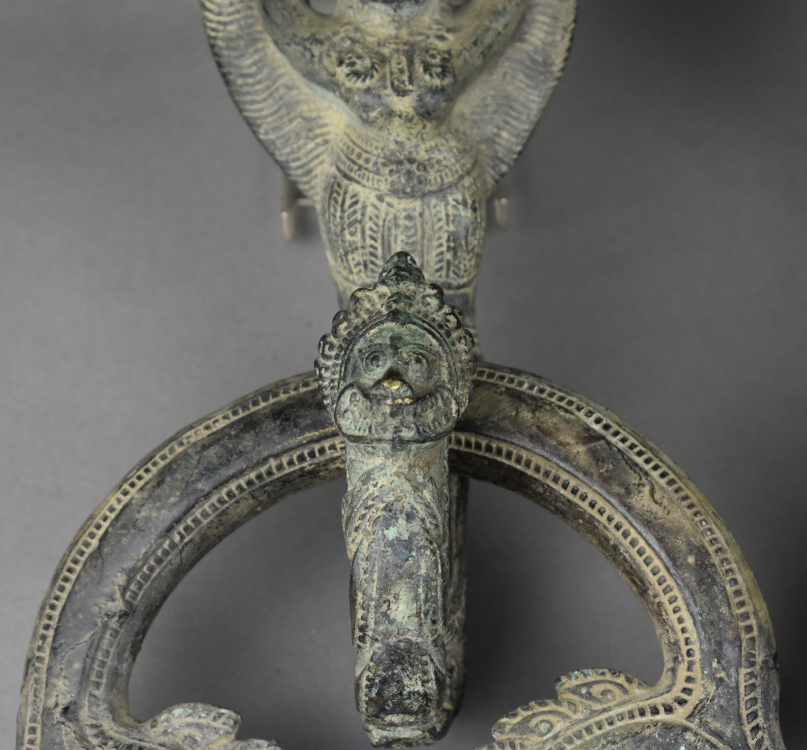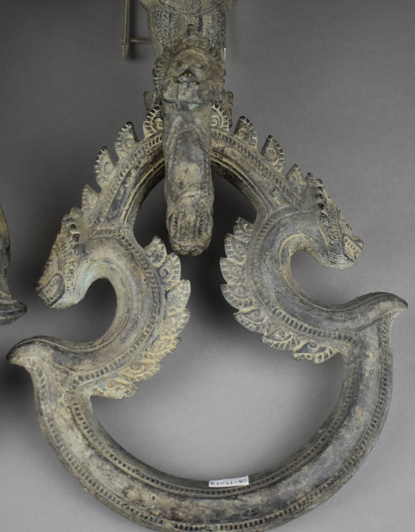 Paire de poignées de char en bronze sculptée. Cambodge. Haut. : 50 cm.