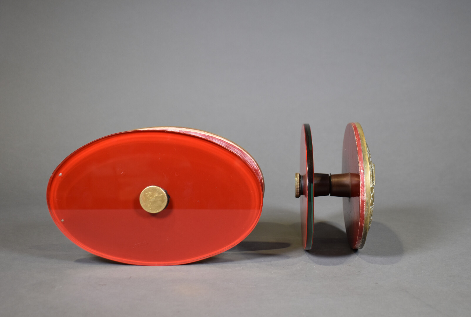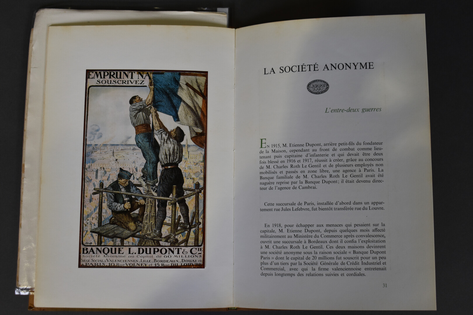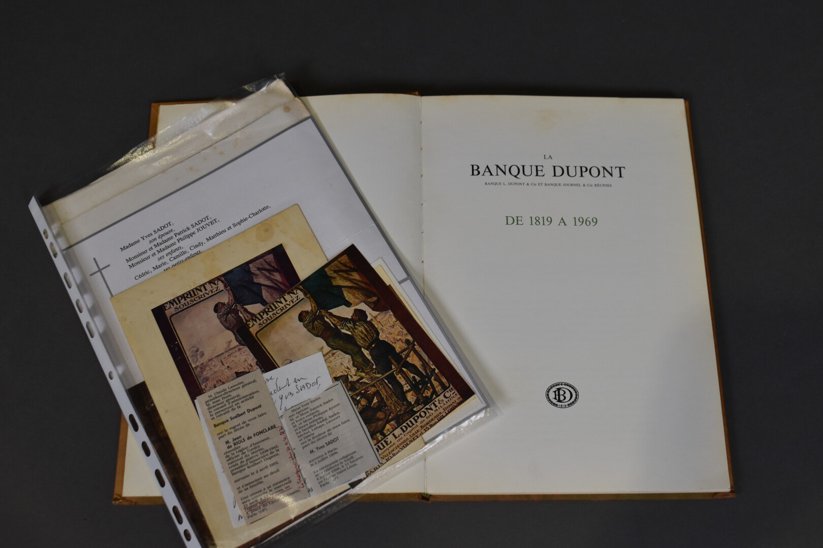 Paire de poignées de porte à médaillons en bronze, supports en bois et verre aux initiales de la banque DUPONT (1819-1969). Dim des plaques de bronze : 27 x 18 cm. On joint de la documentation sur la famille DUPONT.