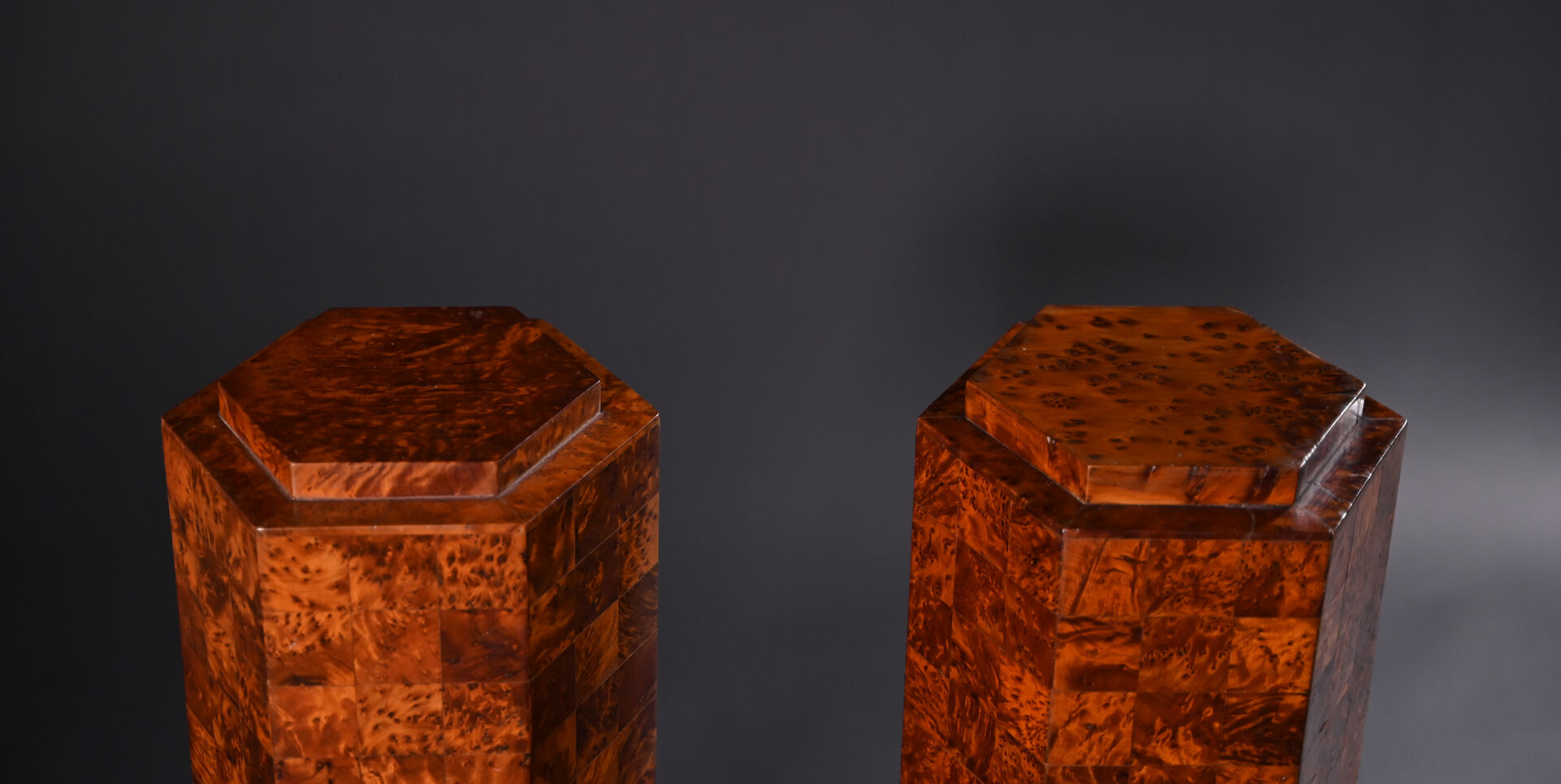 Paire de sellettes à fût hexagonal en placage de loupe, la base en gradins. Epoque Art Déco. Haut. : 88 cm.
