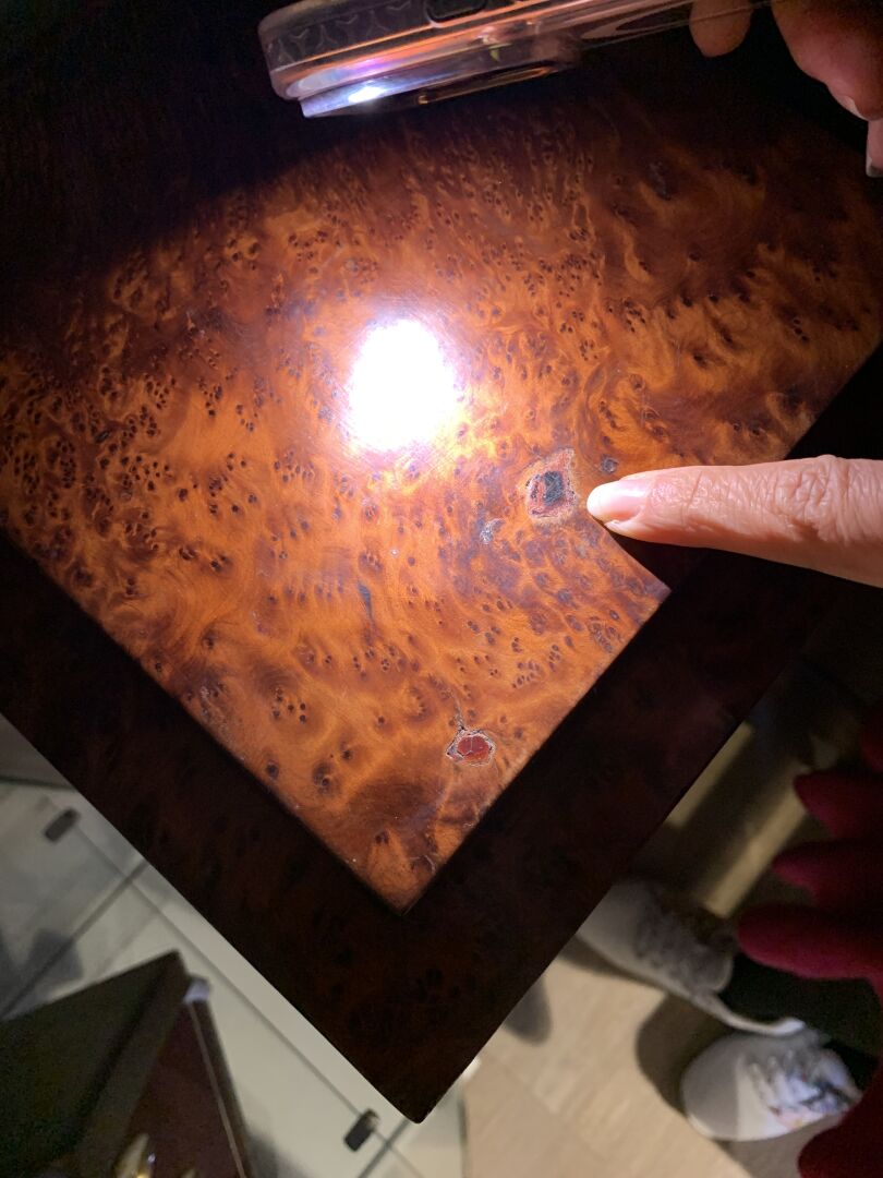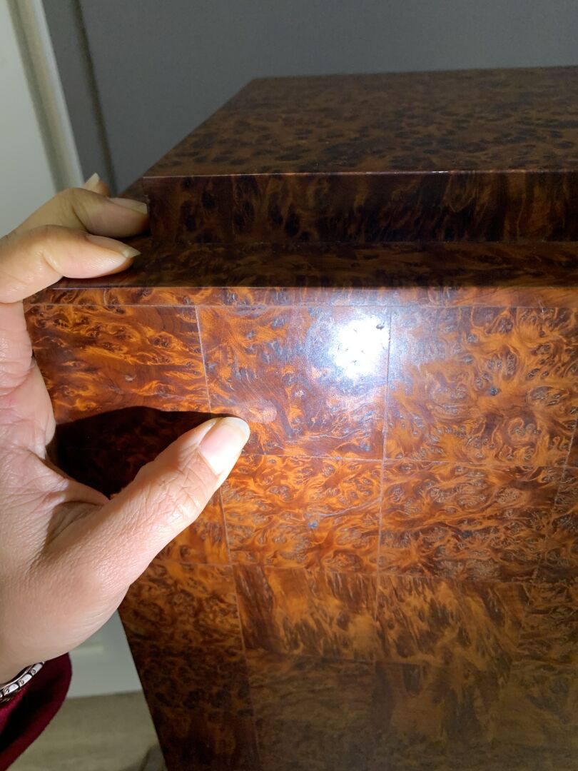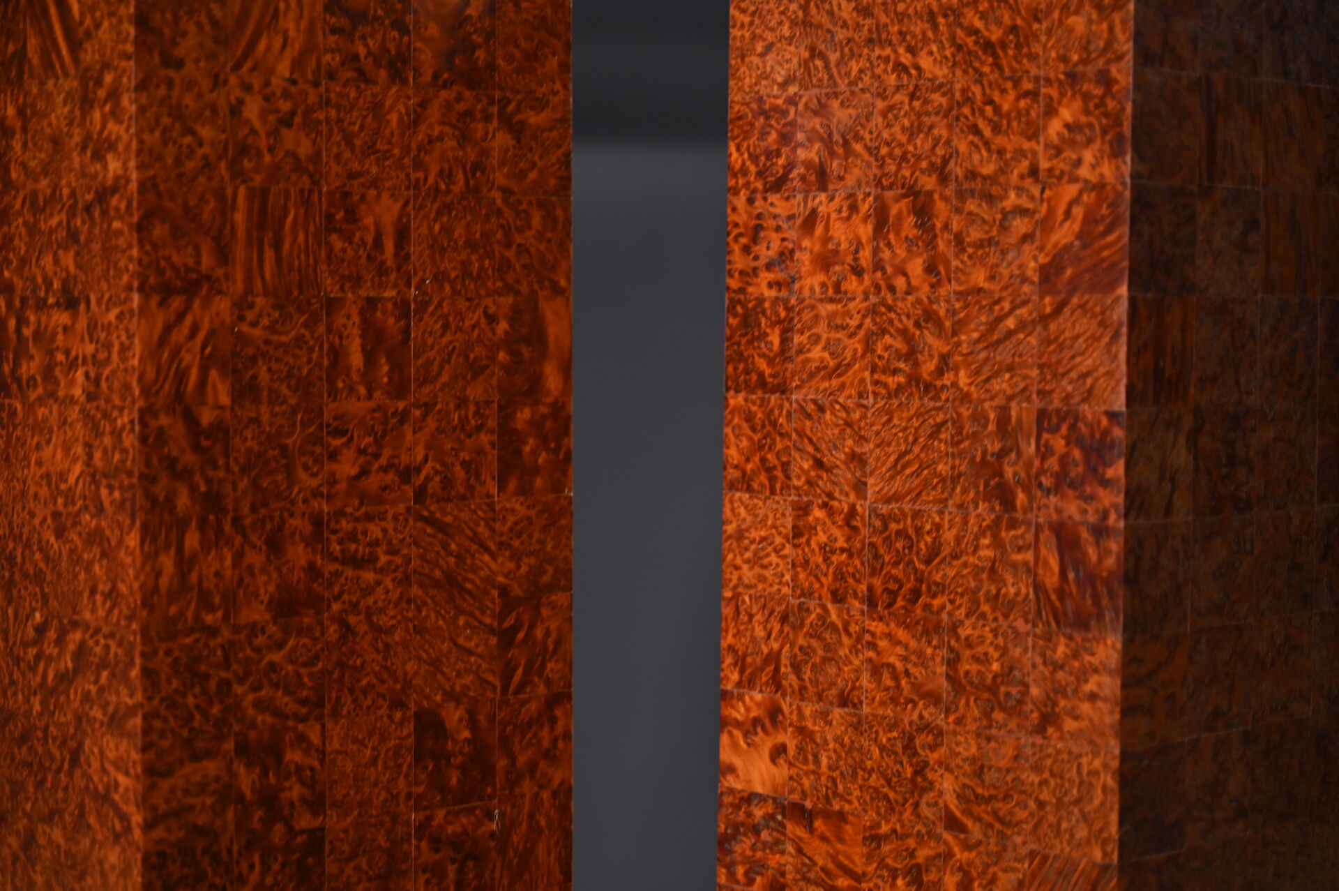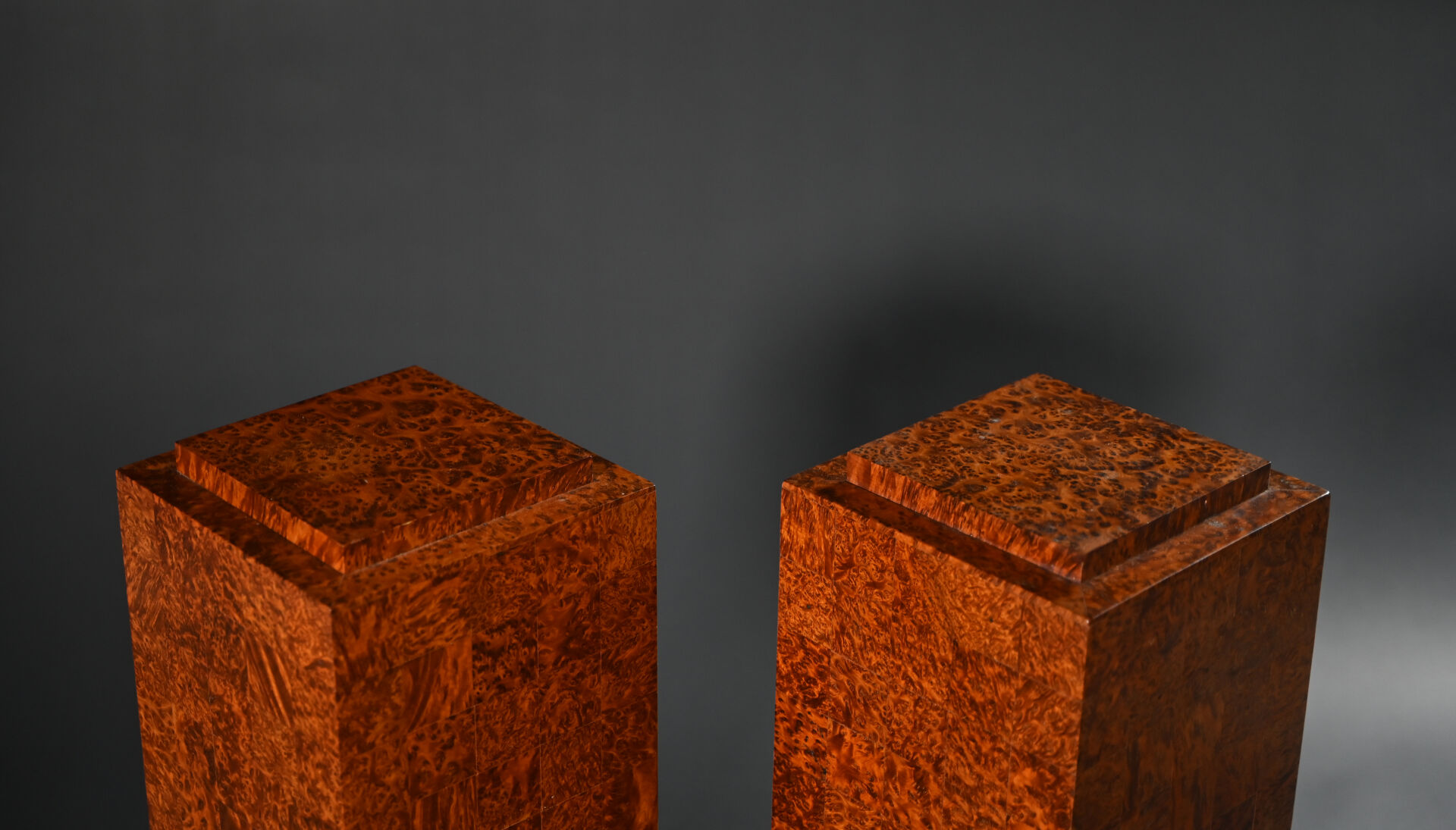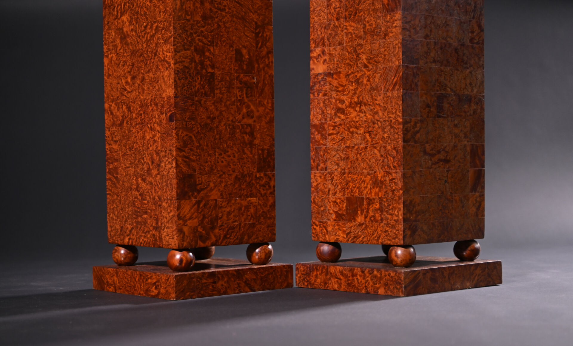 Paire de sellettes colonnes rectangulaire en placage de loupe, la base à quatre boules (usures d’usage, trace de chaud). Epoque Art Déco. Haut. : 93 cm.
