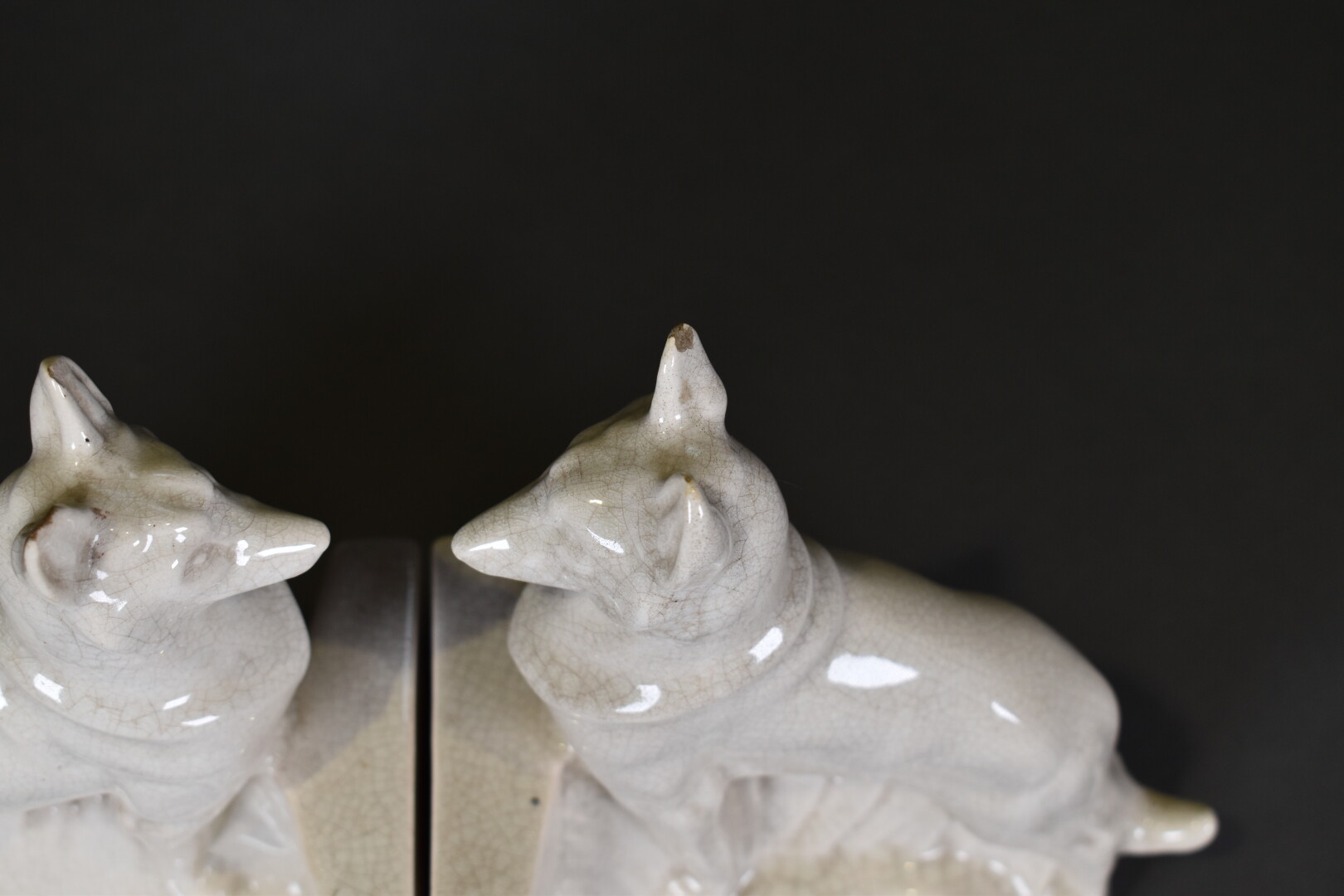 Paire de serre-livre en céramique crème craquelée représentant des chiens (deux éclats aux oreilles). Milieu du XXe siècle. Haut. : 20 cm.