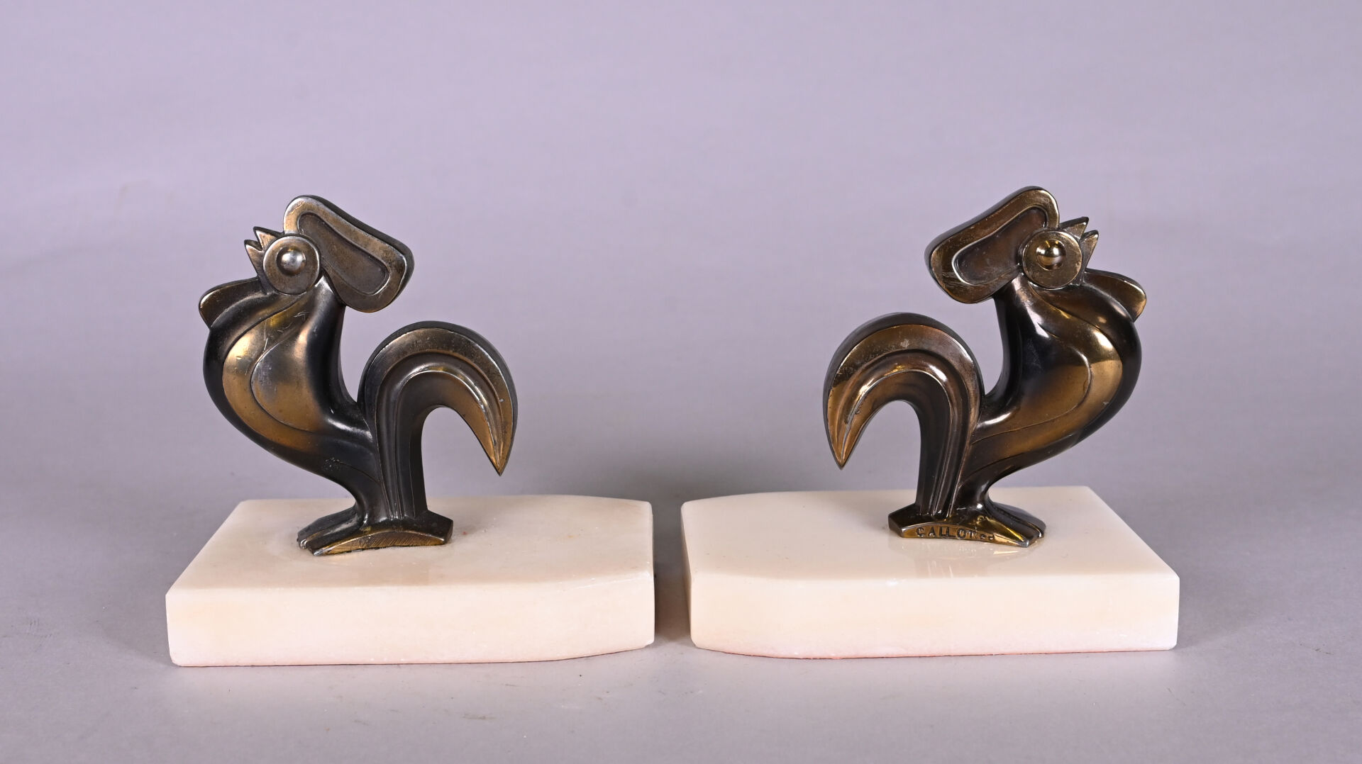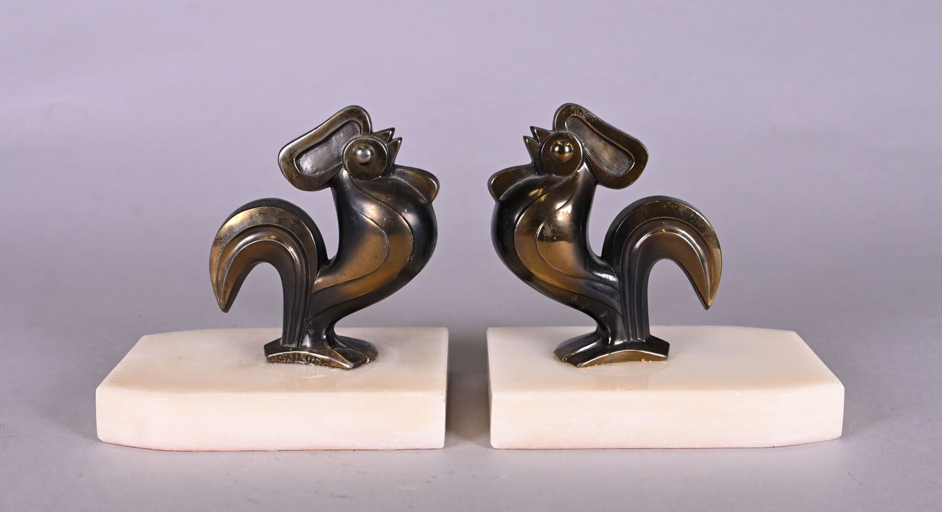 Paire de serre-livre en métal blanc patiné brun-doré figurant des coqs. Socle d’albâtre. Style Art Déco. Haut. : 12 cm.