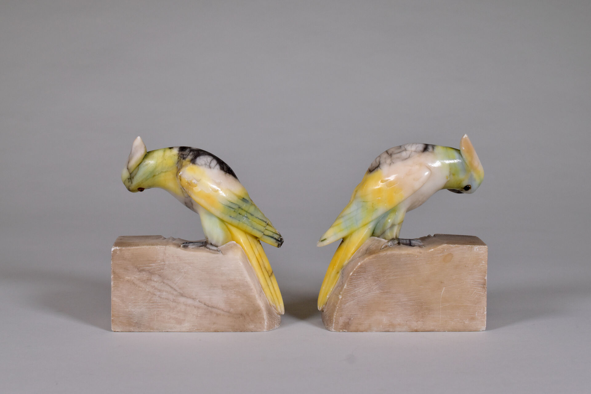 Paire de serre-livres en albâtre peint représentant des cacatoes, les yeux en verre (un accident recollé). Milieu du XXe siècle. Haut. : 16 cm.