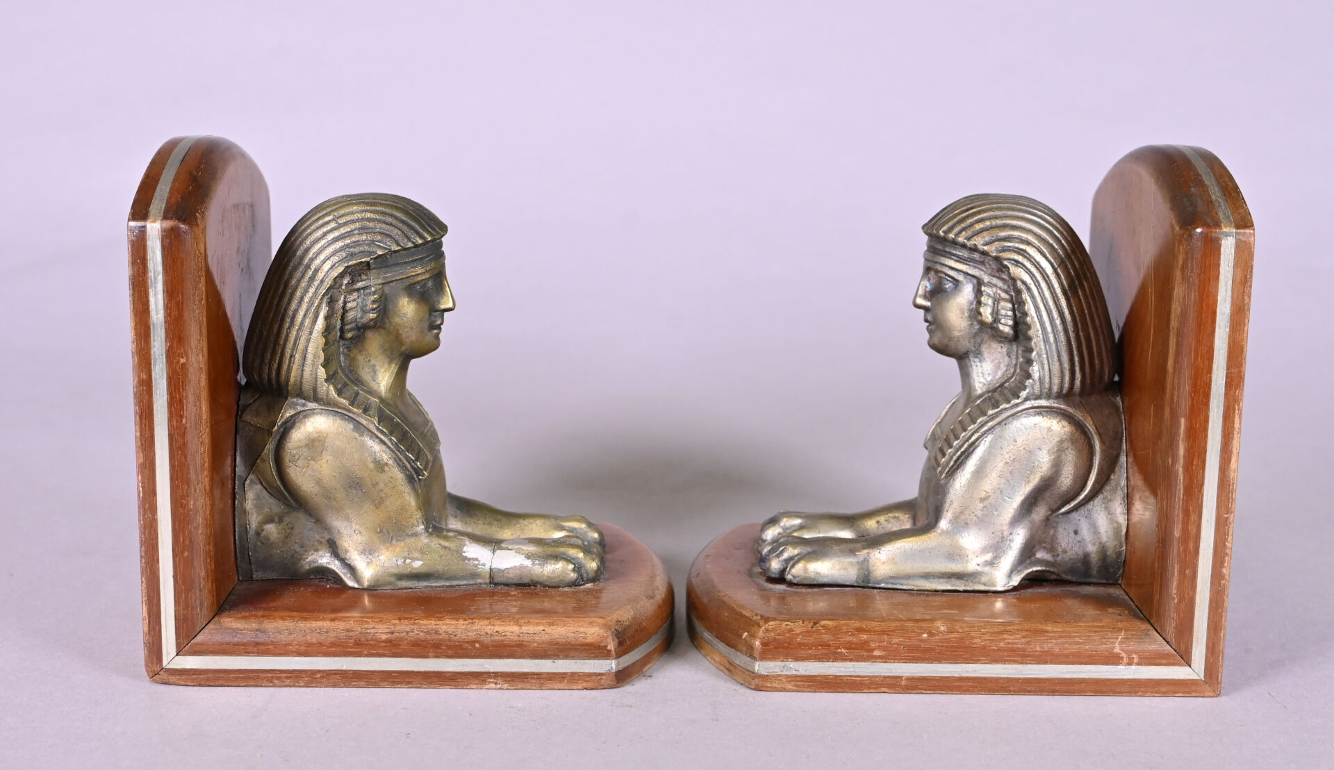 Paire de serre-livres en bois exotique à décor de sphinges en métal blanc patiné or (usures). Première moitié du XXe siècle. Haut. : 13,5 cm.