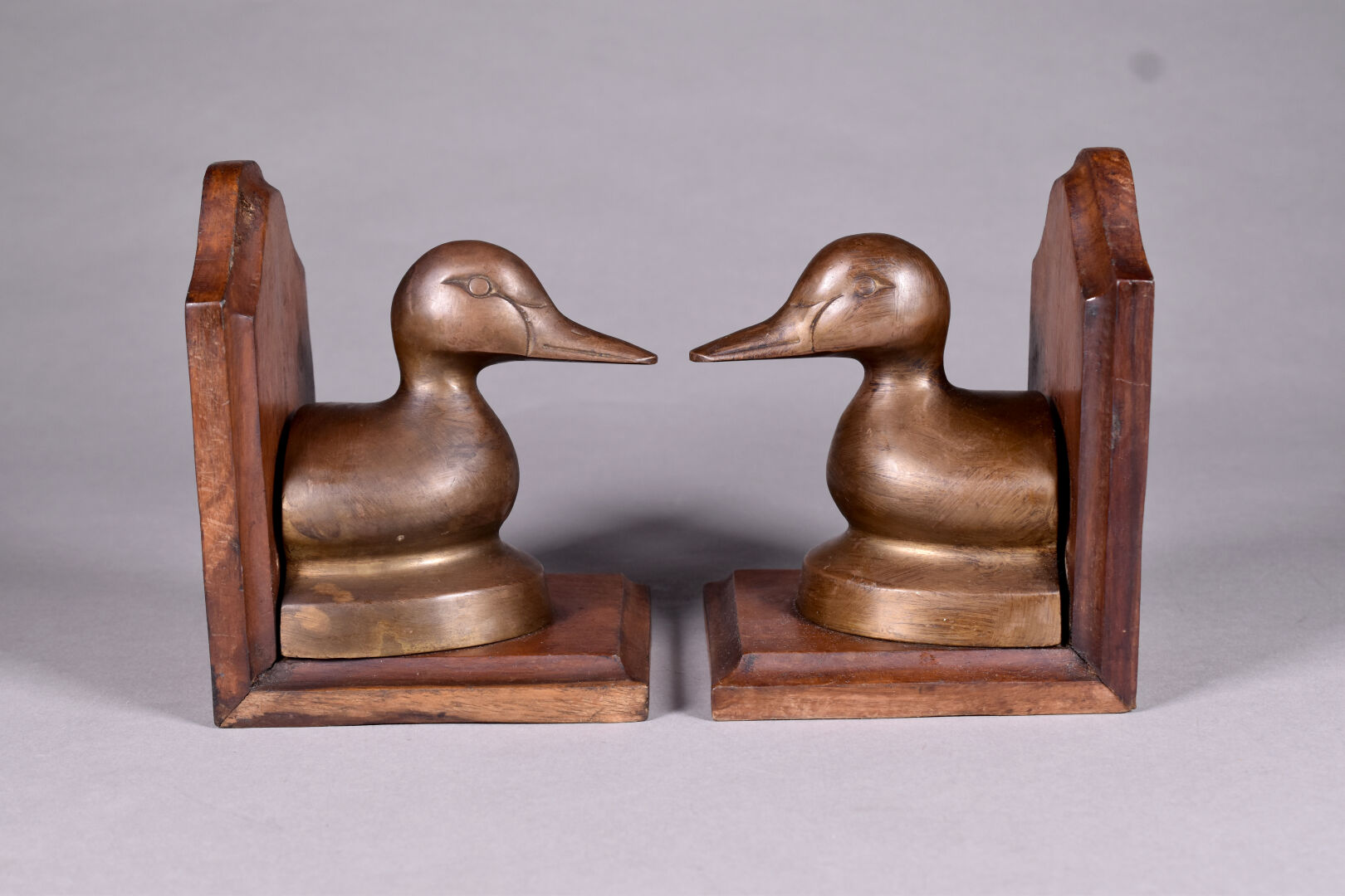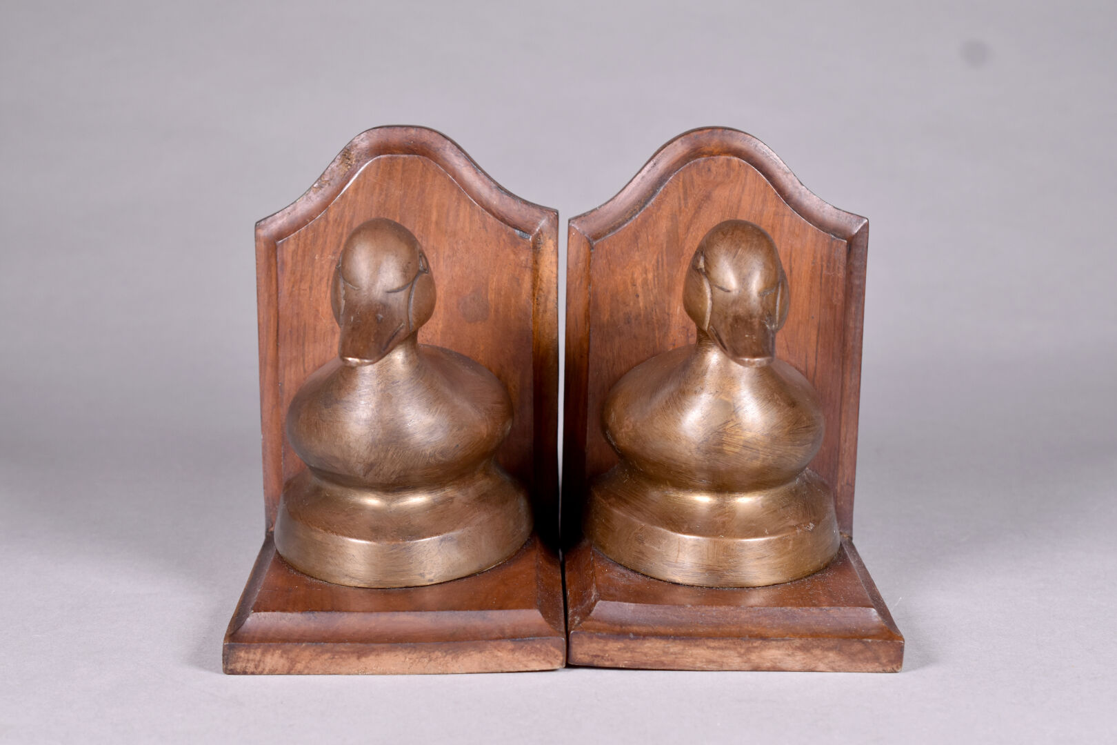 Paire de serre-livres en bronze ou laiton légèrement patiné sur socle en bois figurants des canards. Haut. : 18 cm.
