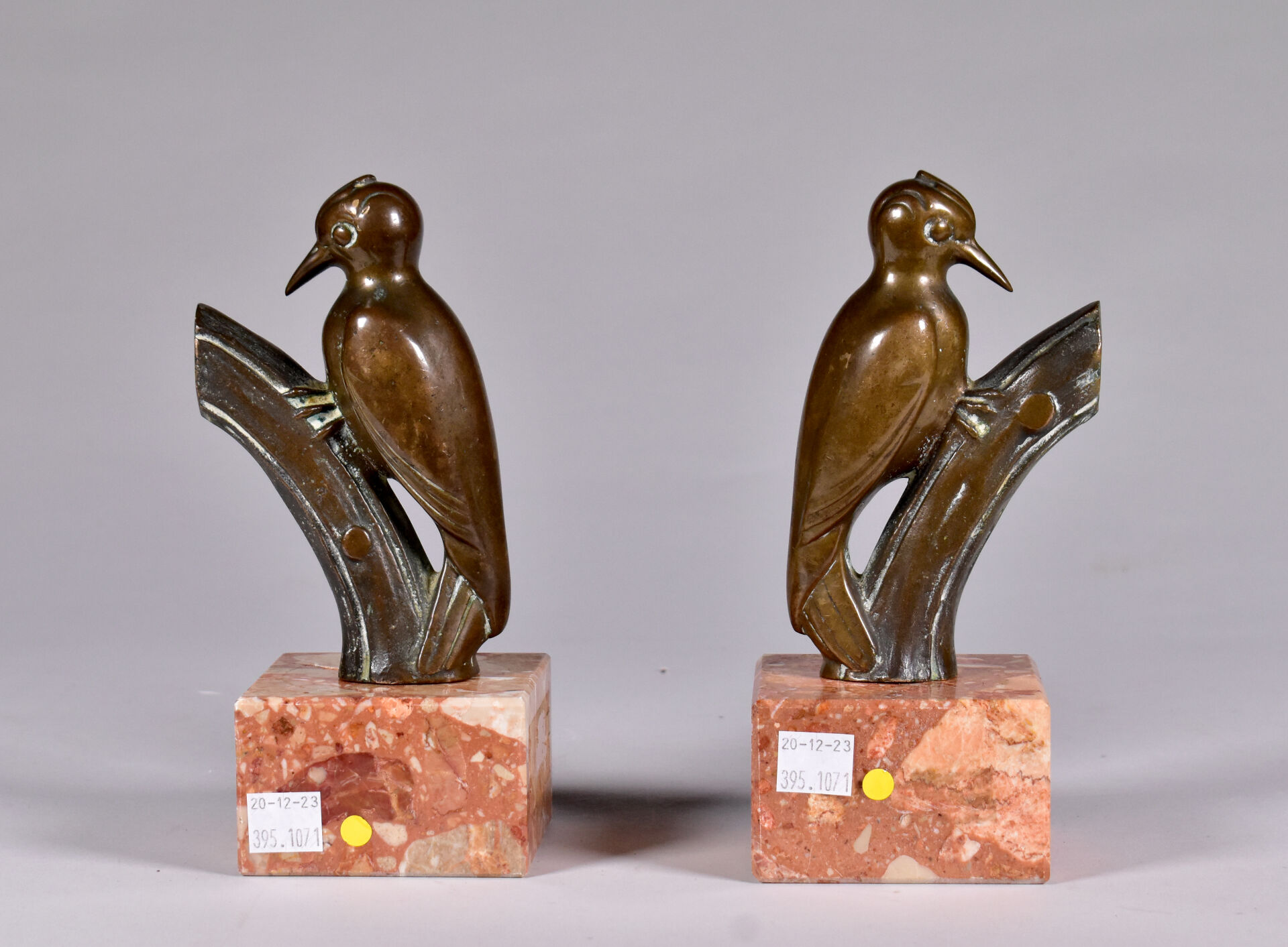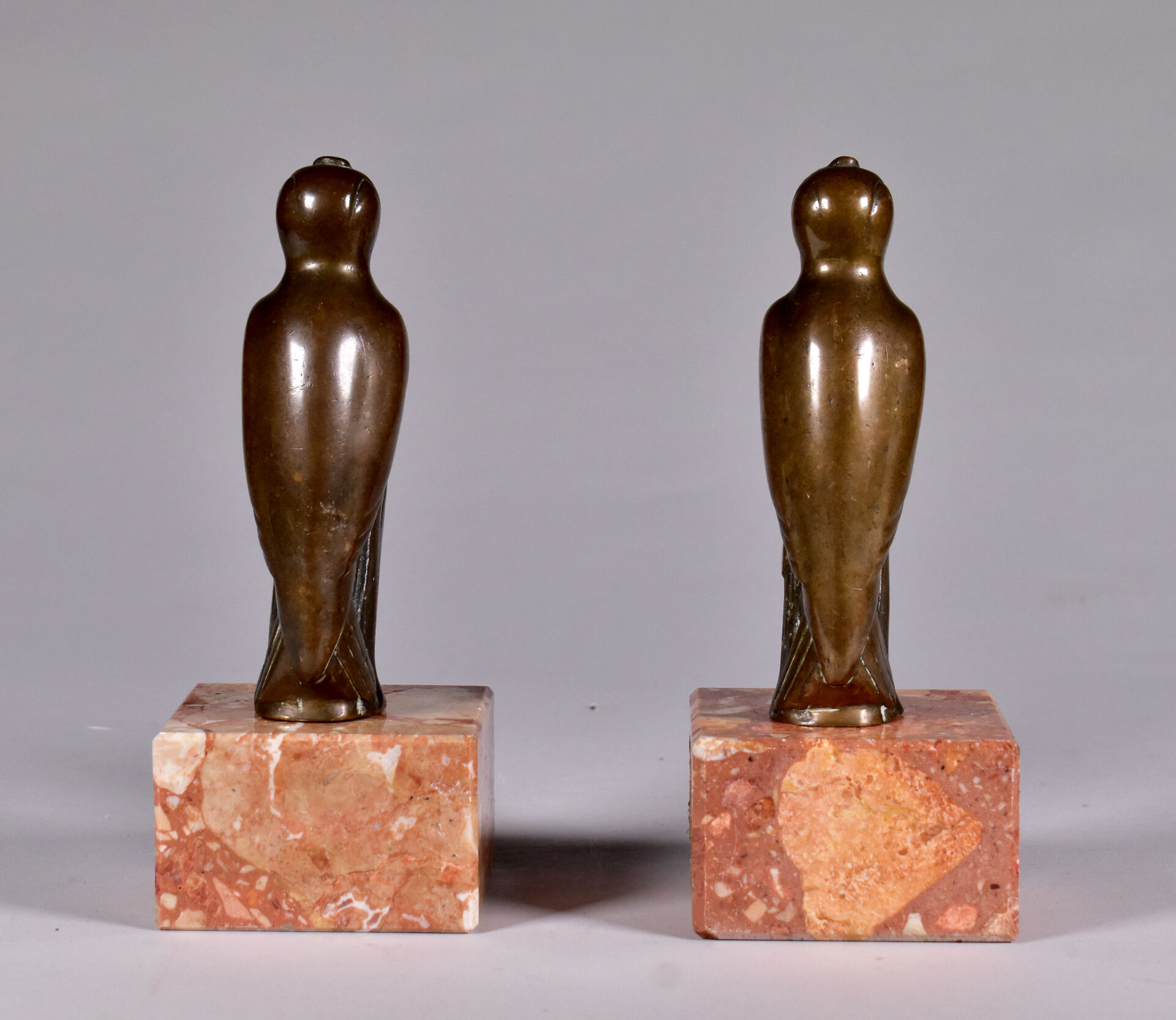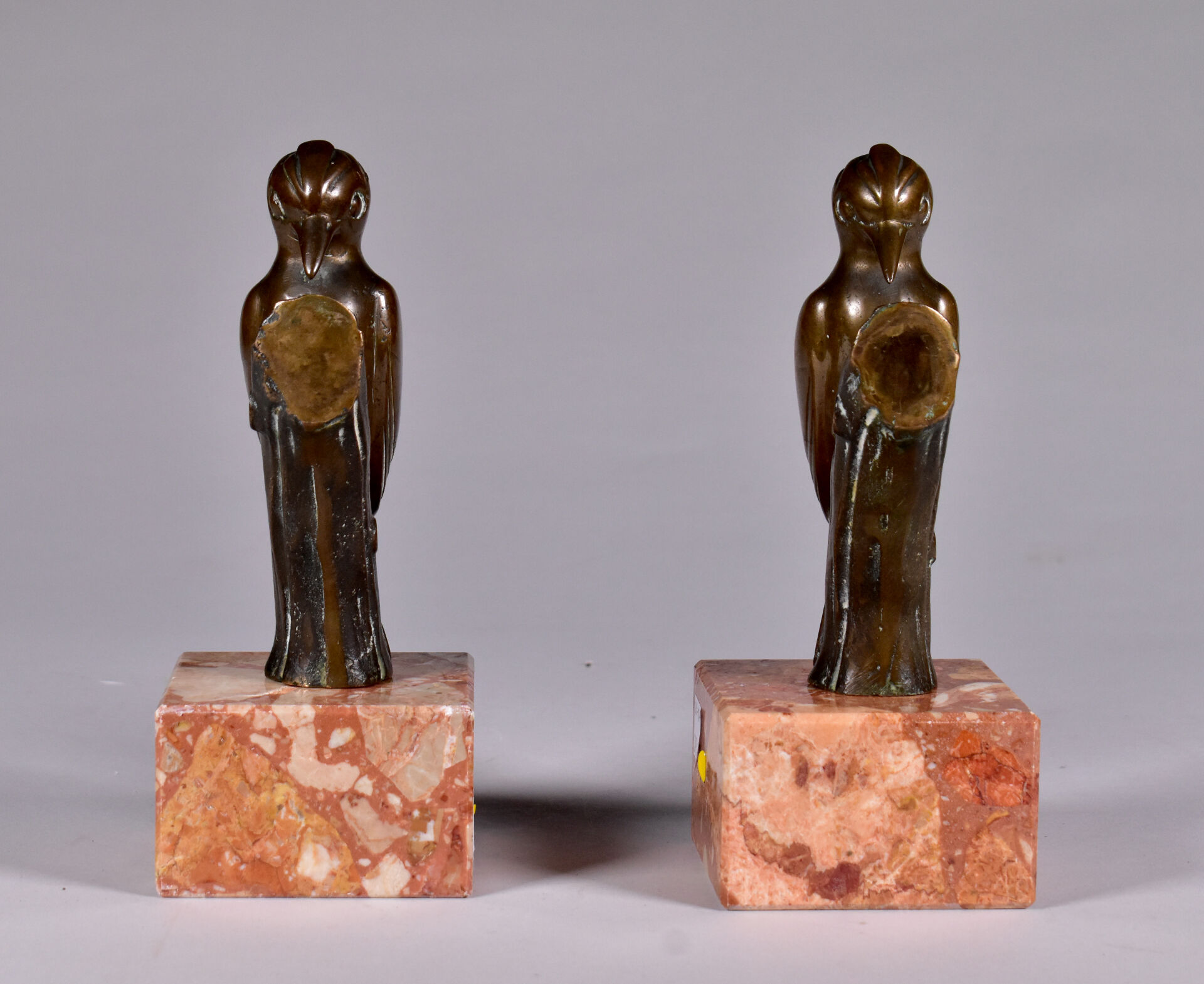 Paire de serre-livres en bronze patiné brun figurant des oiseaux sur une branche. Socle de marbre brique. XXe siècle. Haut. : 19,5 cm.