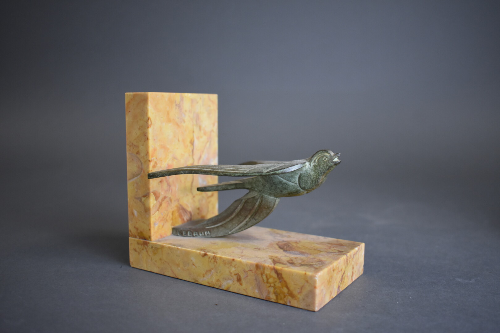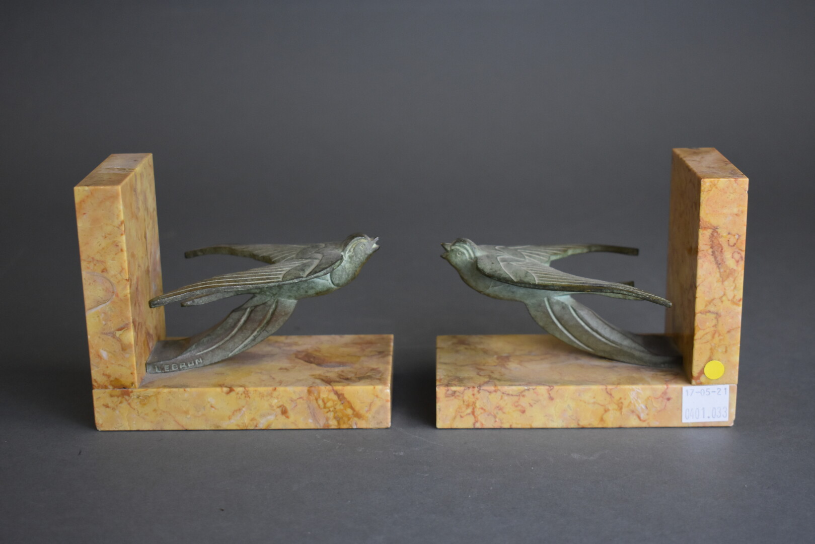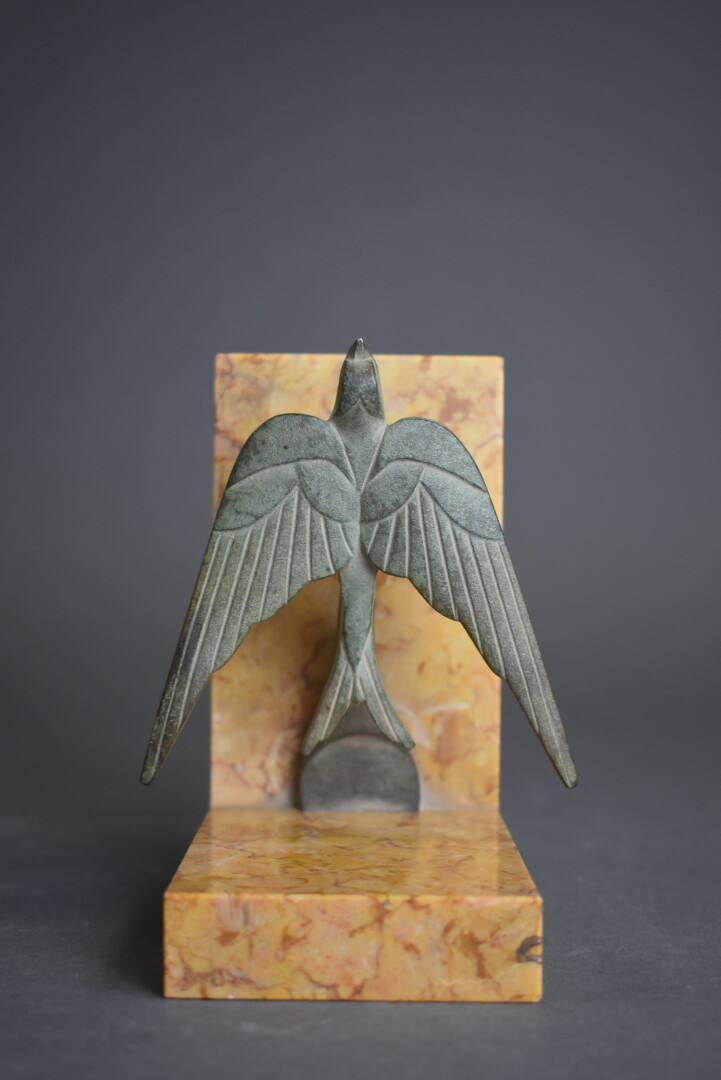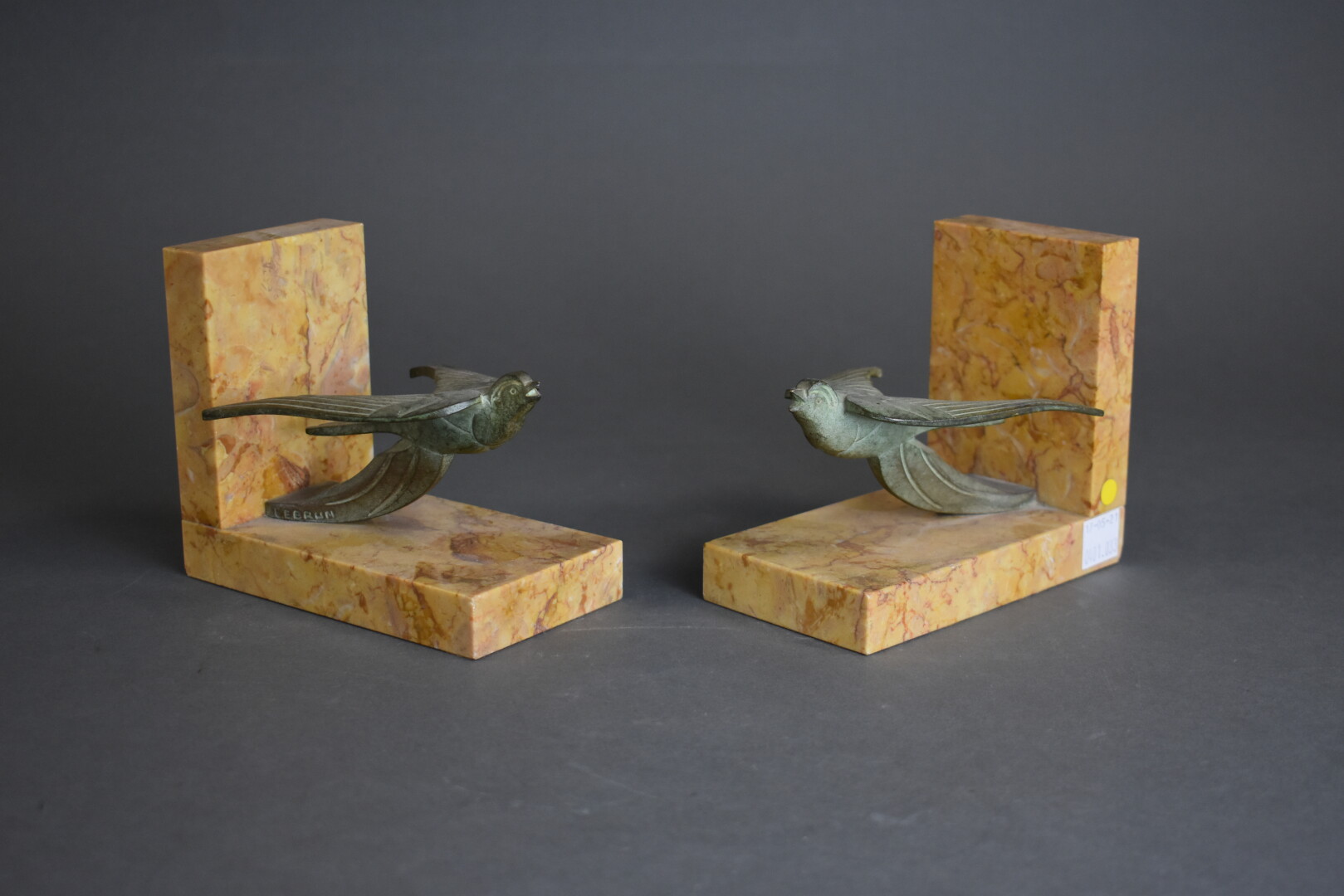 Paire de serre-livres en bronze patiné vert et pierre dure jaune représentant des hirondelles. Signés LEBRUN. Haut. : 11 cm – Larg. : 13 cm – Prof. : 7 cm.