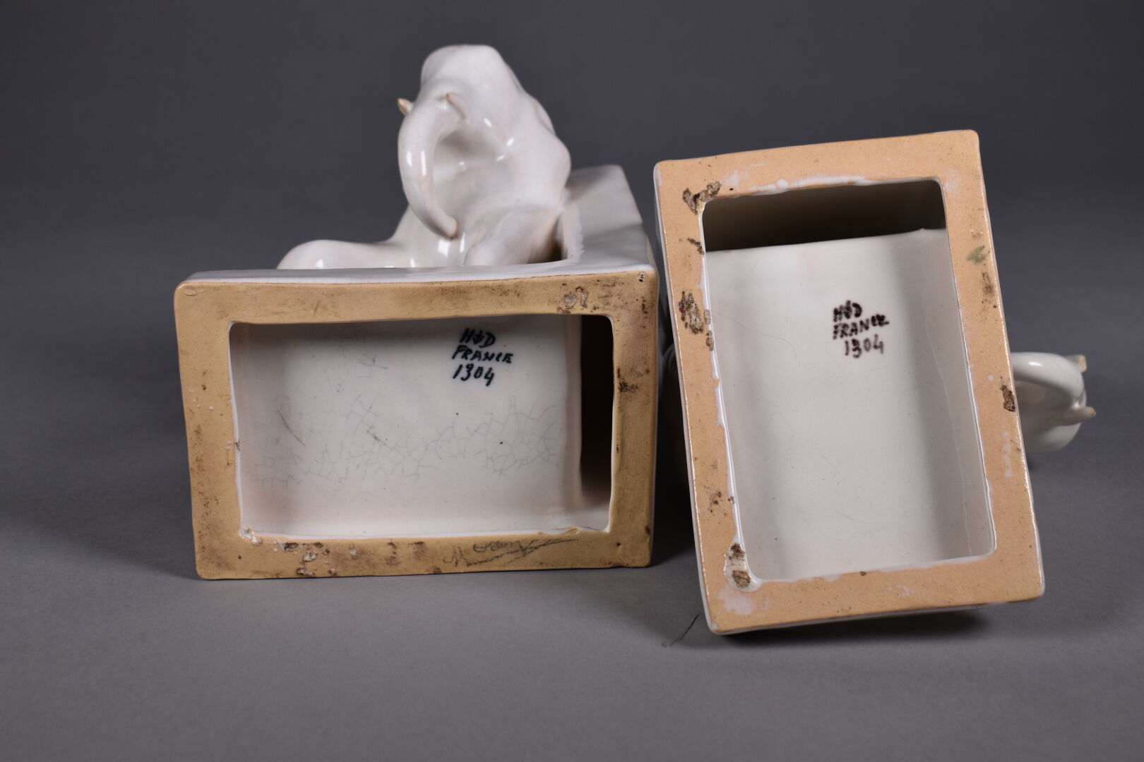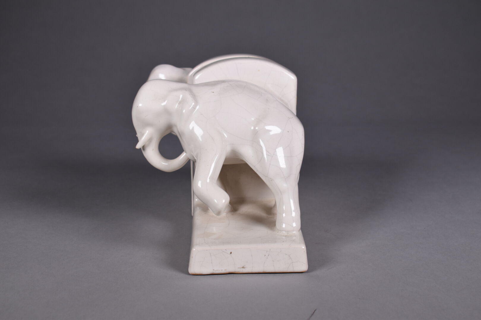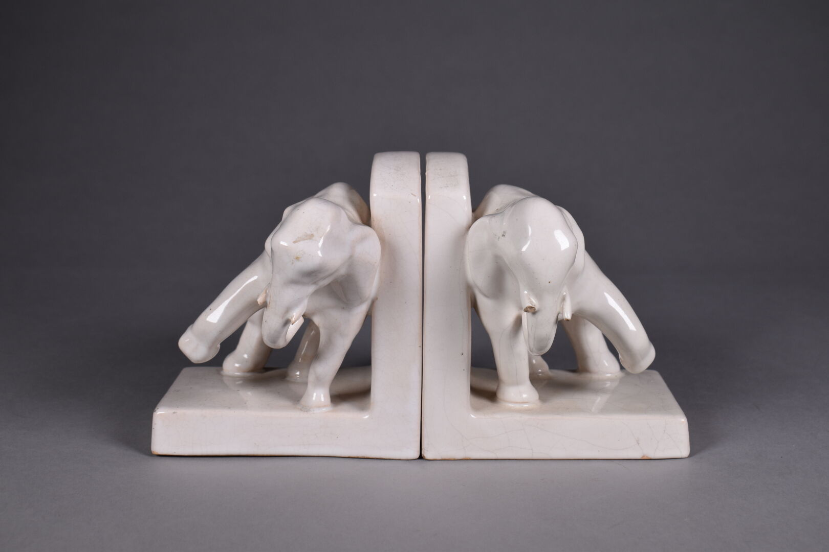 Paire de serre-livres en faïence crème craquelée représentant des éléphants (petits accidents aux défenses). Marque HD France au dessous. Époque Art Déco. Haut. : 15 cm.