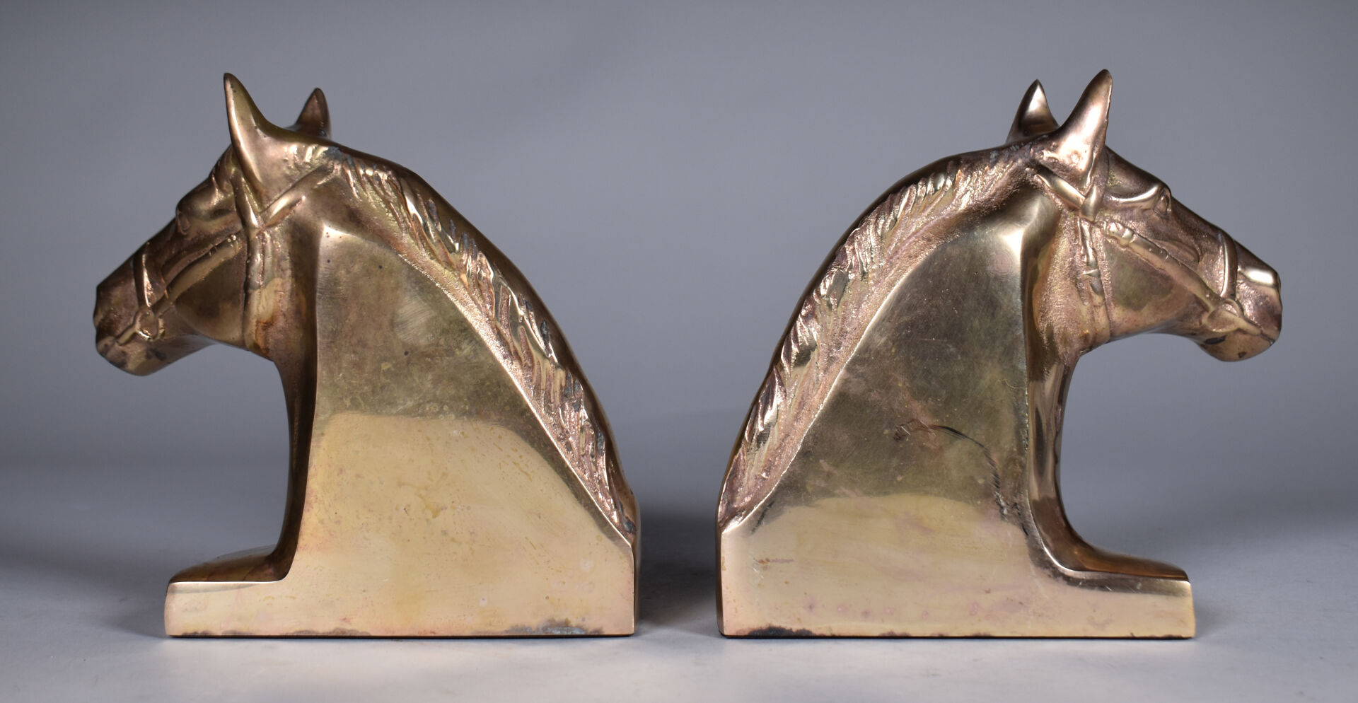 Paire de serre-livres en laiton (?) figurant des têtes de cheval. XXe siècle. Haut. : 16 cm.