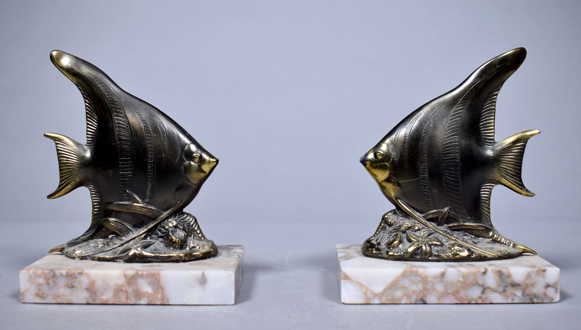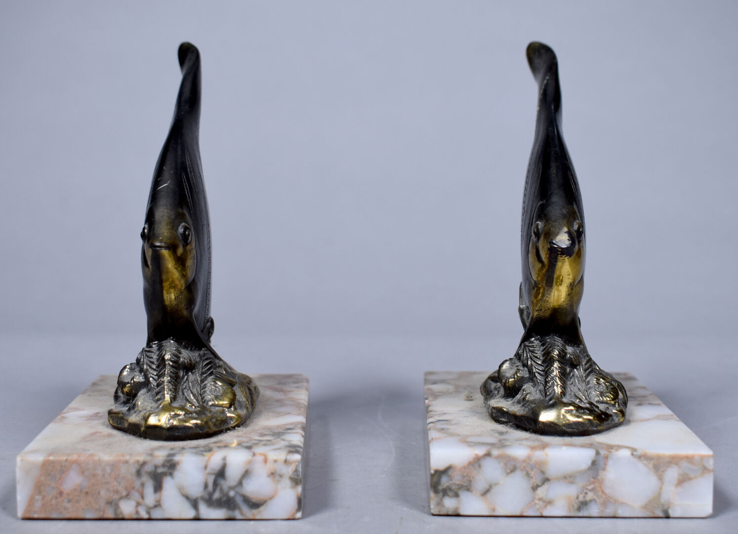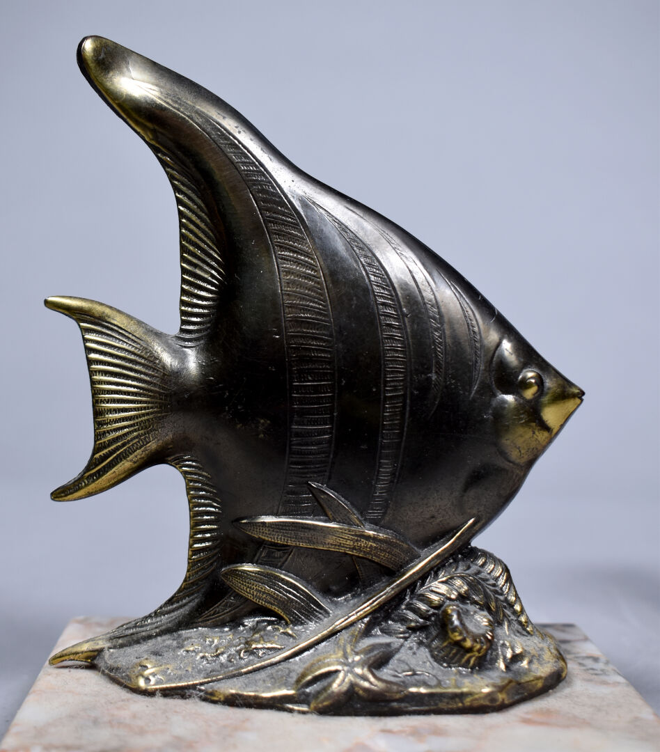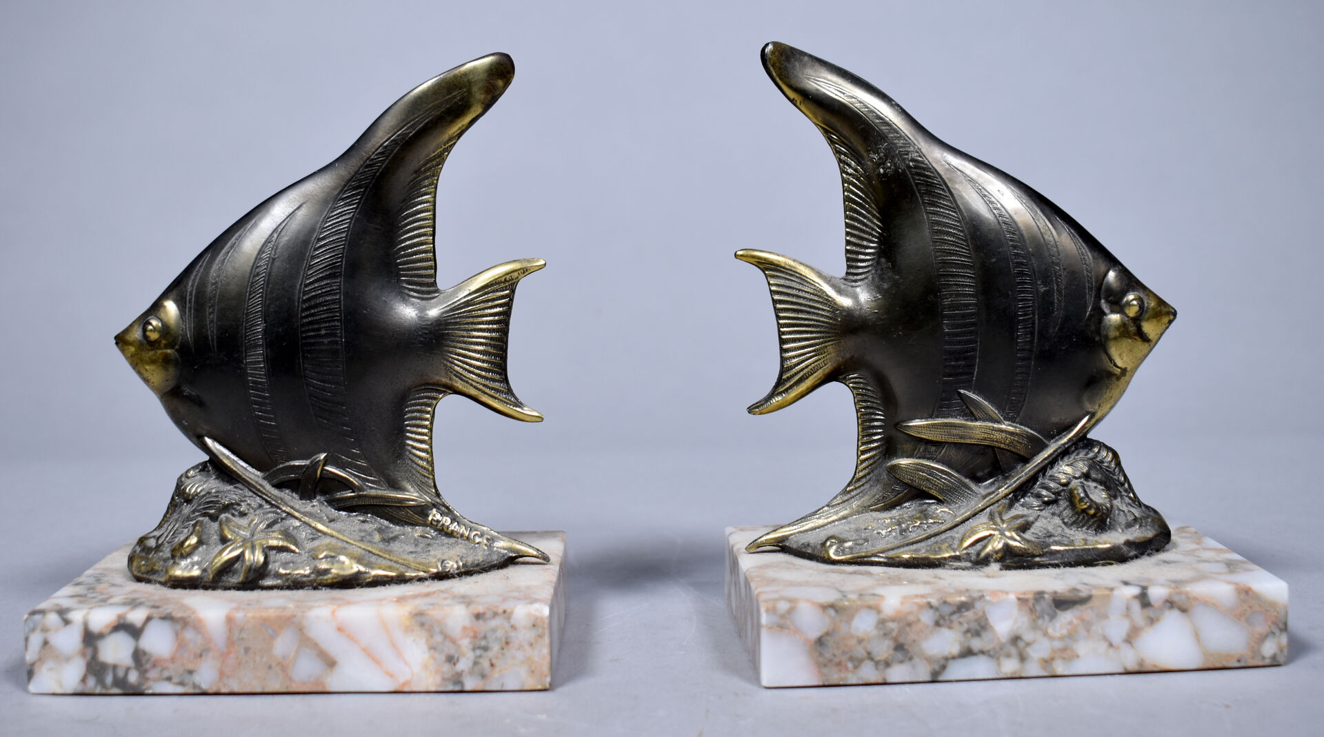 Paire de serre-livres en métal partiellement doré à décor de scalaires, la base en pierre dure beige (usures). Vers 1950. Haut. : 14,5 cm.