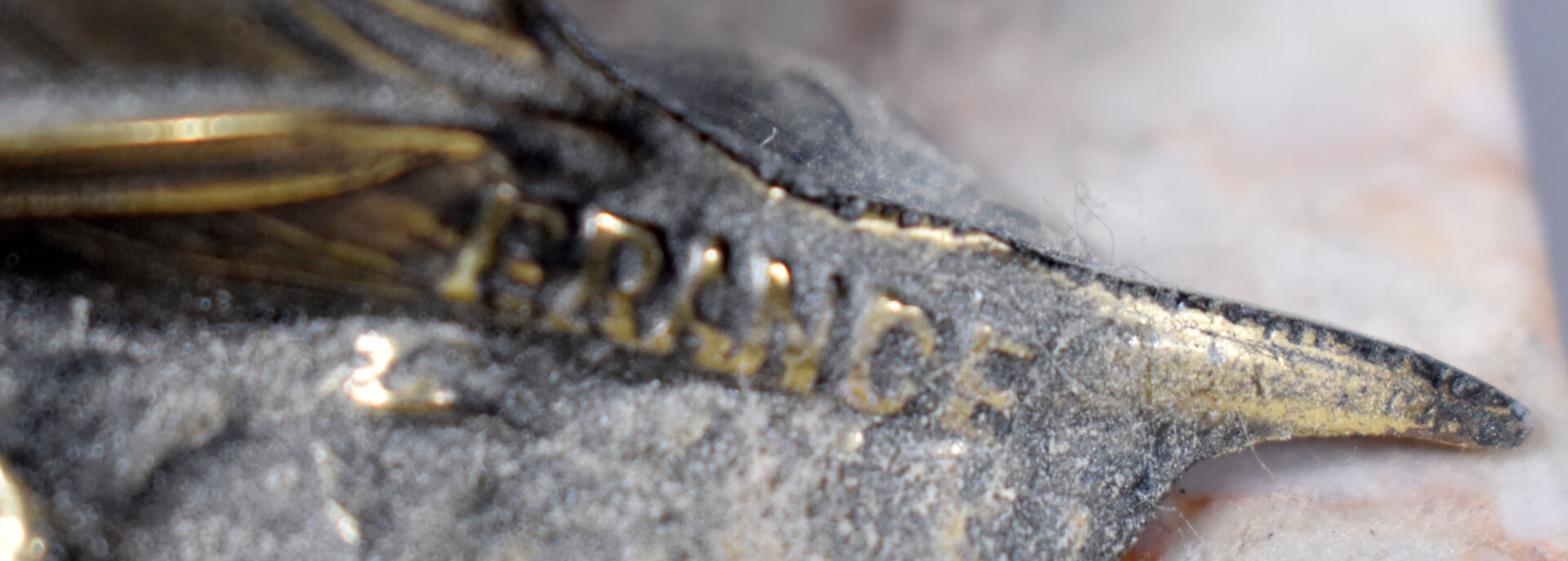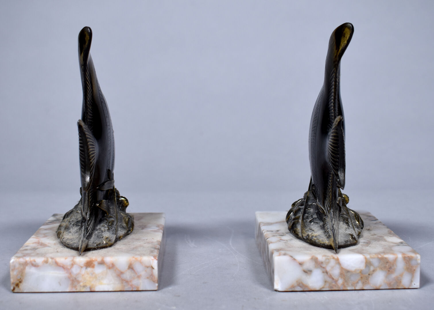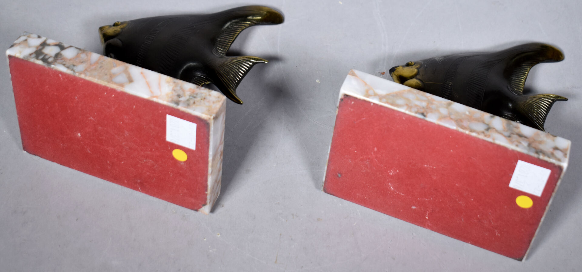 Paire de serre-livres en métal partiellement doré à décor de scalaires, la base en pierre dure beige (usures). Vers 1950. Haut. : 14,5 cm.