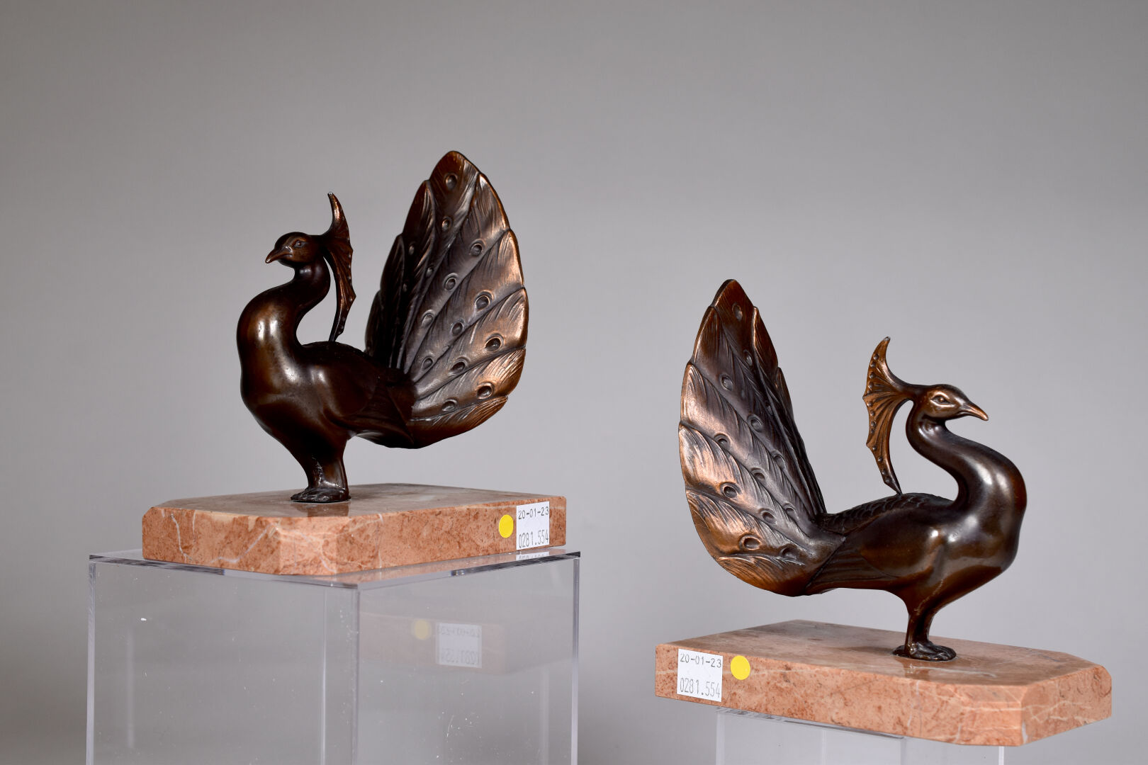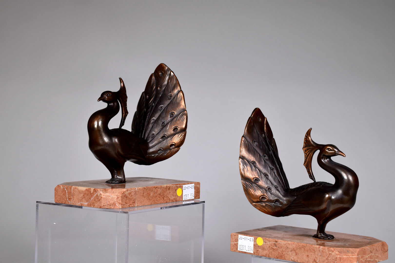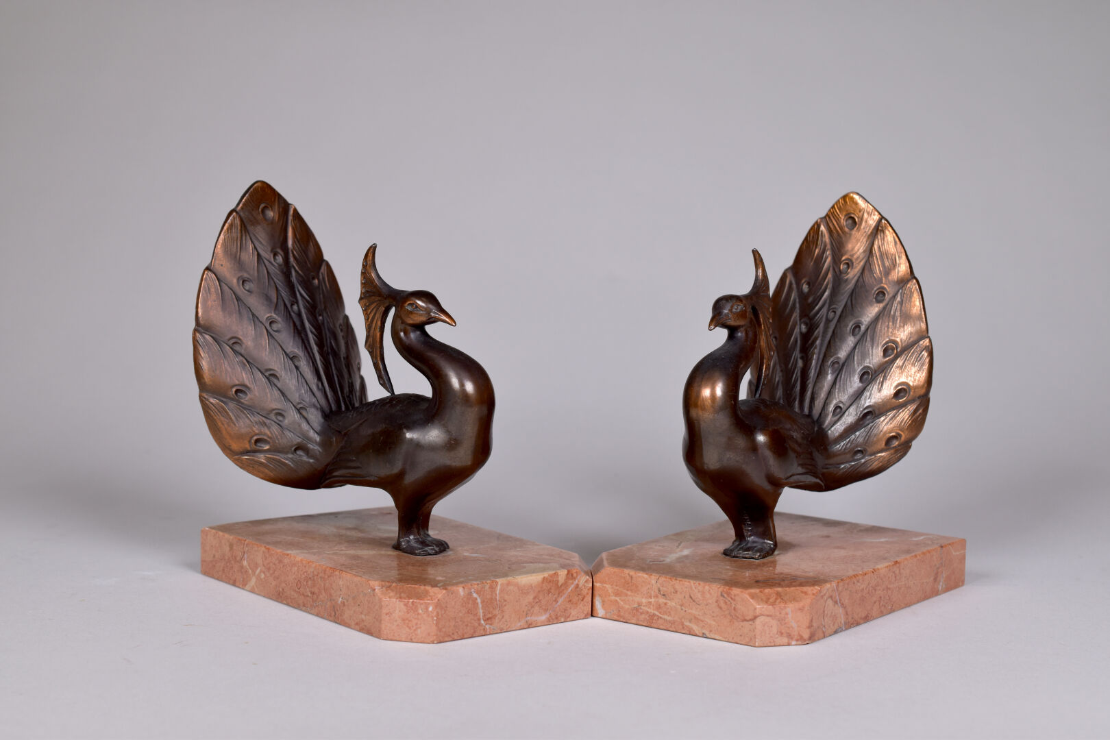 Paire de serre livres en métal patiné médaille figurant des paons (à refixer). Base en pierre dure rose. Haut. : 15 cm