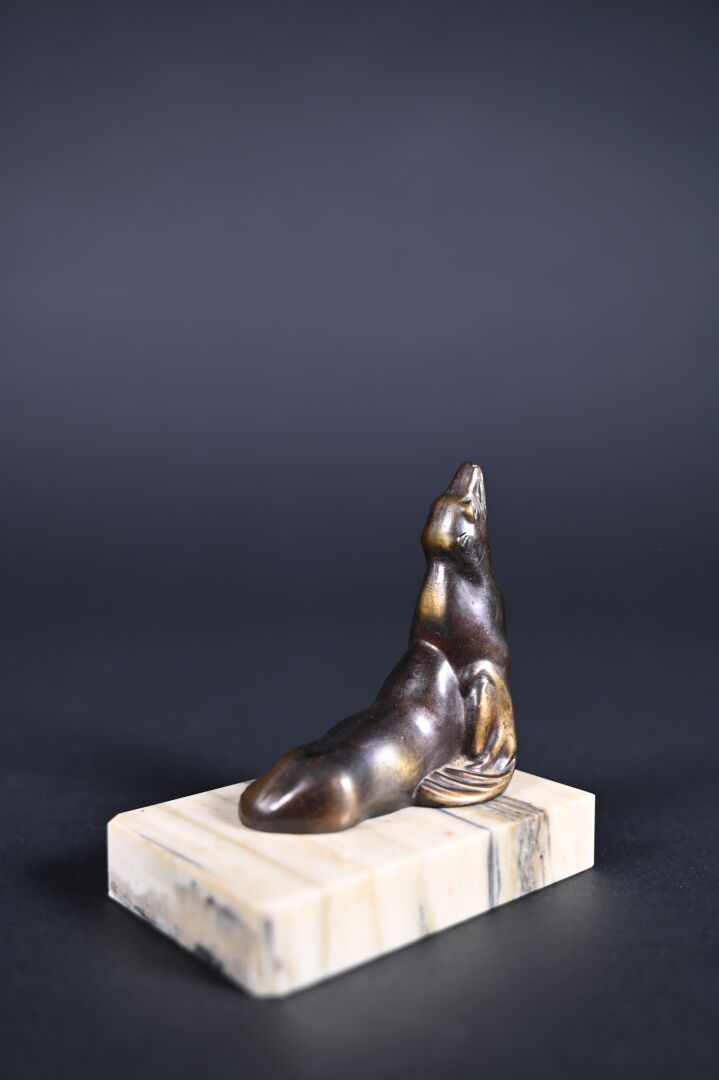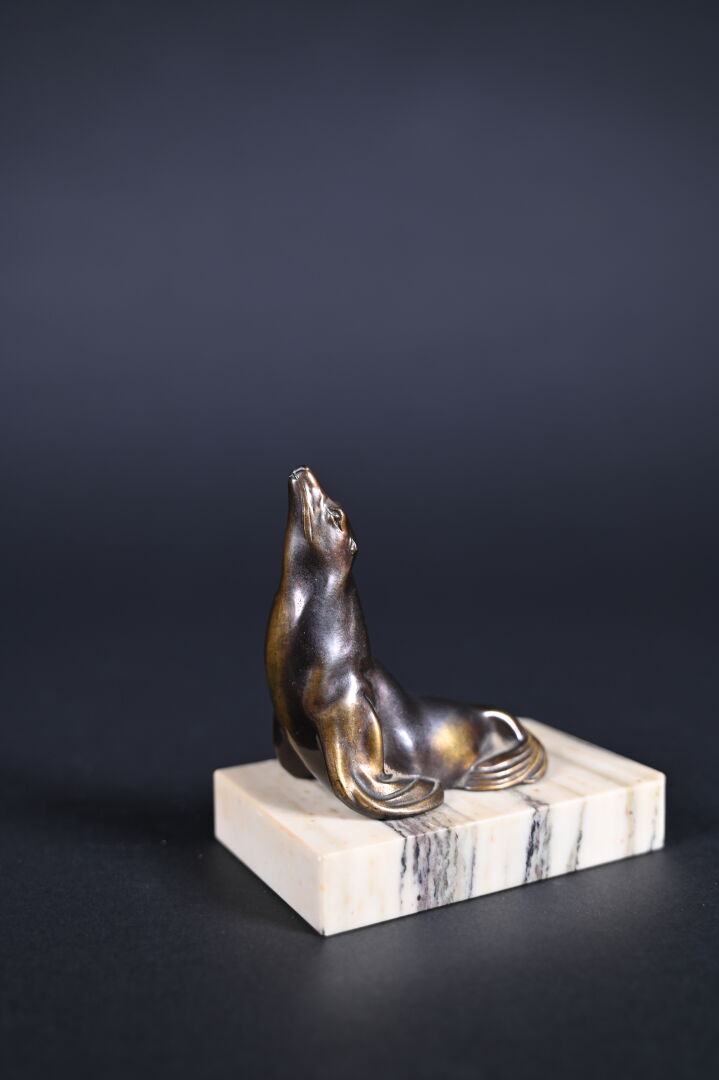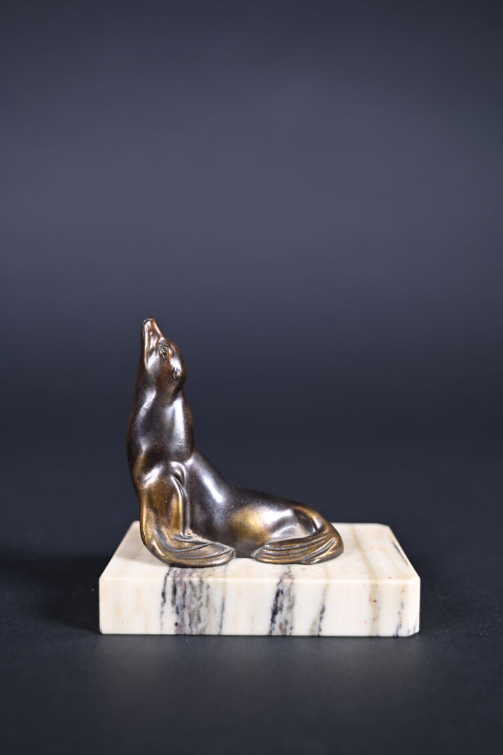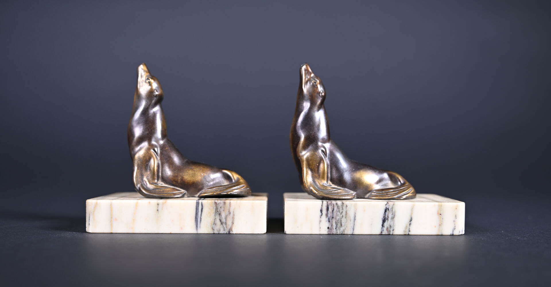 Paire de serre-livres en régule patiné brun or représentant des otaries. Les socles en marbre blanc. Epoque Art déco. Haut. : 11 cm – Larg. : 11 cm – Prof. : 7 cm.