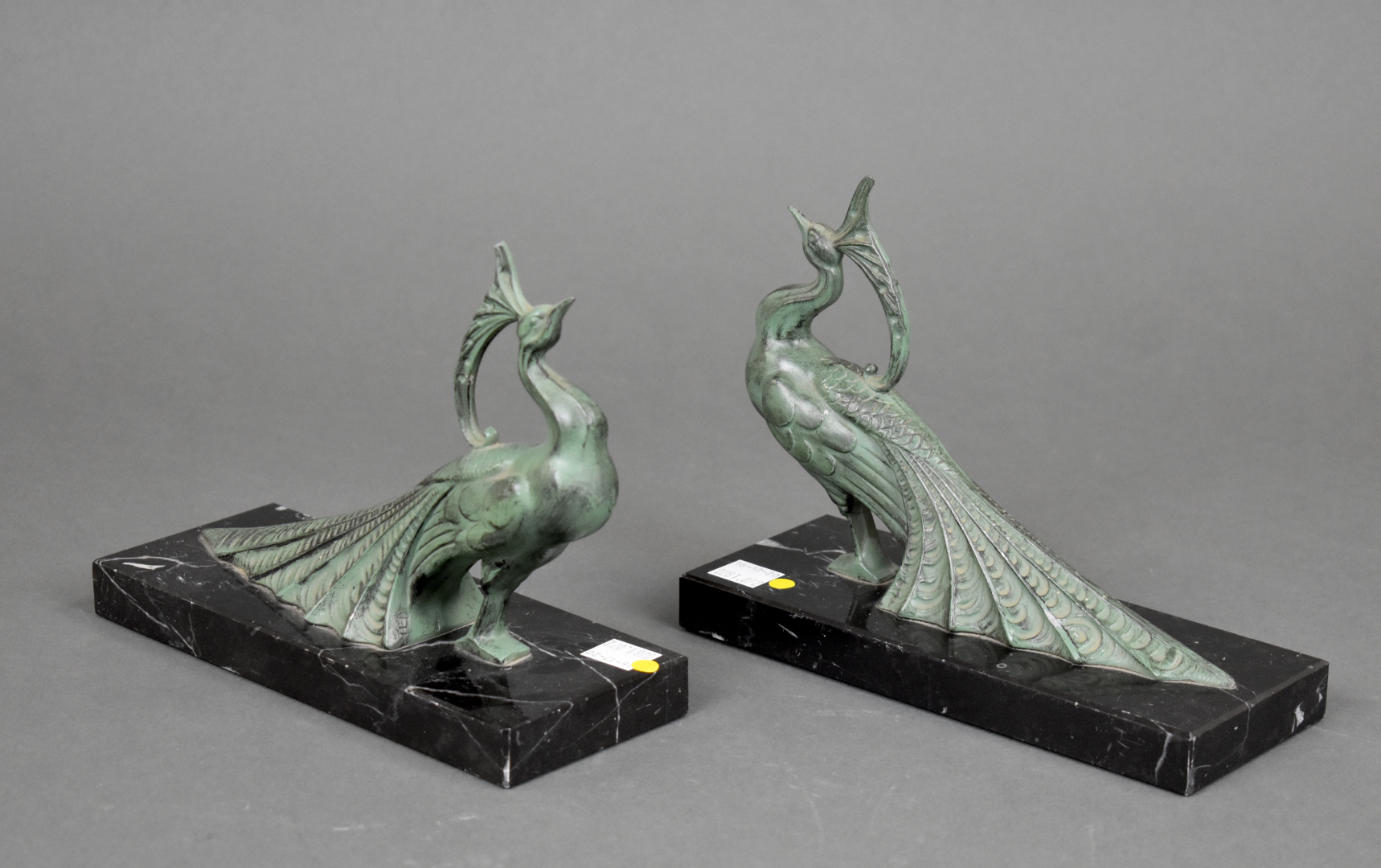 Paire de serre-livres en régule patiné vert figurant des paons. Socle de marbrenoir veiné blanc. Haut. : 16 cm – Larg. : 20 cm – Prof. : 8 cm.