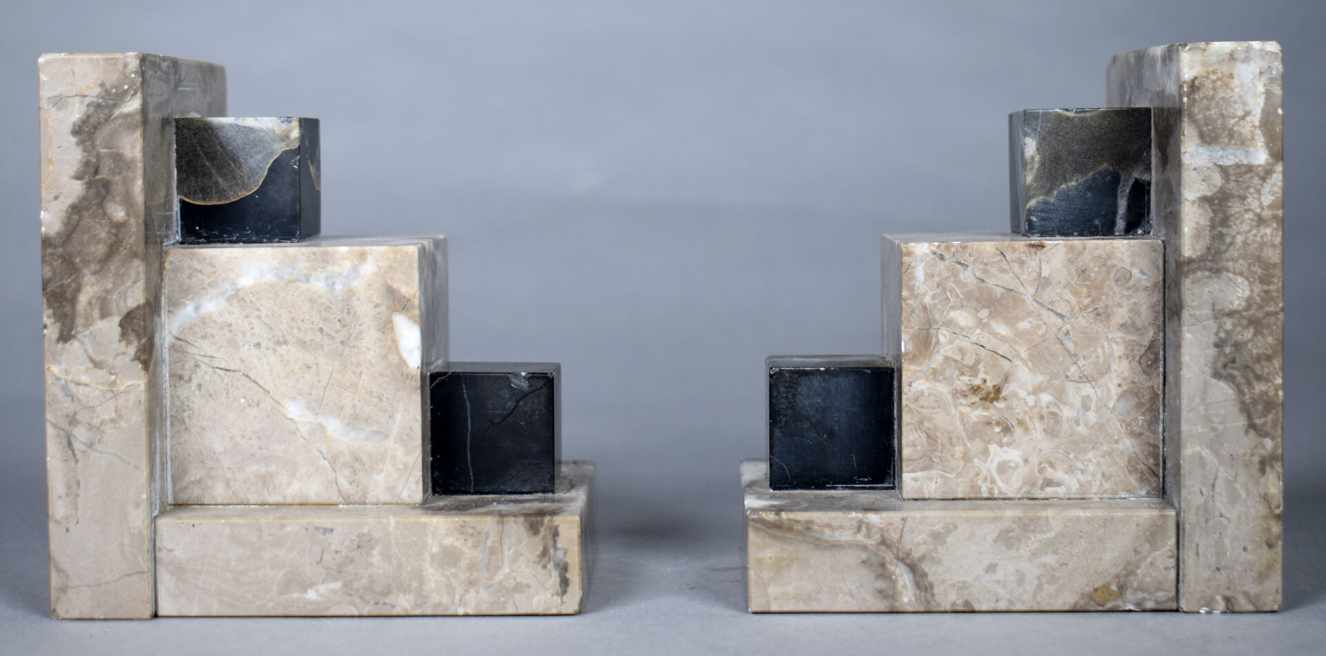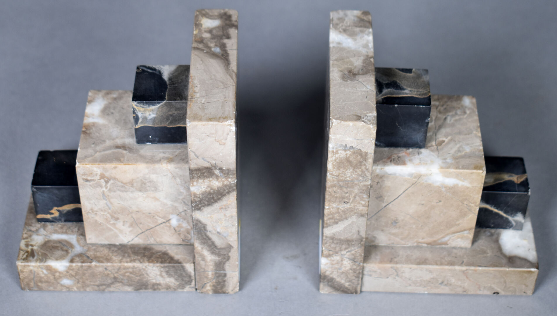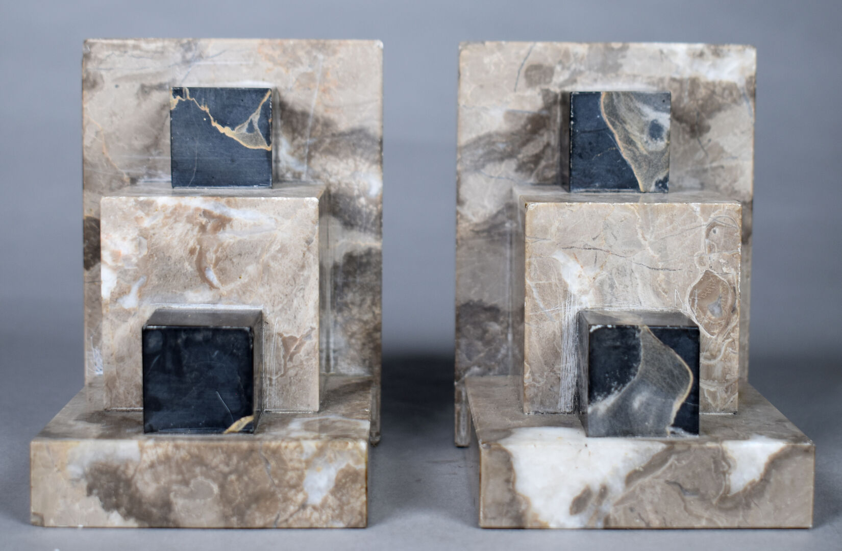 Paire de serre livres géométriques en marbre gris et marbre portor (égrenures et éclats). Époque Art Déco. Haut. : 11 cm.