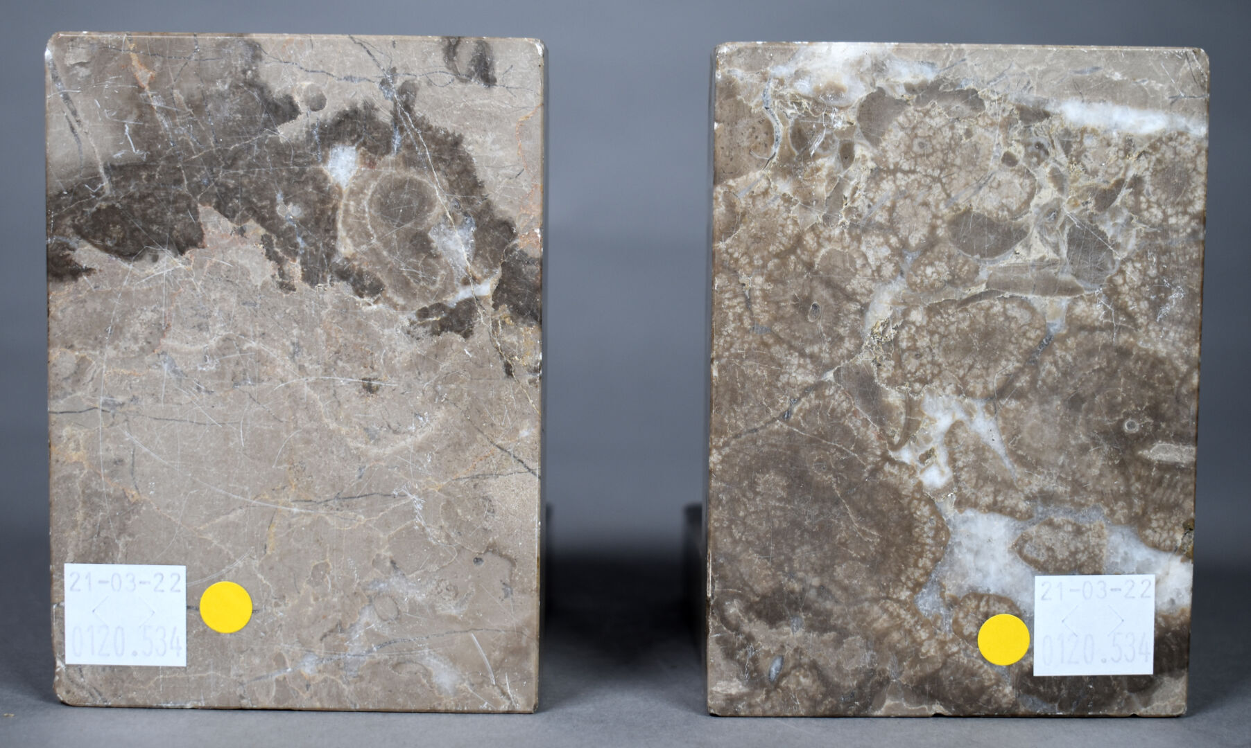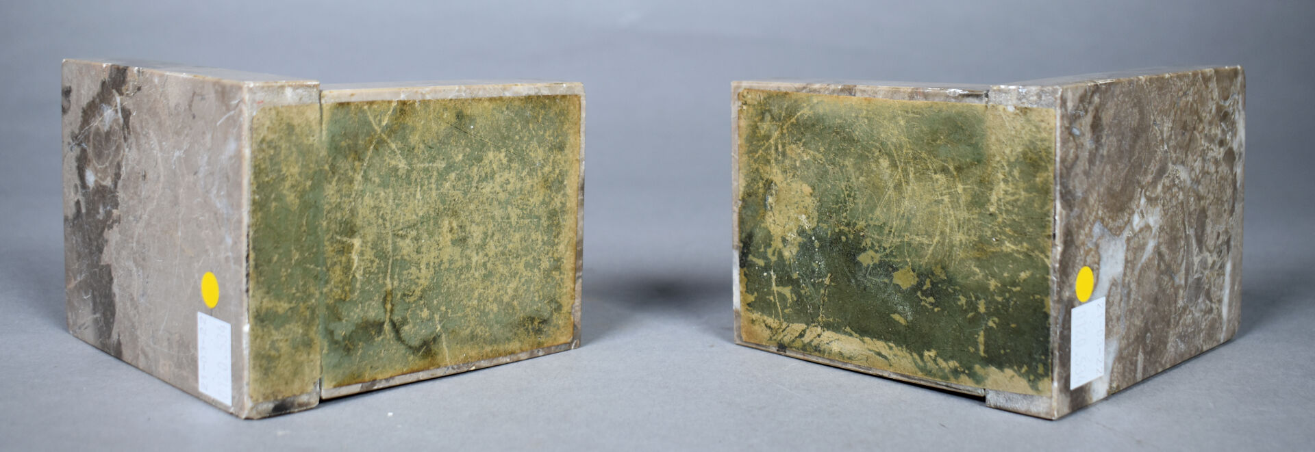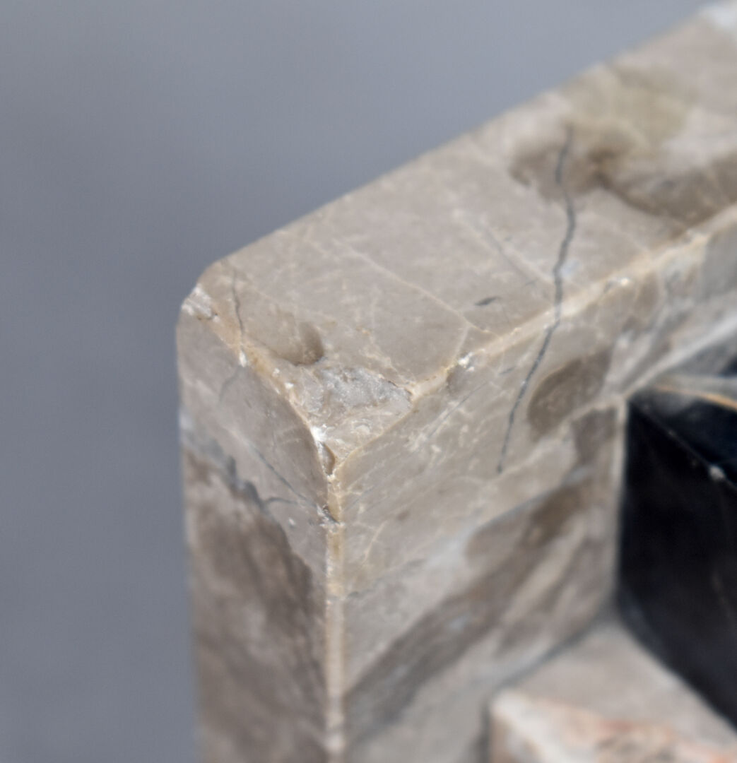 Paire de serre livres géométriques en marbre gris et marbre portor (égrenures et éclats). Époque Art Déco. Haut. : 11 cm.