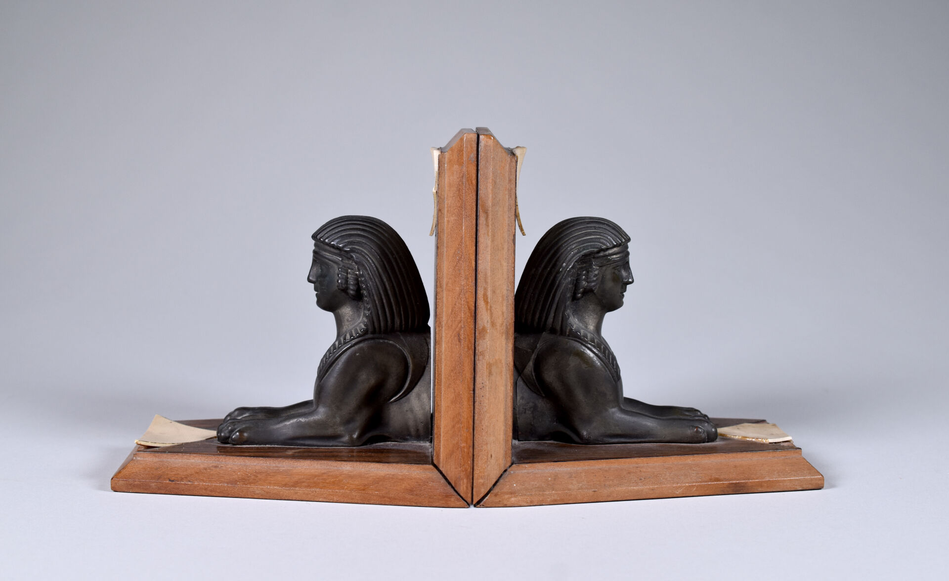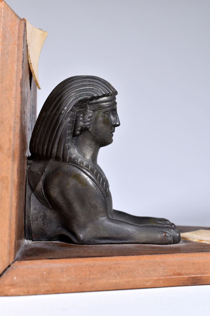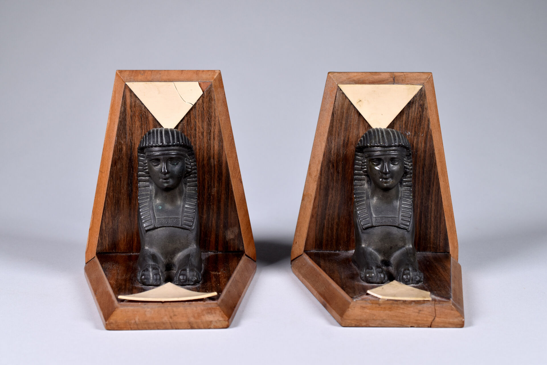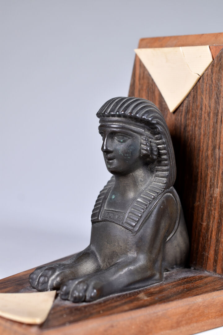 Paire de serre-livres ornés de sphinges en bronze patiné brun, les socles en noyer, palissandre et ivoirine (éclats, soulèvements, manques, restaurations). Vers 1930. Haut. : 16 cm.
