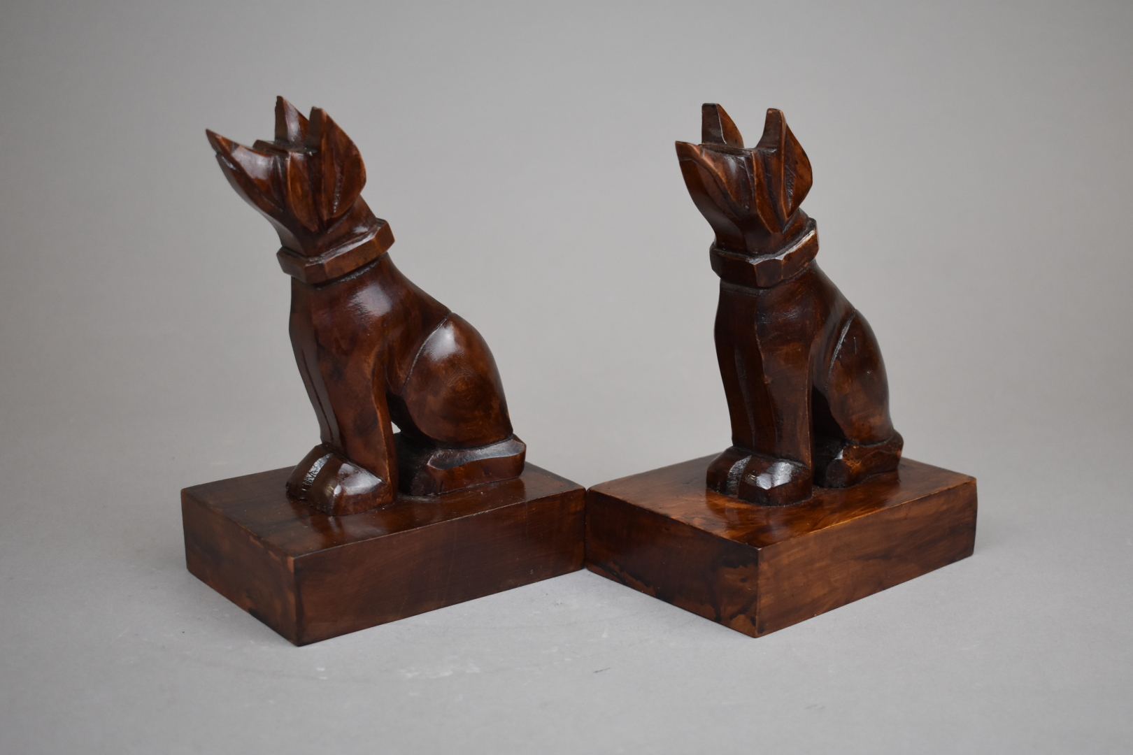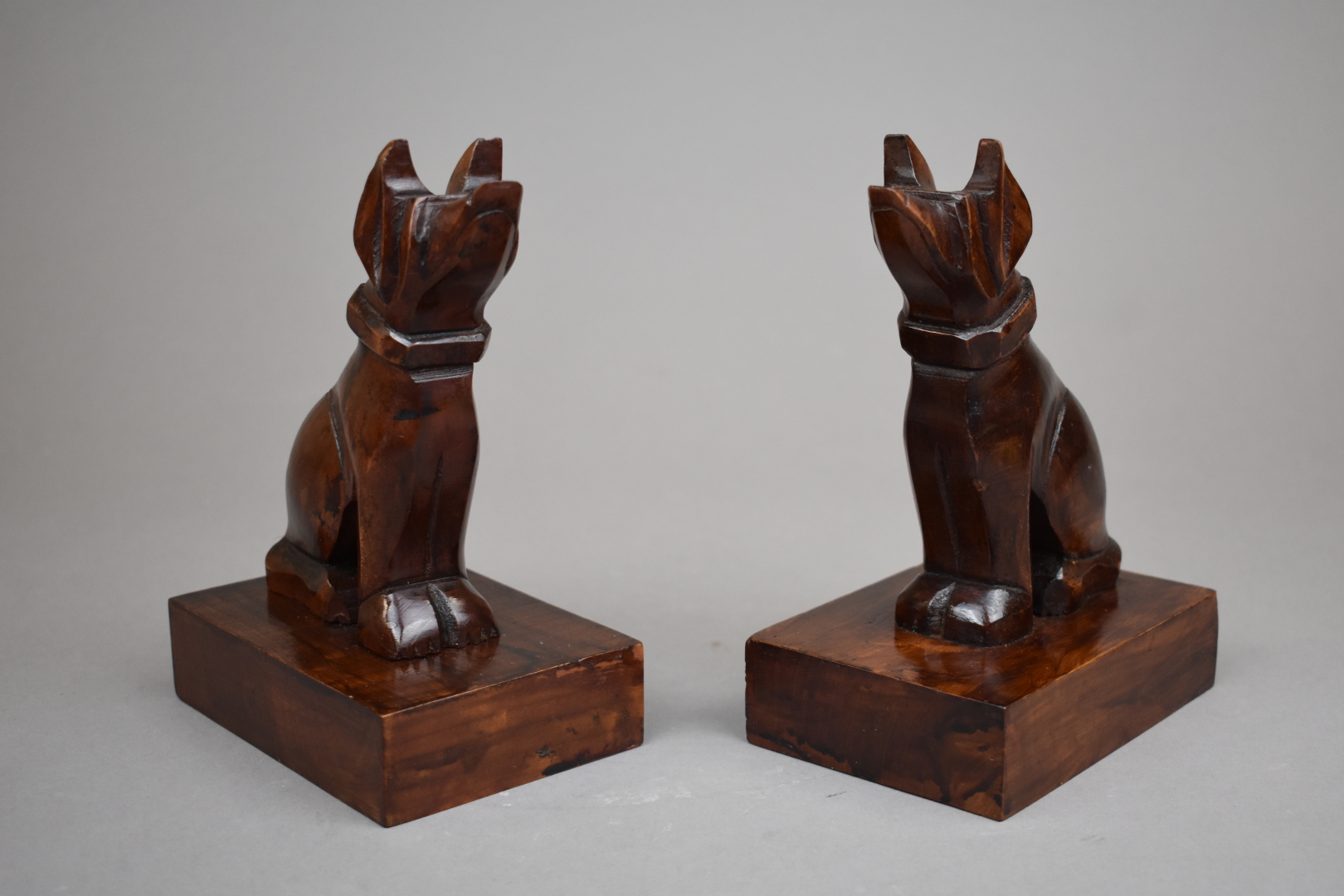 Paire de serres livres en bois sculpté et teinté représentant des chiens assis. Haut. : 18 cm.