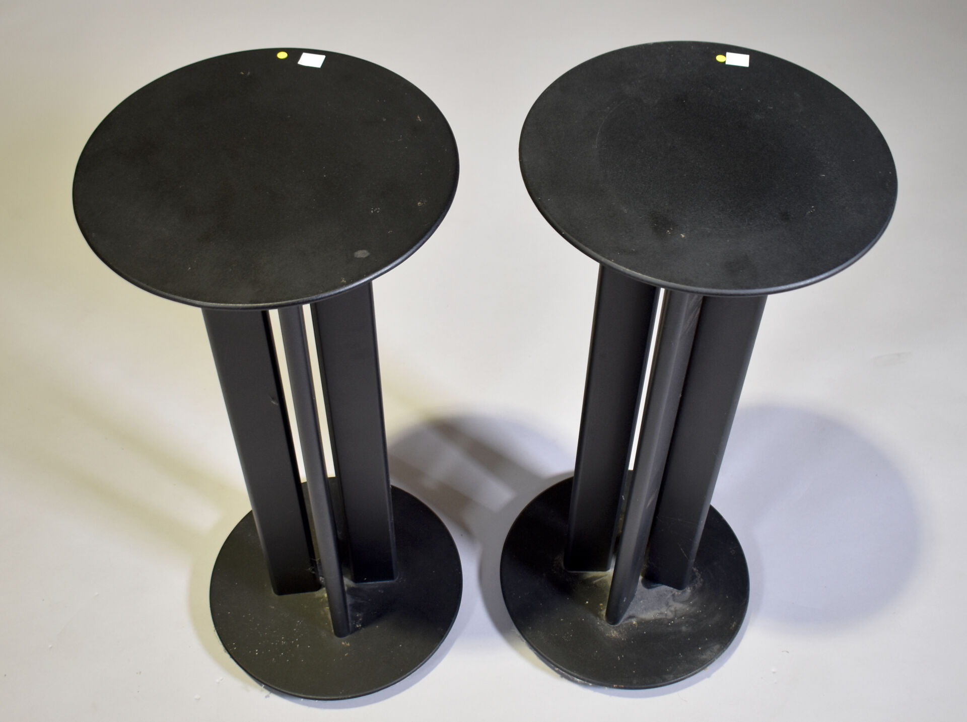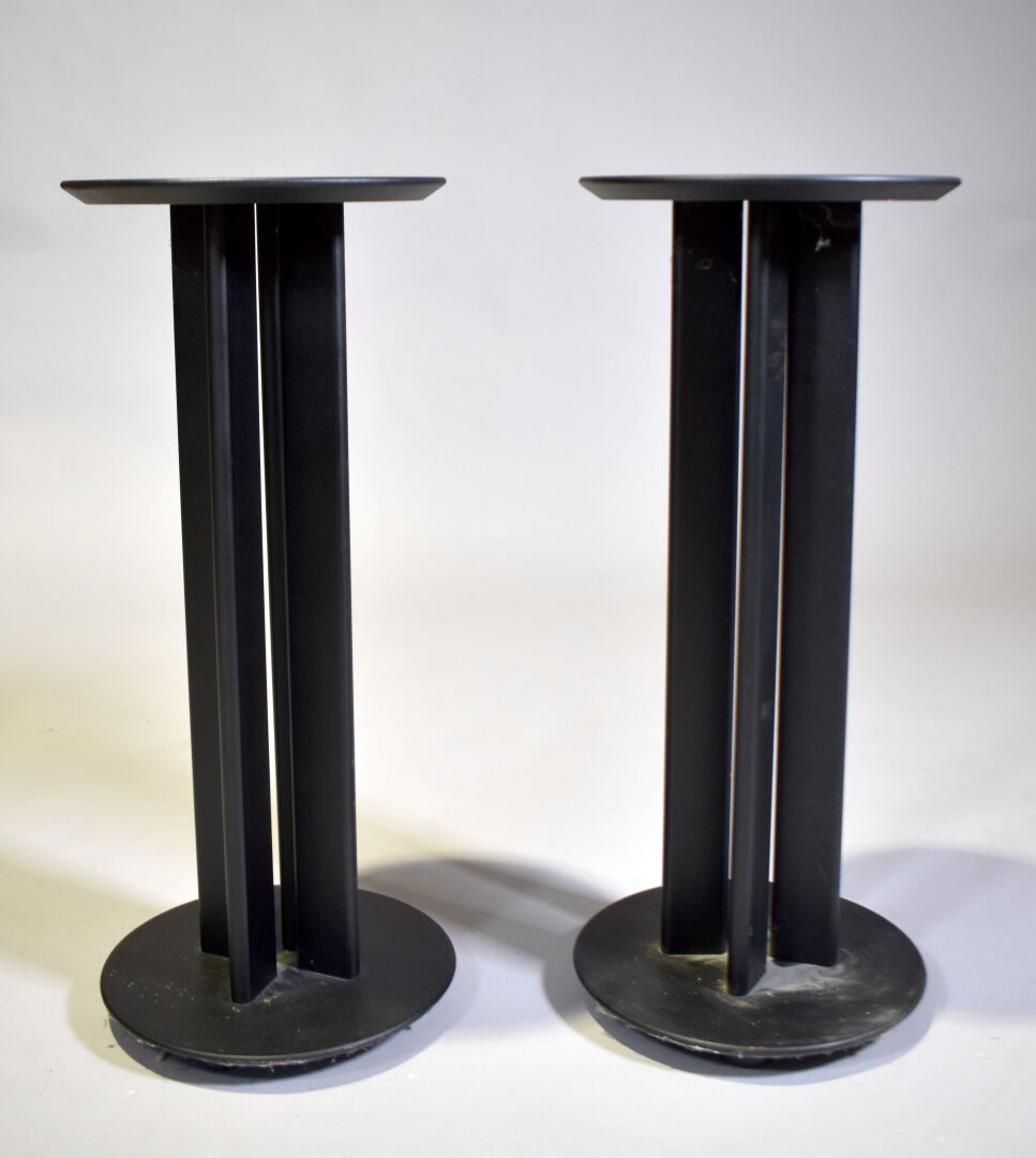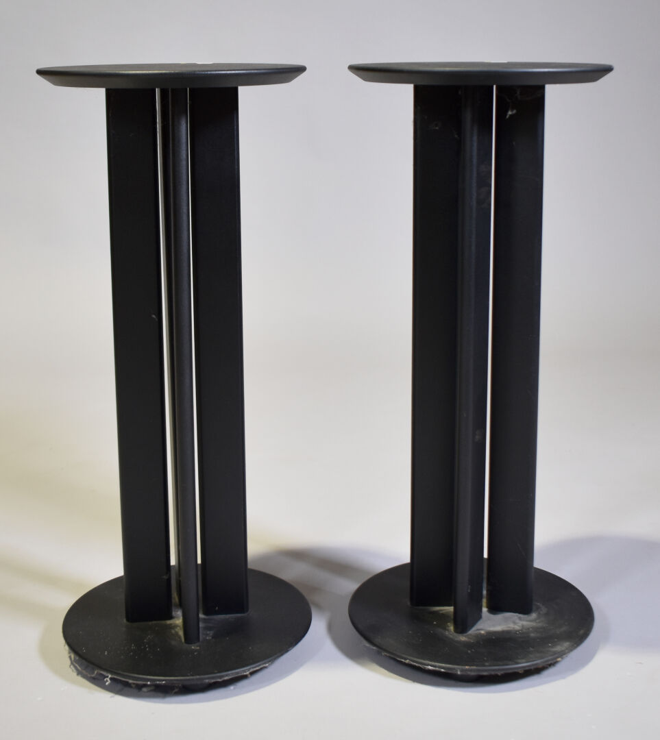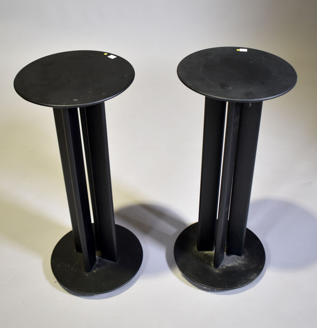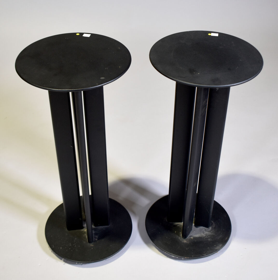 Paire de socles pour enceintes en plastique noir. Haut. : 71 cm – Diam. : 31 cm.