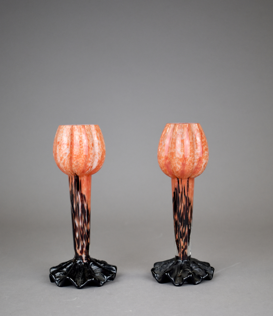 Paire de soliflores en verre marmoréen orange et noir, la base dentelée (un fêle). Vers 1900. Haut. : 19 cm.