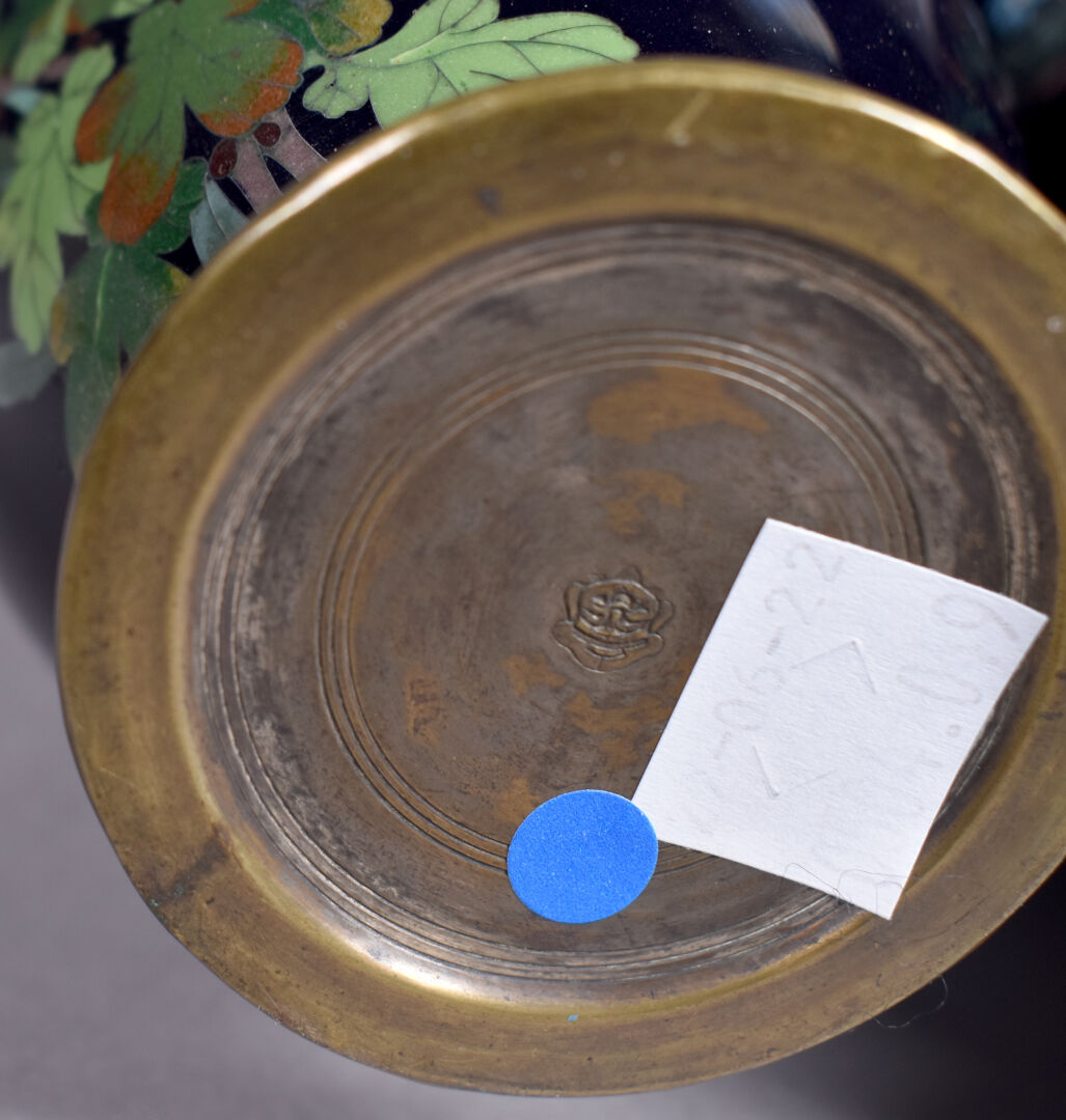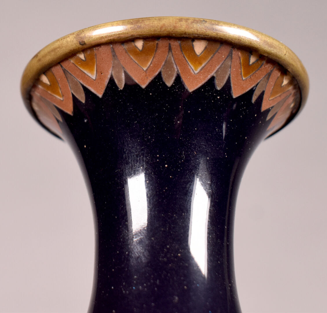 Paire de vase balustres à décor en polychromie de grues parmi les fleurs en émaux cloisonnés sur fond bleu nuit (quelques rayures). Japon, vers 1880 – 1900. Haut. : 31 cm.