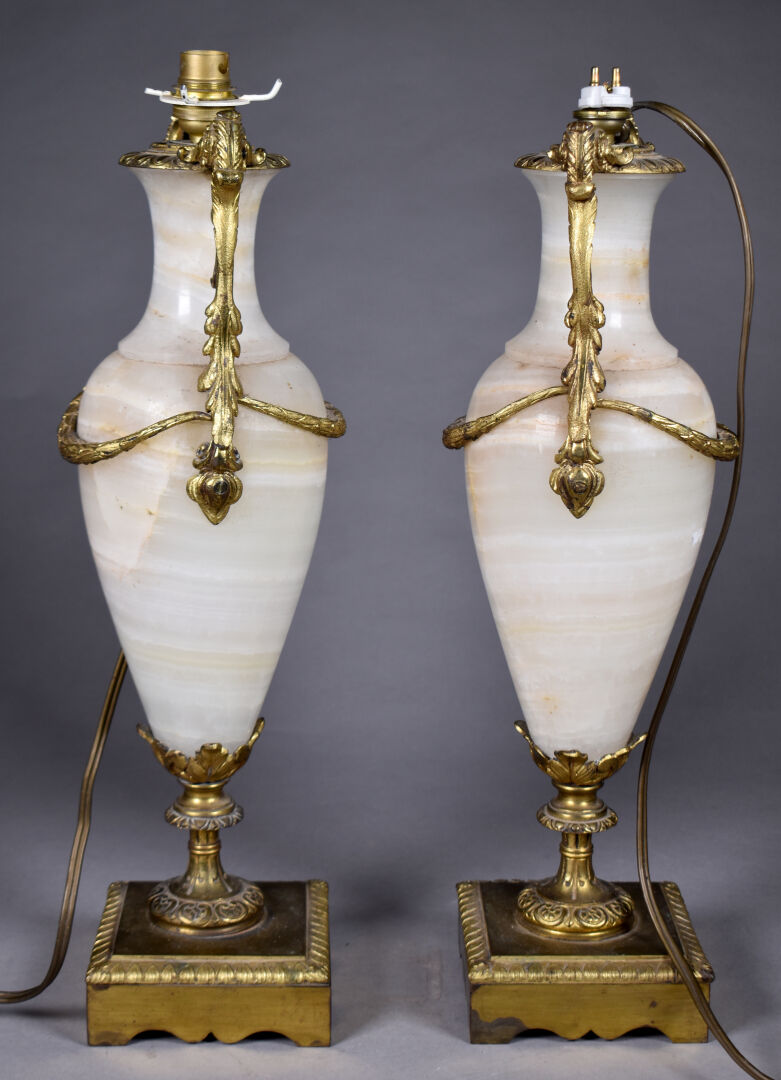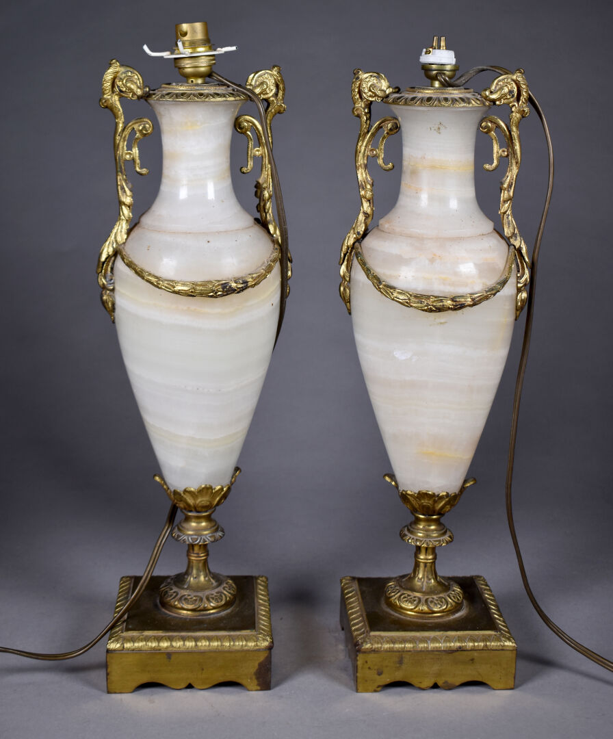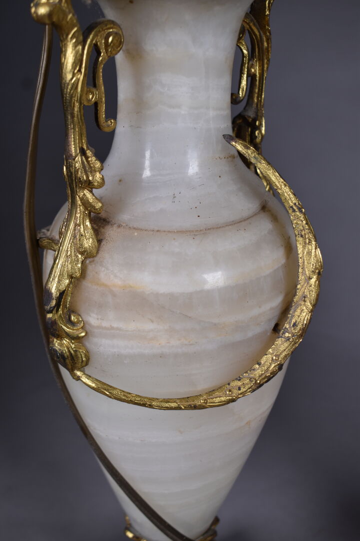 Paire de vases balustre en albâtre, la monture en métal doré. Montés en lampe électrifiées (une guirlande à refixer, à refixer). Haut. : 46 cm.