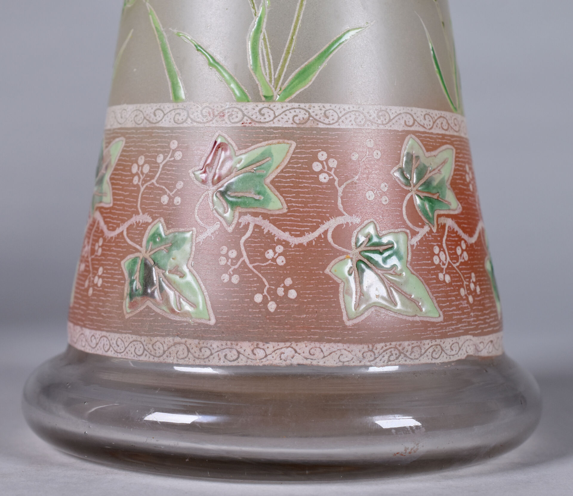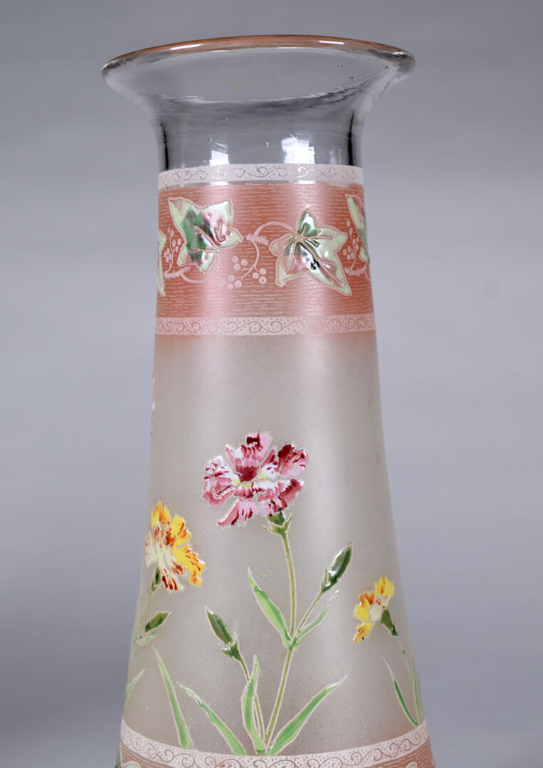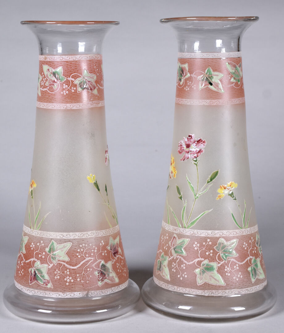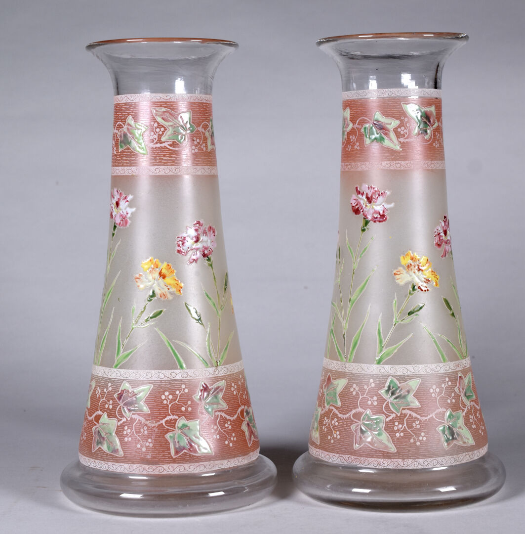 Paire de vases cornet en verre à décor émaillé en polychromie d’oeillets et bandeaux de lierre sur fond orange. Vers 1900. Haut. : 27,5 cm.