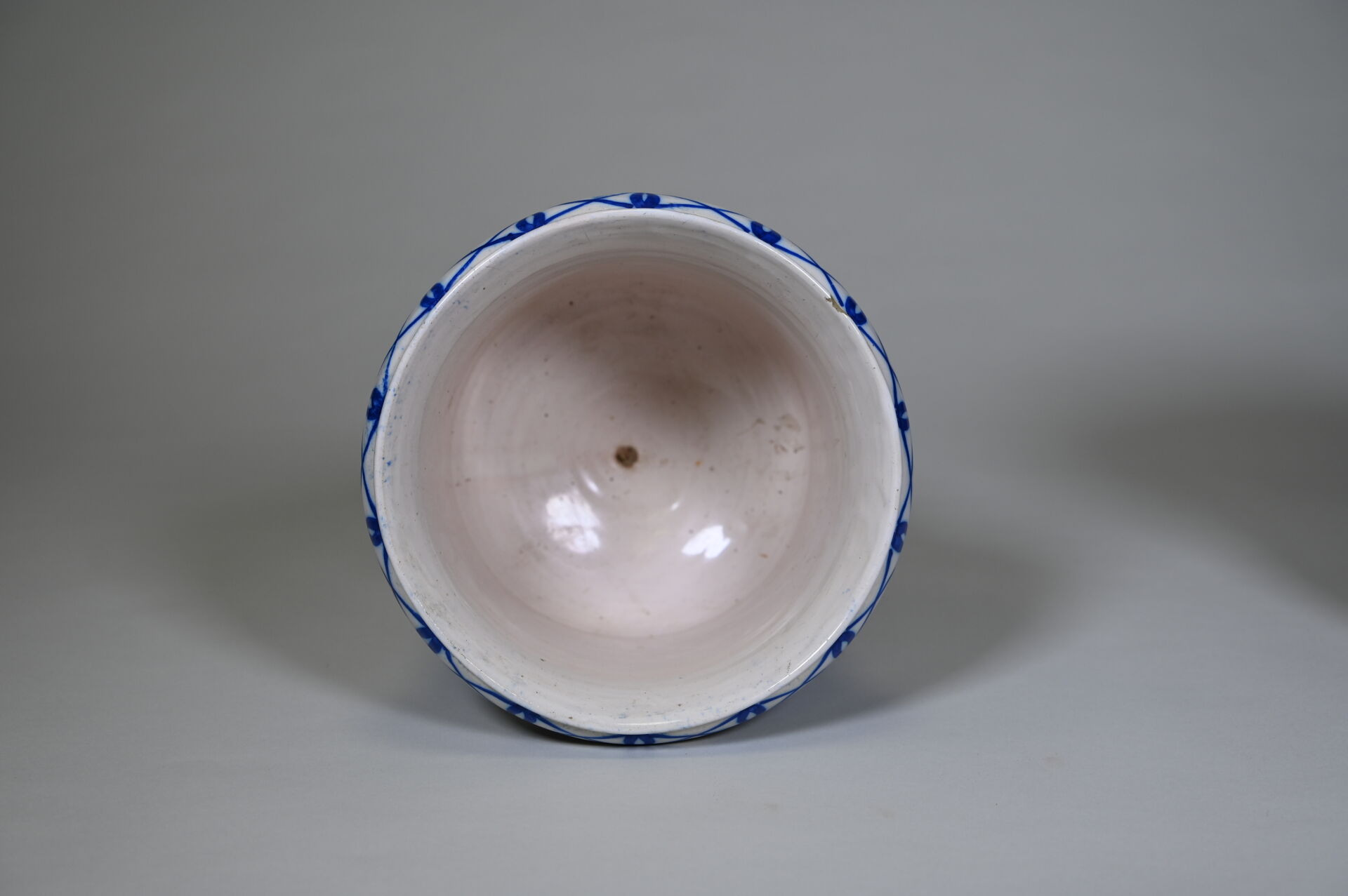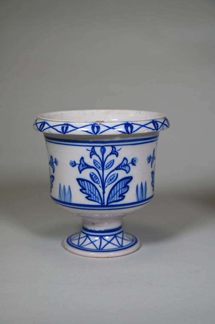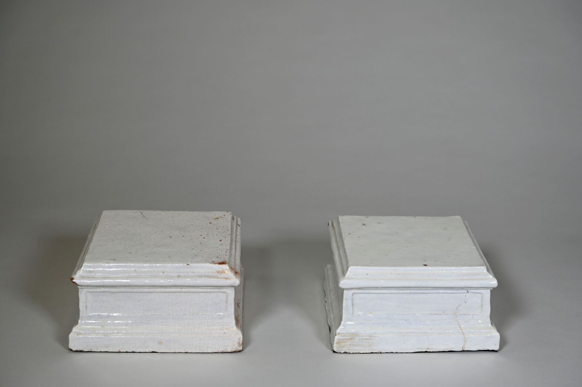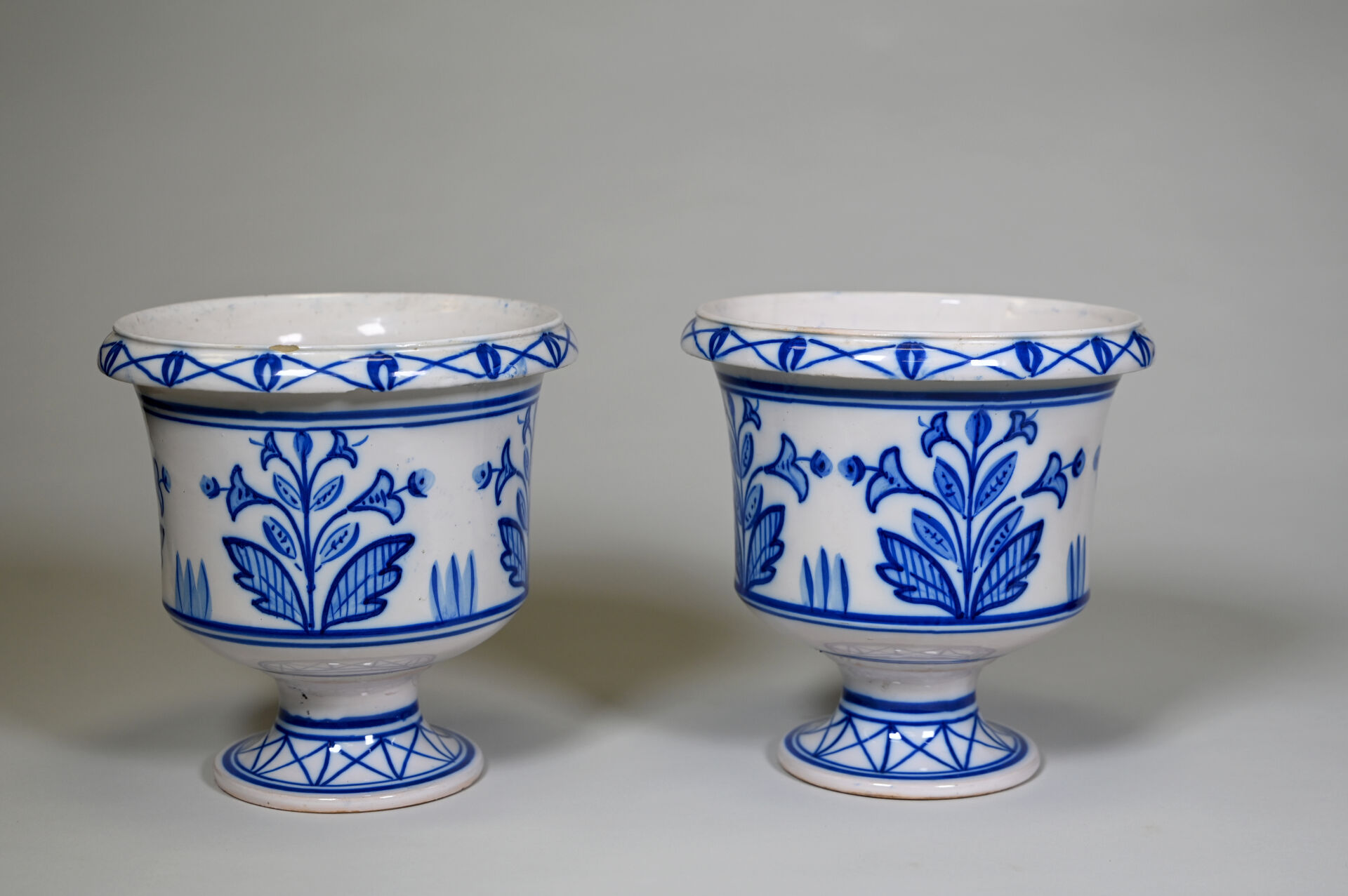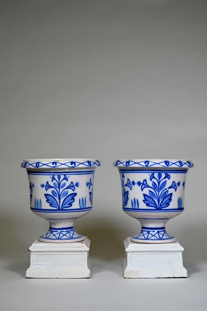 Paire de vases décoratifs « Médicis » sur piédouche en faïence à décor en bleu sous couverte (un pied accidenté). Époque fin XIXème début XXème. Haut. : 24,5 cm. On joint deux socles en terre cuite émaillée crème, non réalisés pour ces pièces.