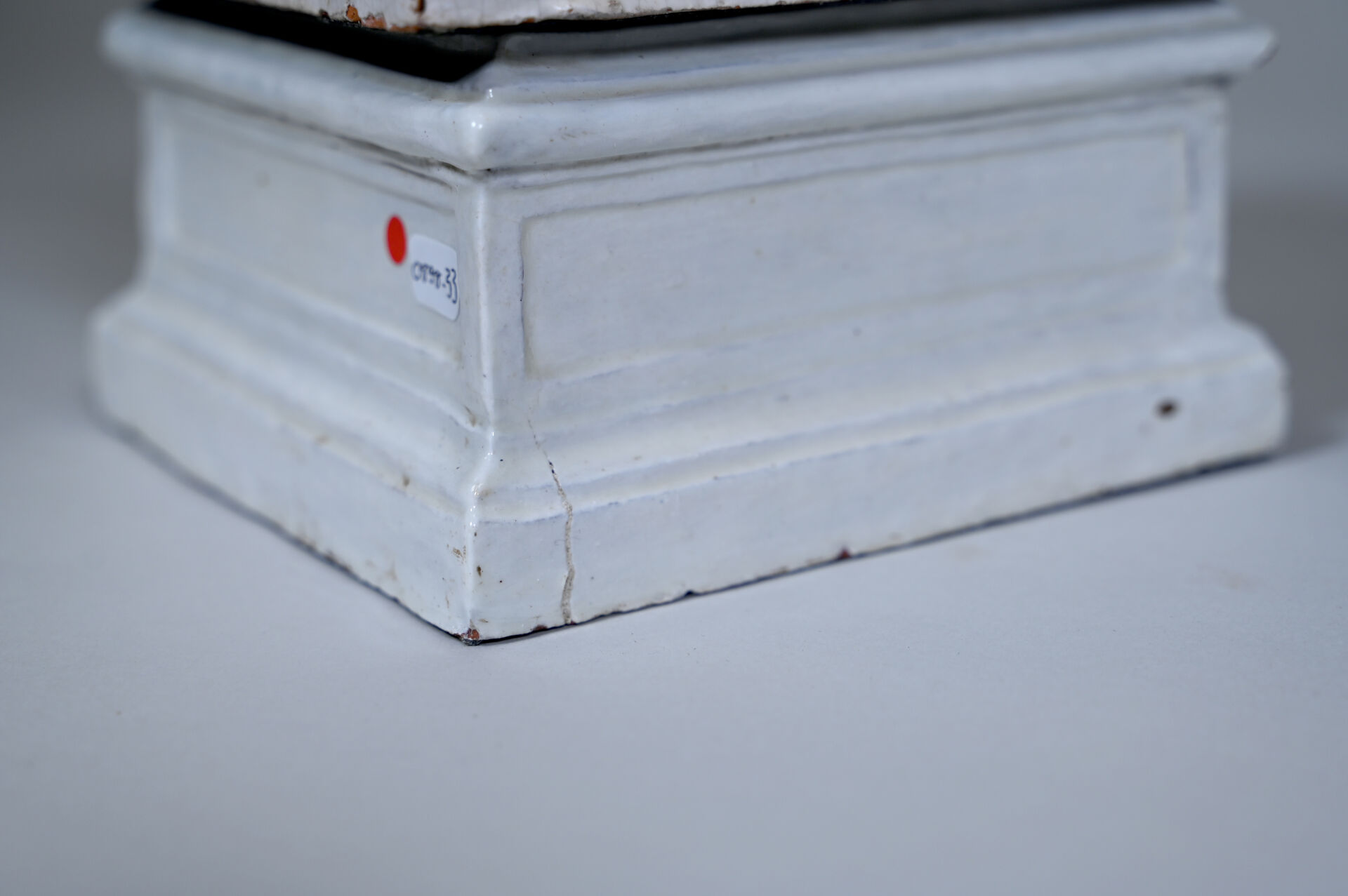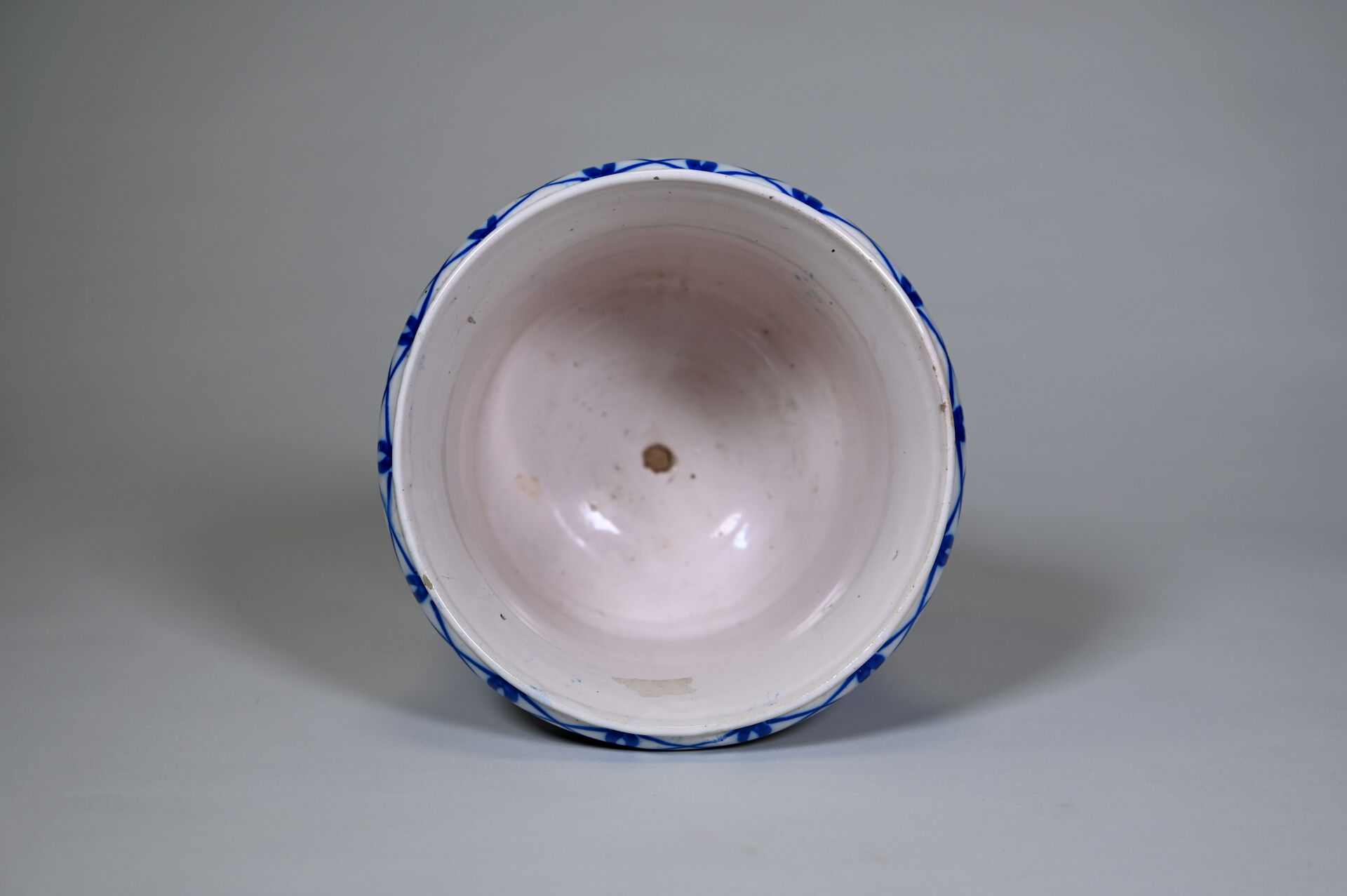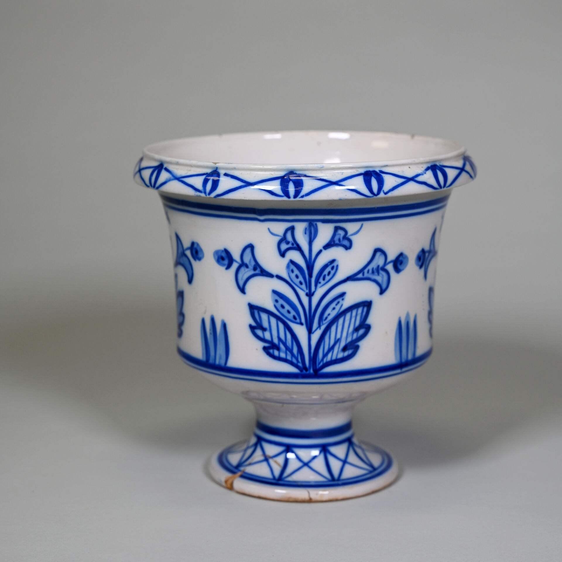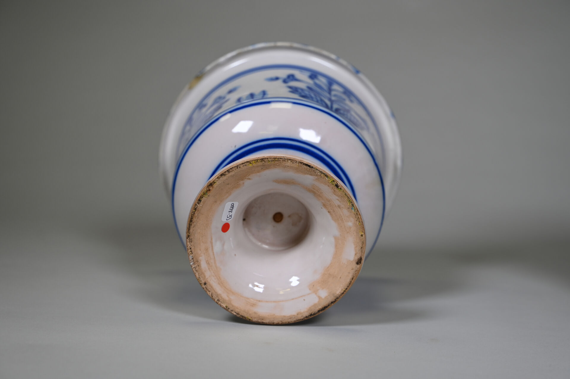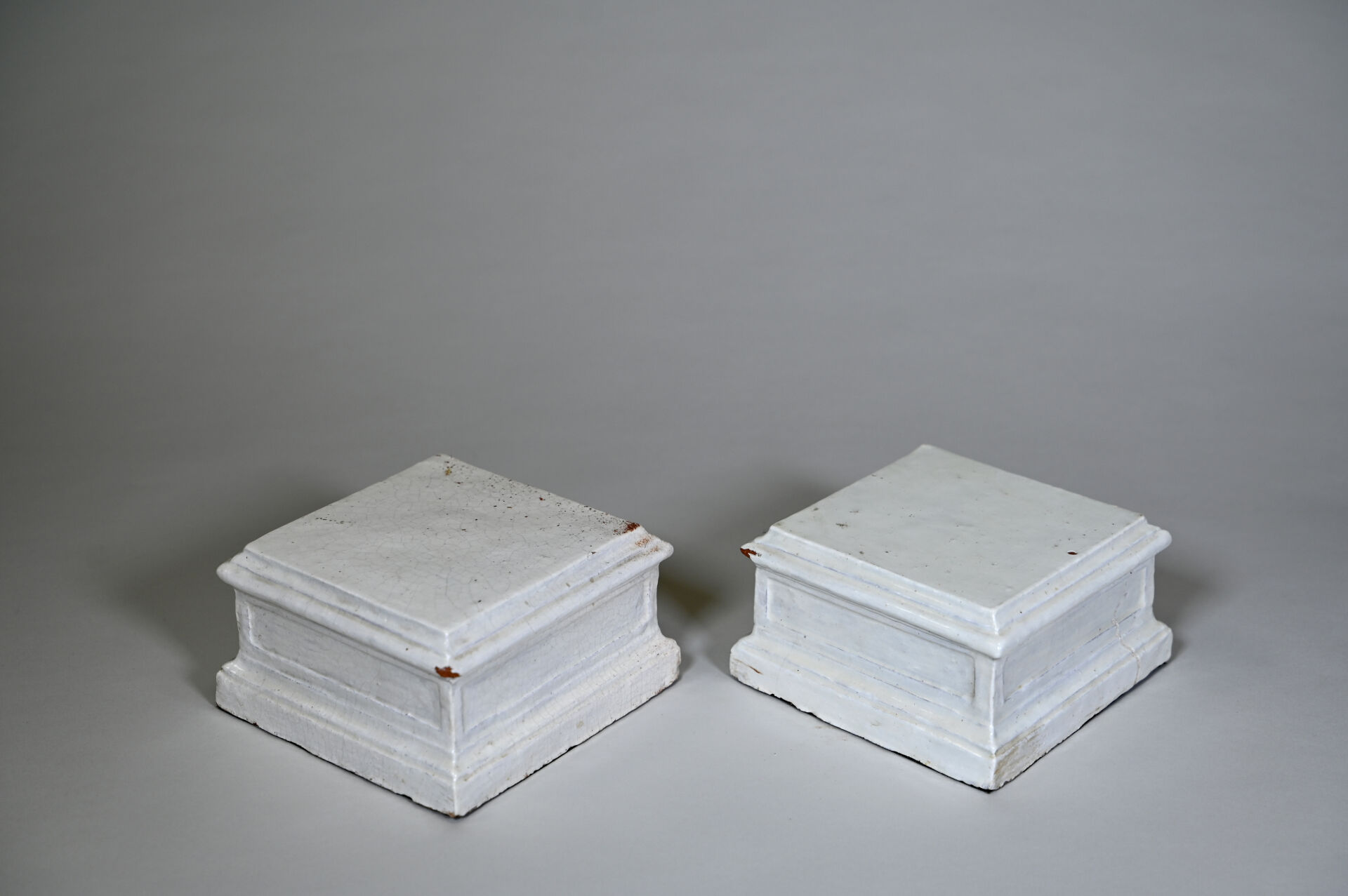 Paire de vases décoratifs « Médicis » sur piédouche en faïence à décor en bleu sous couverte (un pied accidenté). Époque fin XIXème début XXème. Haut. : 24,5 cm. On joint deux socles en terre cuite émaillée crème, non réalisés pour ces pièces.