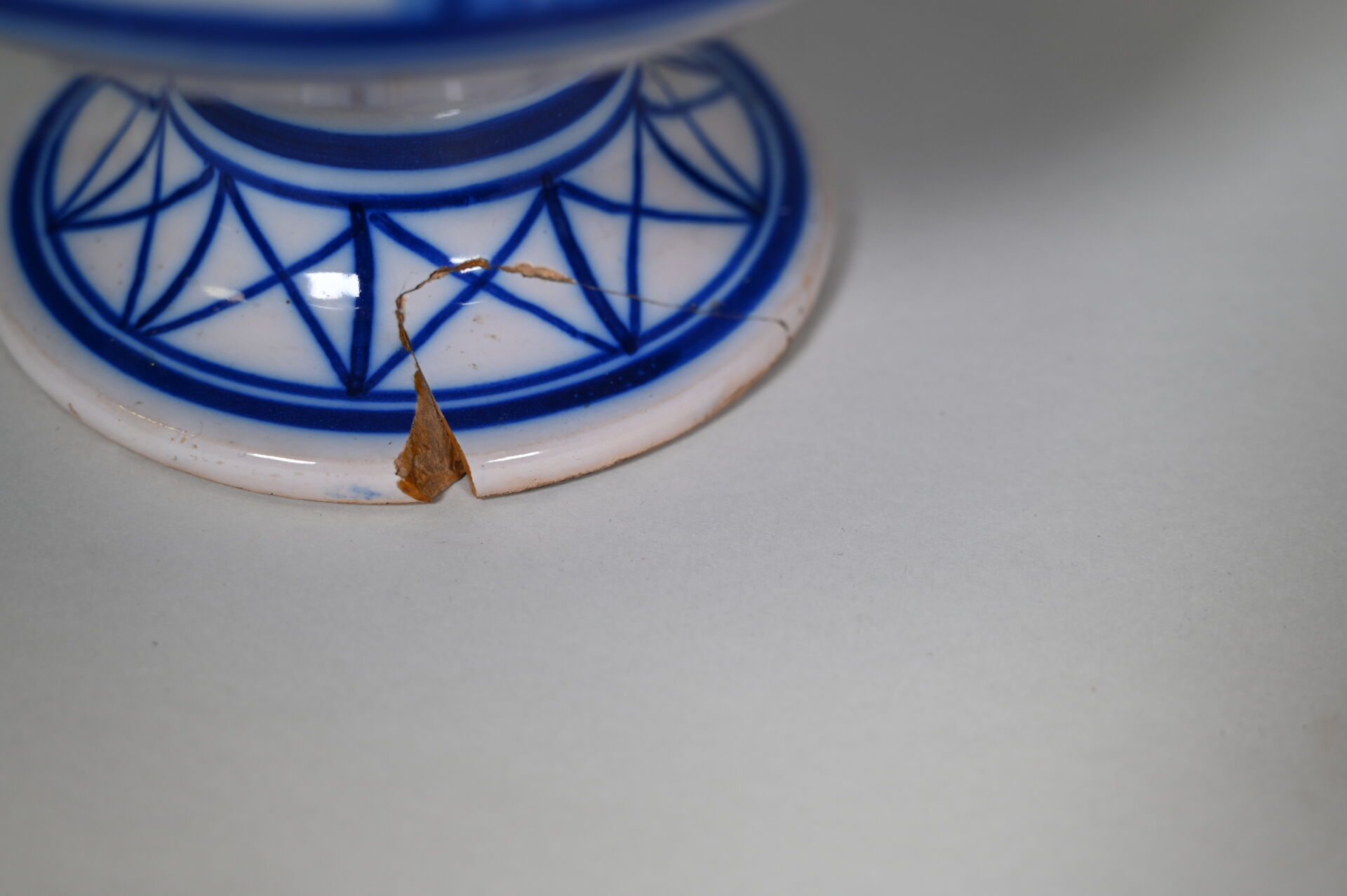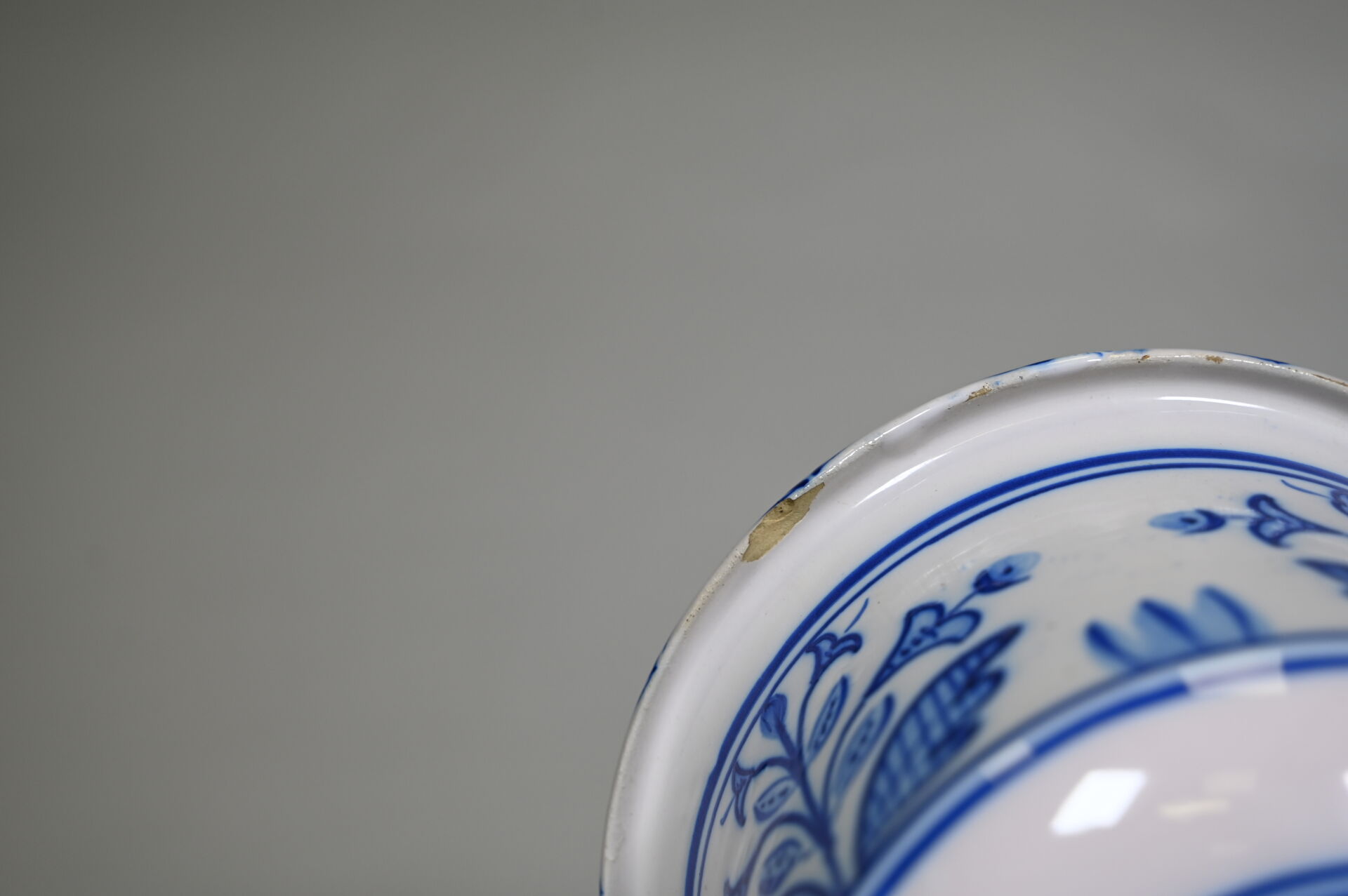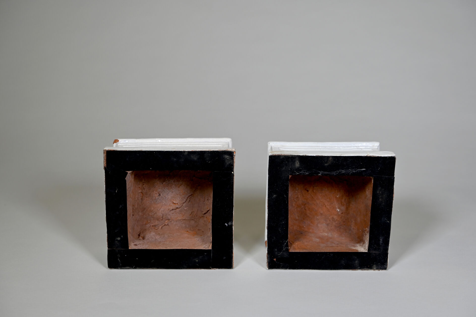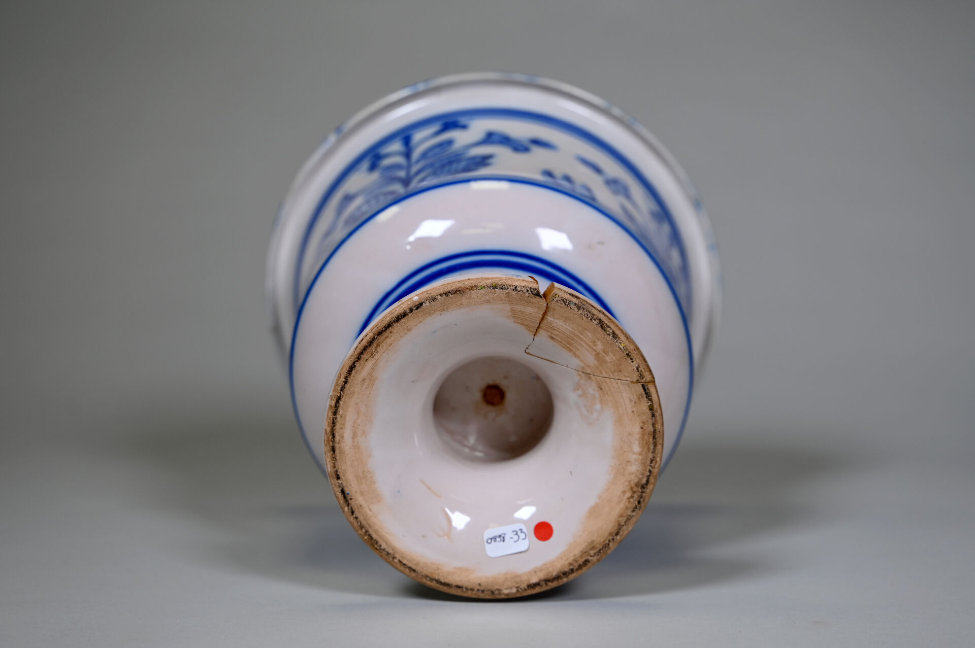 Paire de vases décoratifs « Médicis » sur piédouche en faïence à décor en bleu sous couverte (un pied accidenté). Époque fin XIXème début XXème. Haut. : 24,5 cm. On joint deux socles en terre cuite émaillée crème, non réalisés pour ces pièces.