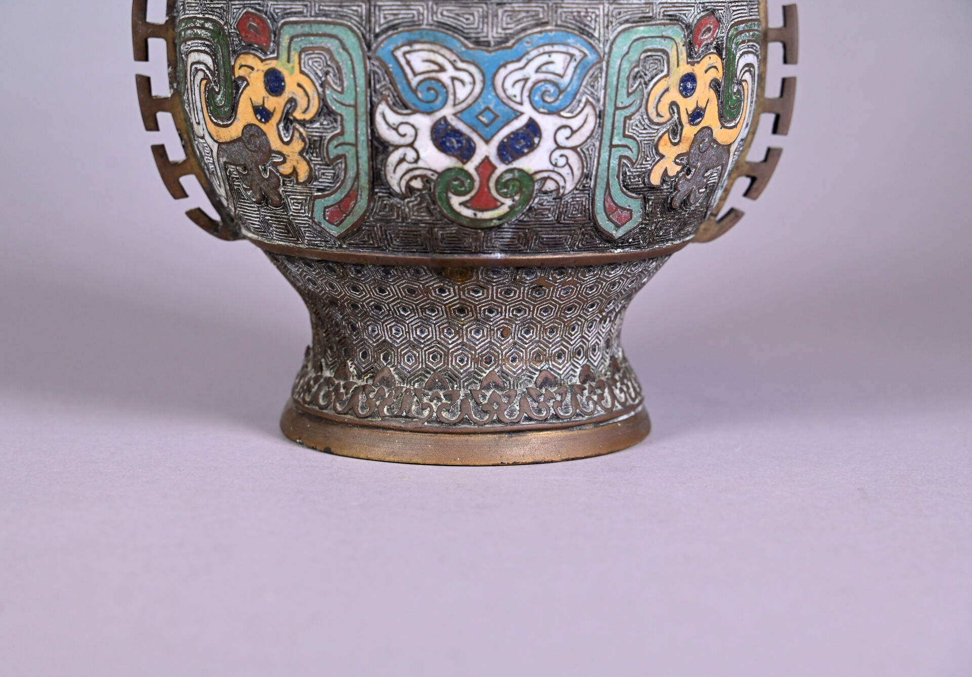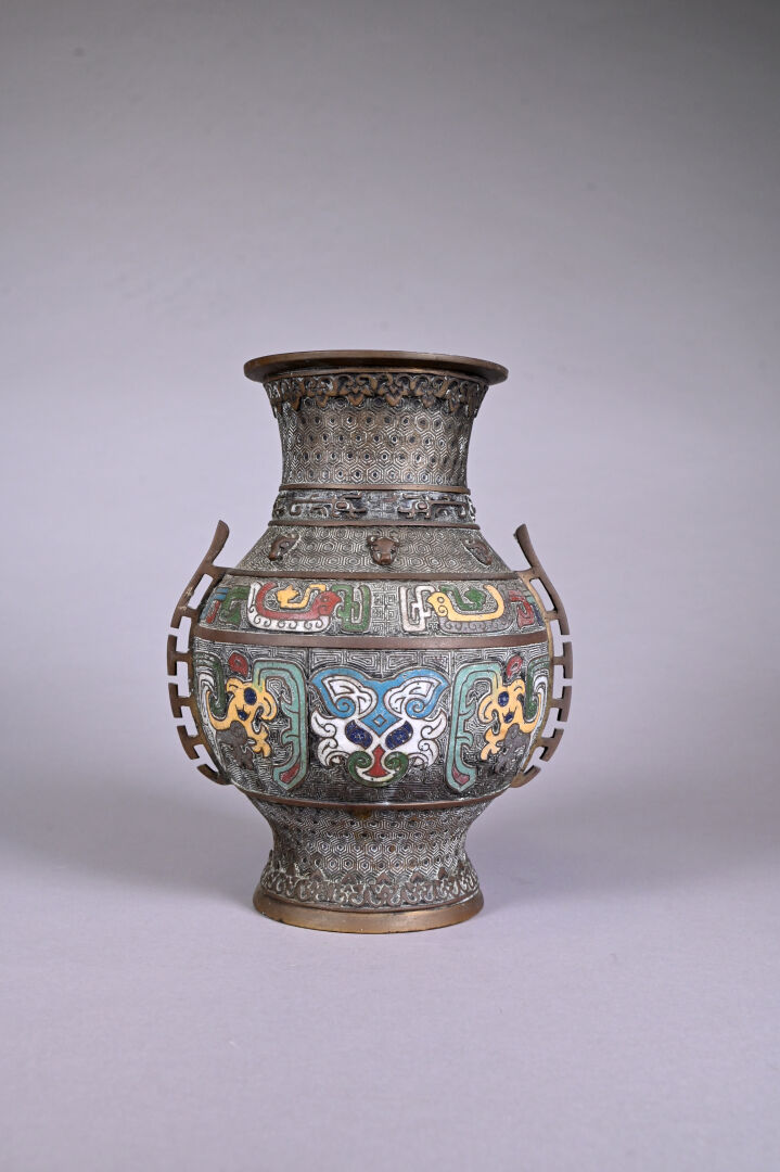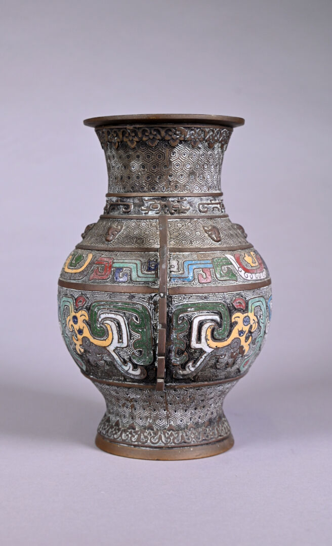 Paire de vases en bronze ciselé à décor en partie émaillé en cloisonné. Chine, fin du XIXe siècle ou début du XXe siècle. Haut. : 26 cm.