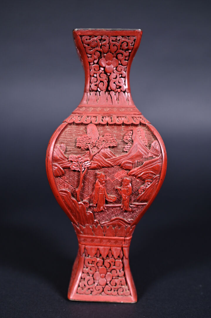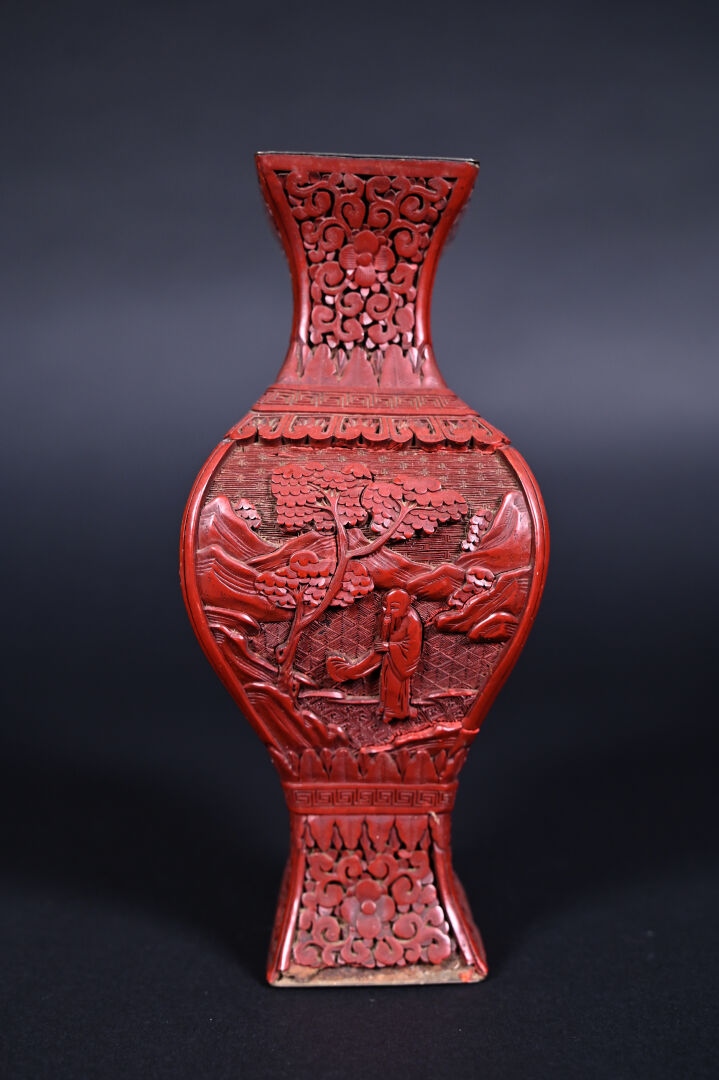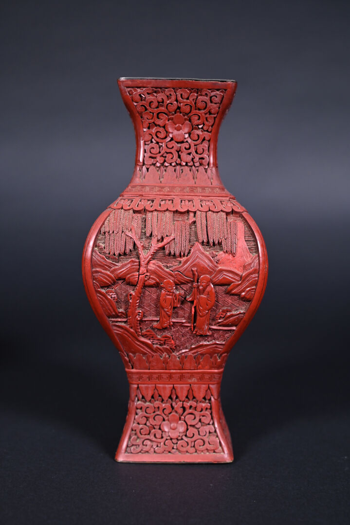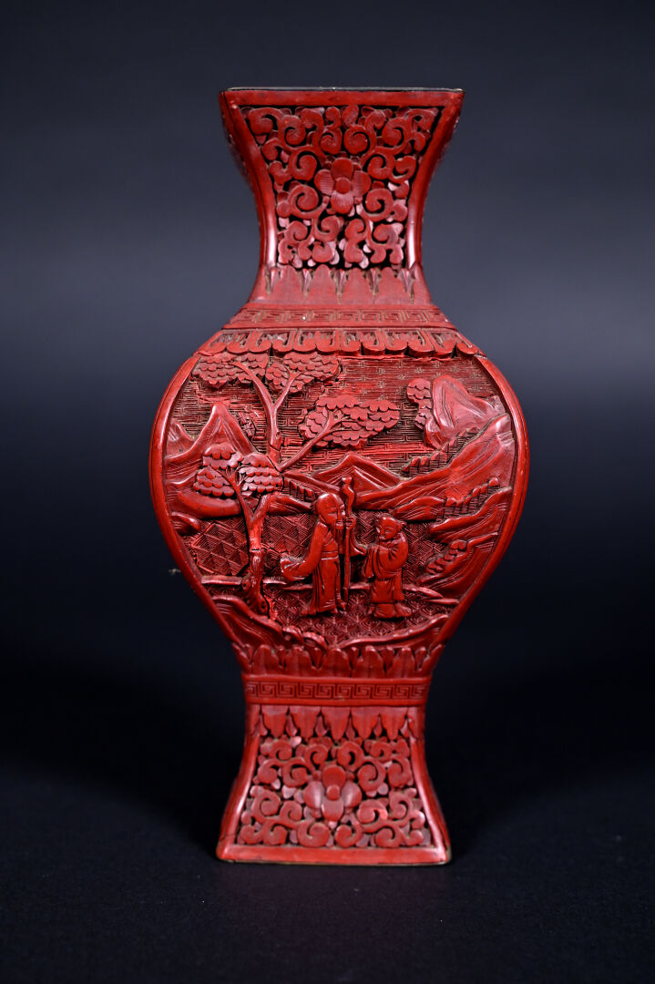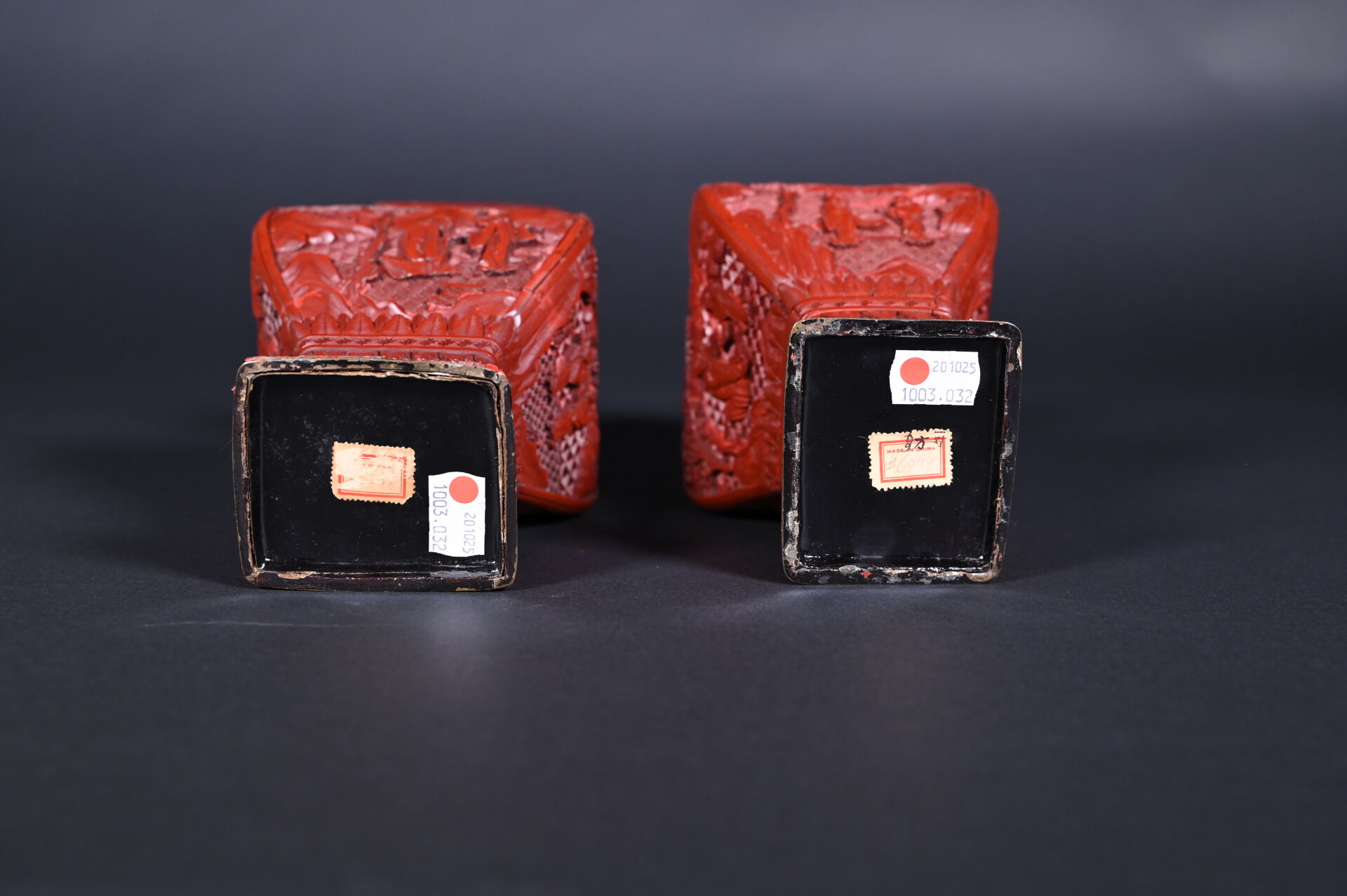 Paire de vases en laque à l’imitation de la laque de cinabre, à décor en médaillons de sages et disciples, et motifs floraux. Chine, vers 1930. Haut. : 25 cm.