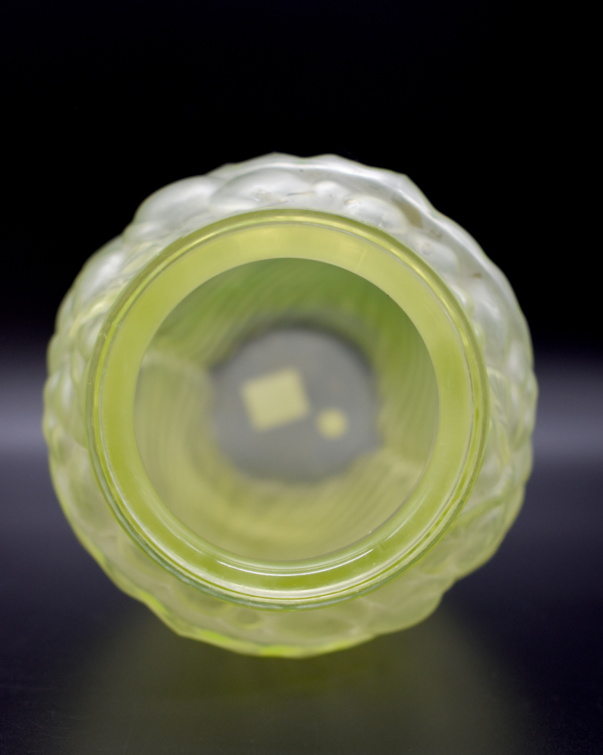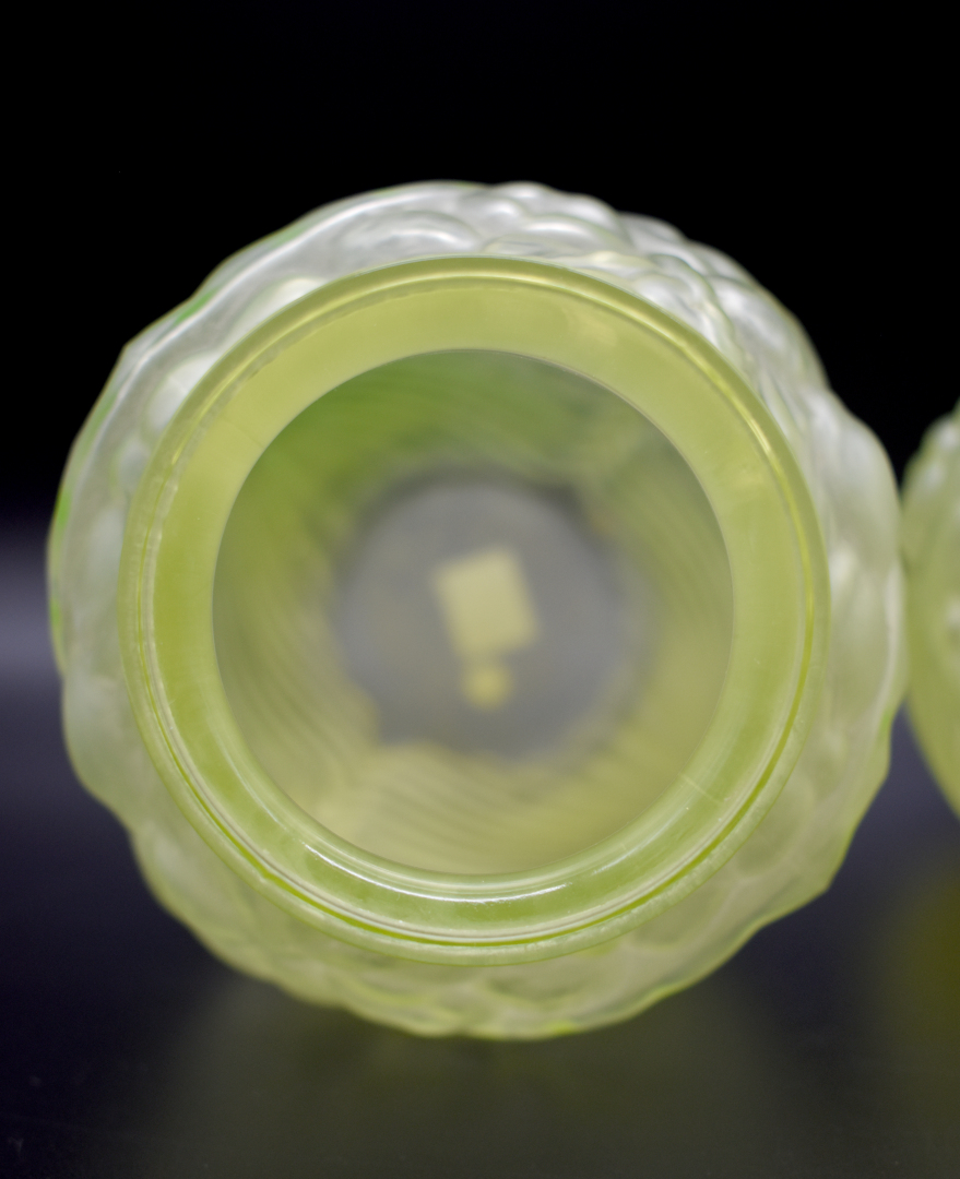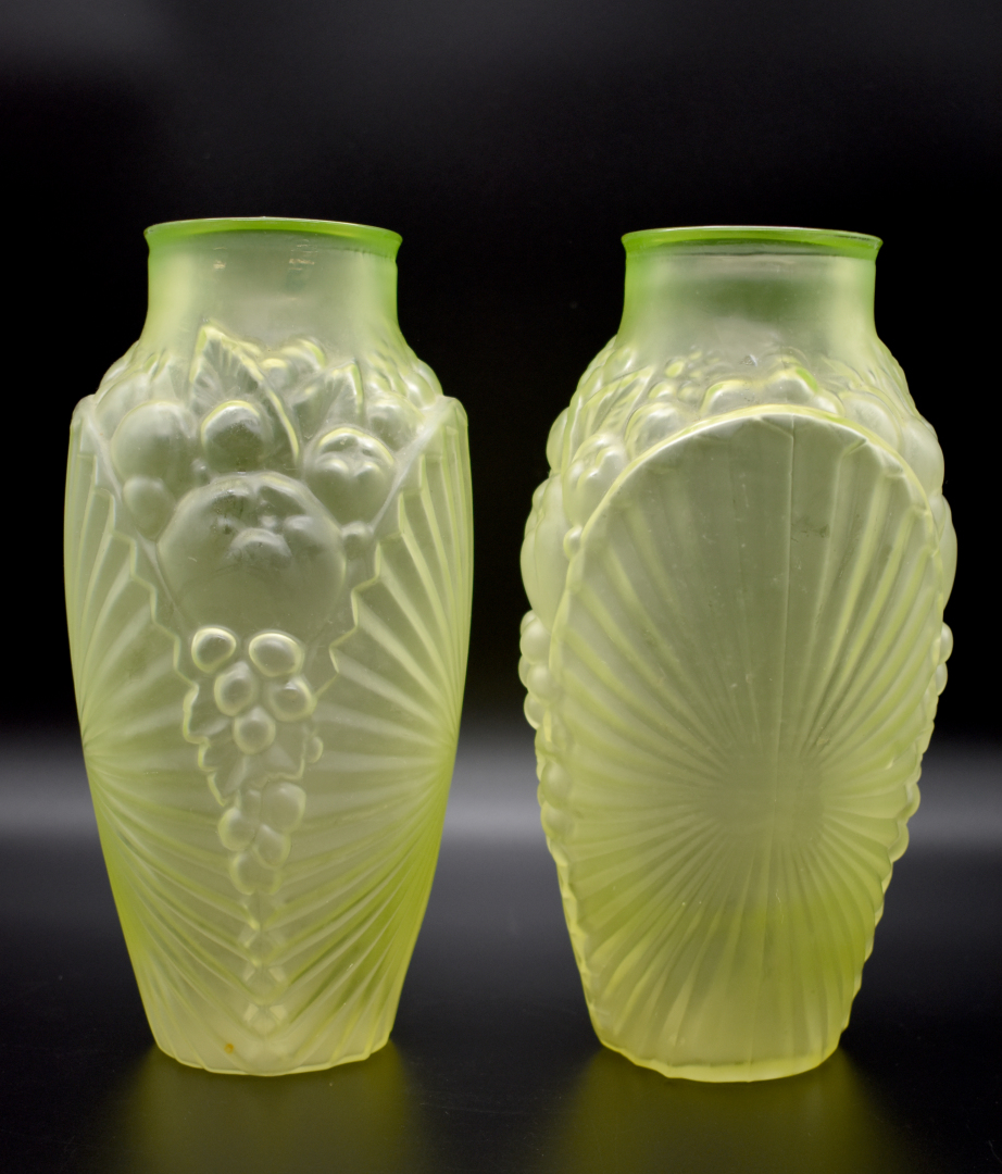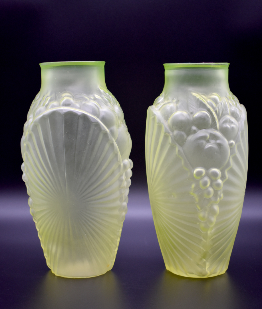 Paire de vases en oraline à décor moulé d’un motif de plis rayonnant et fruits. Vers 1930. Haut. : 25 cm.