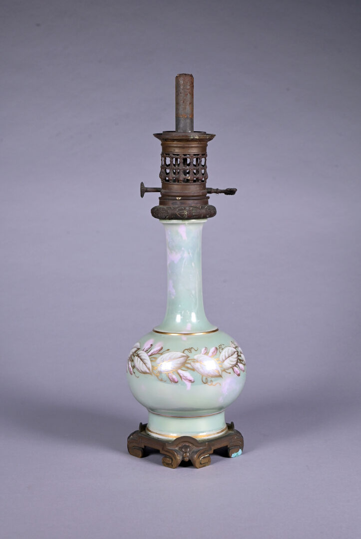 Paire de vases en porcelaine montés en lampes à pétrôle à décor de feuilles en doré et céladon à reflets nacrés. Monture en bronze dans le goût Chinois. Fin du XIXe siècle. Haut; : 44 cm.