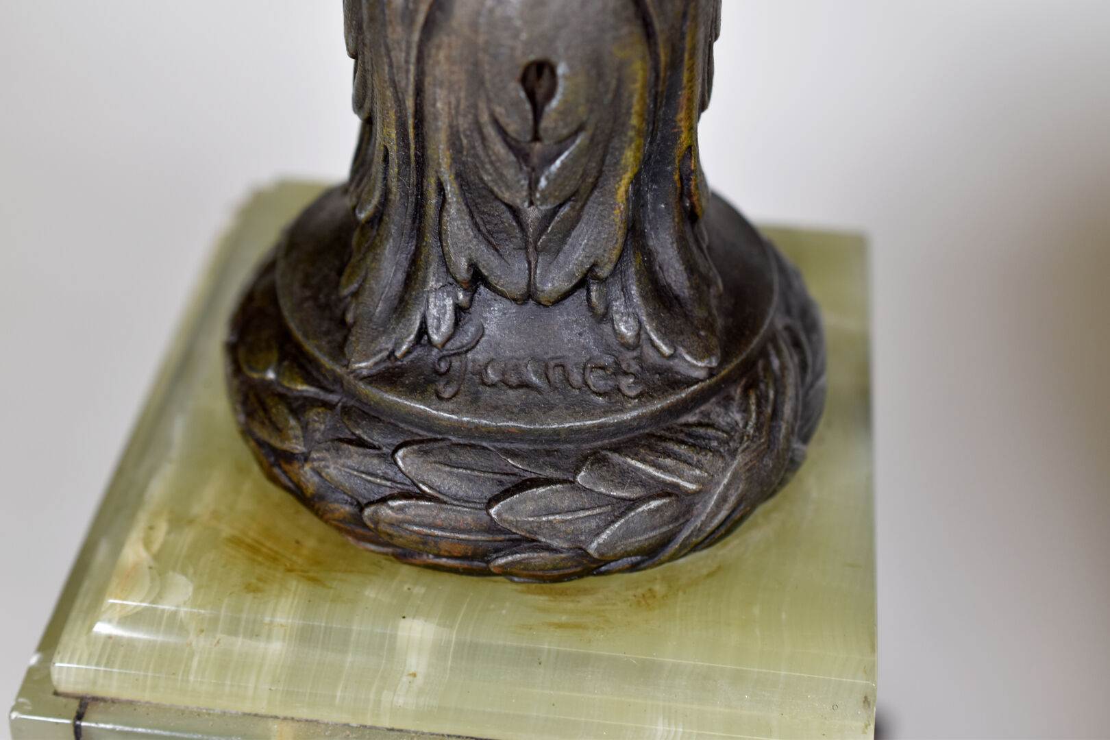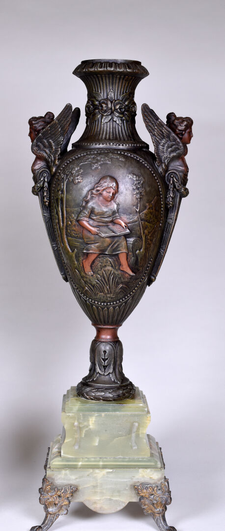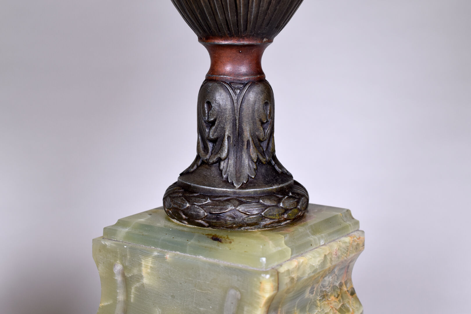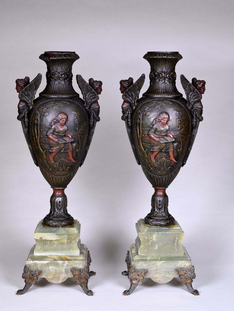 Paire de vases en régule patiné brun et médaille, les anses formées de sphinges, la base à gradins en onyx vert ( un accident à un col). Époque Napoléon III. Haut. : 56 cm.