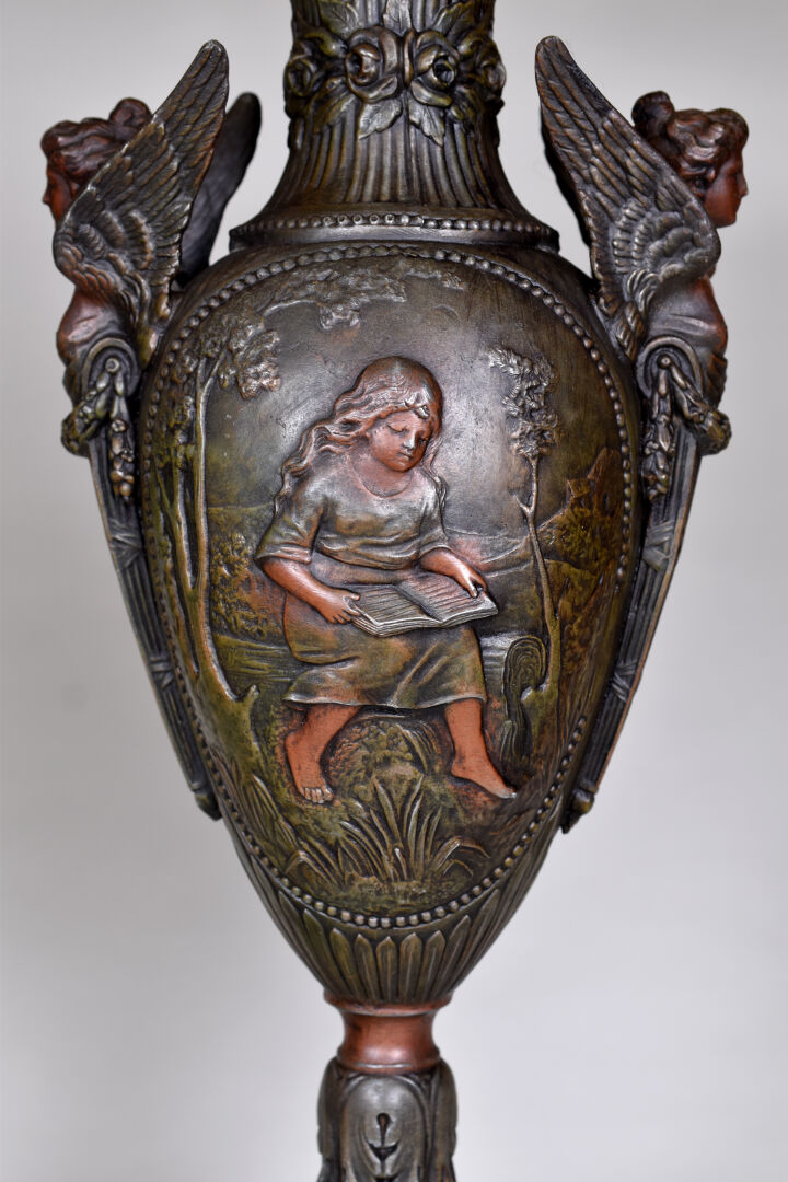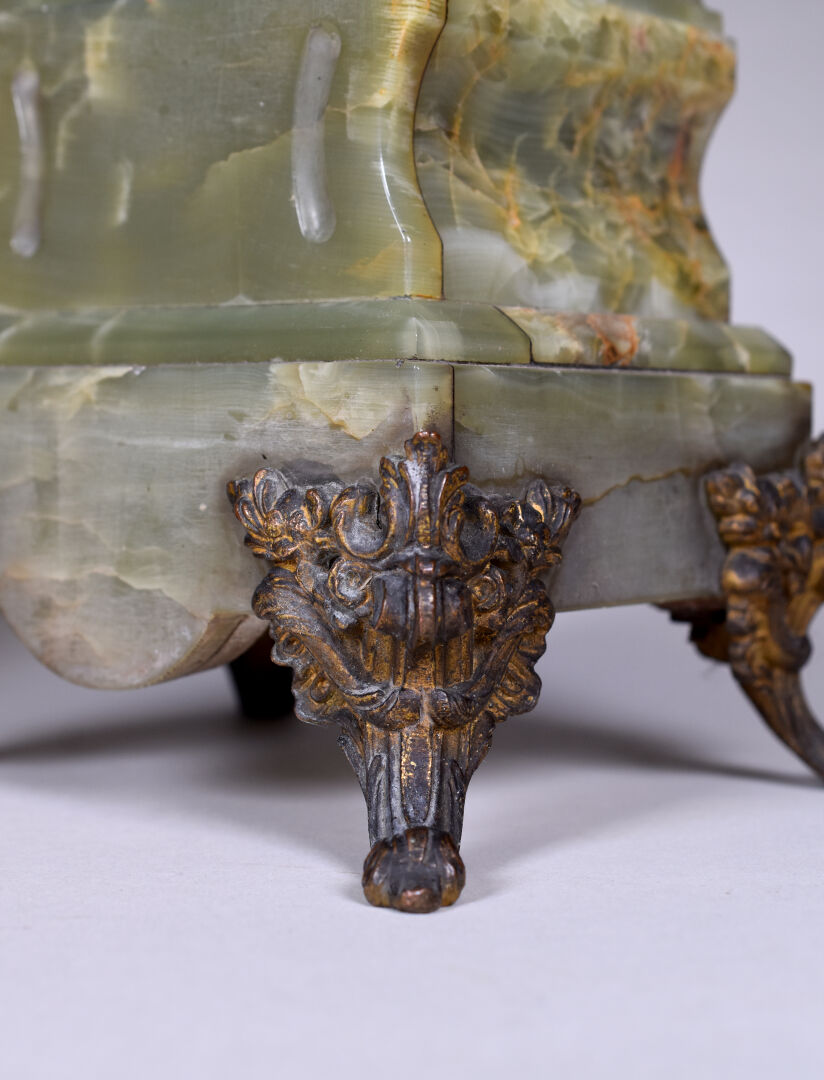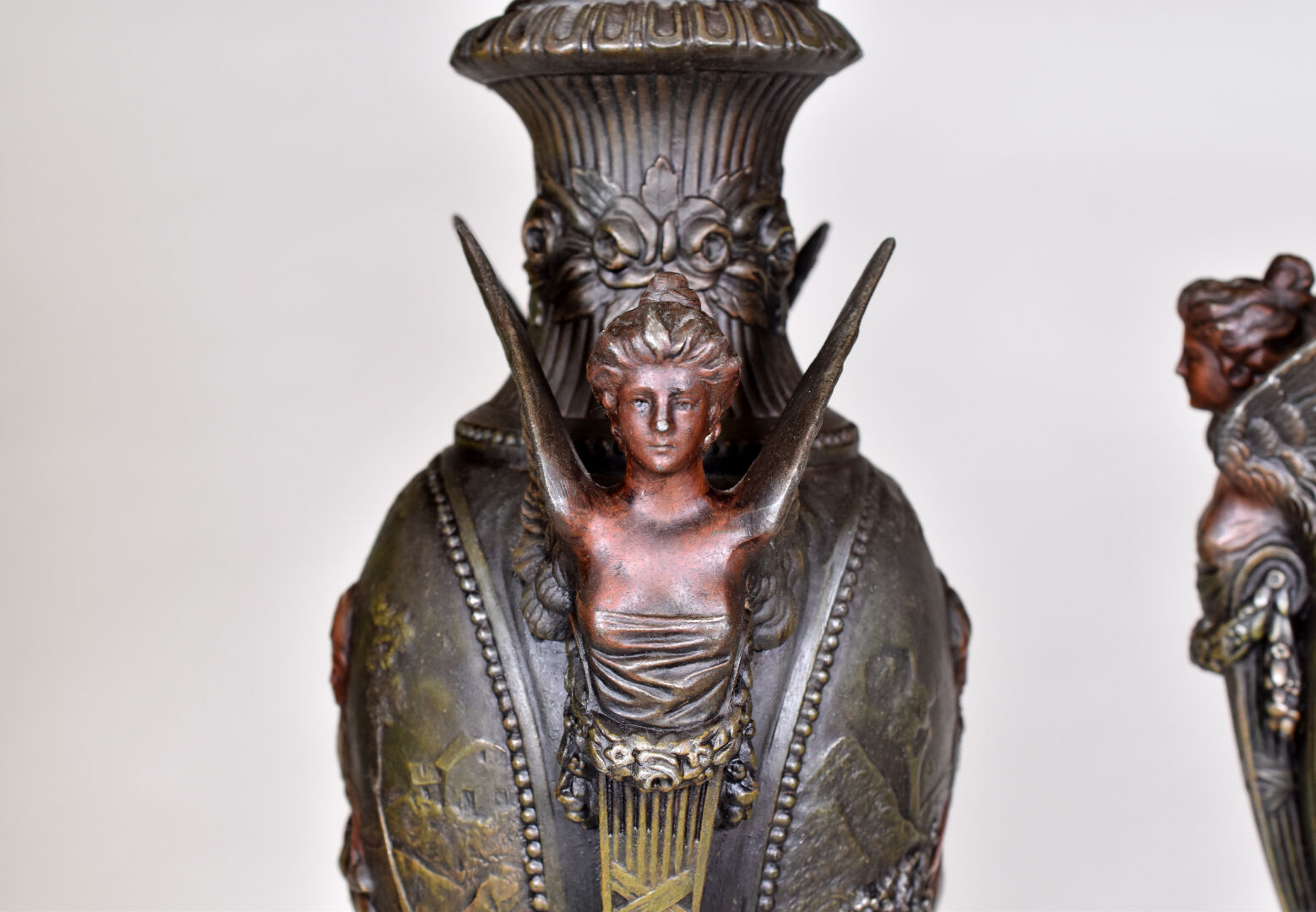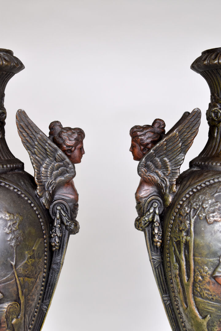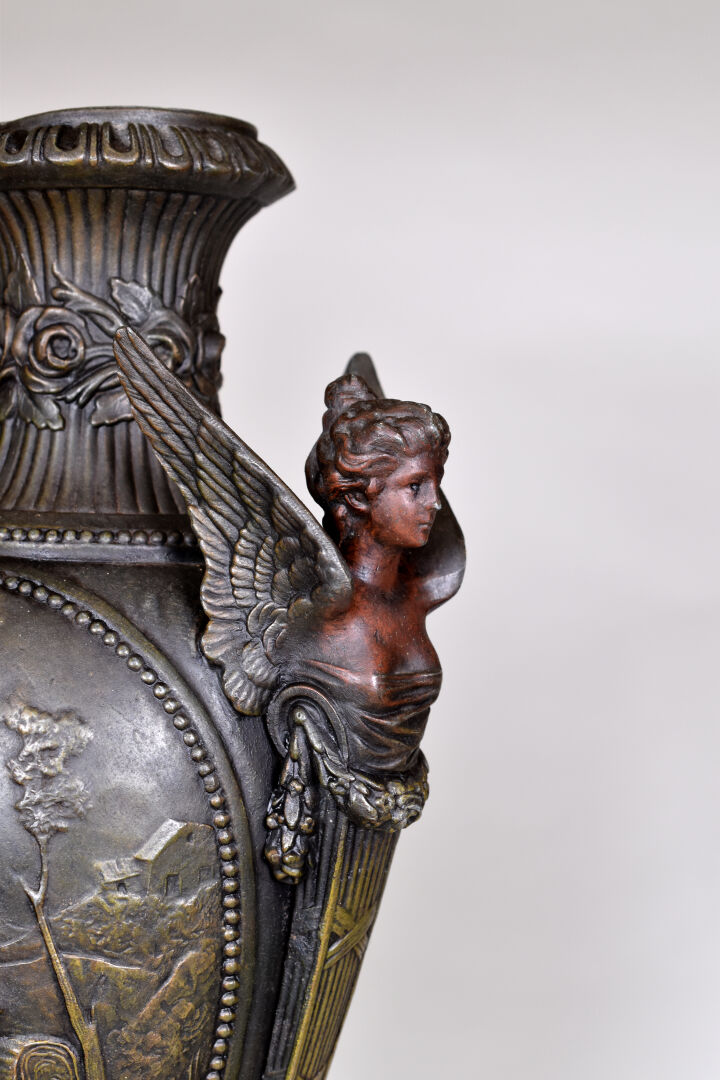 Paire de vases en régule patiné brun et médaille, les anses formées de sphinges, la base à gradins en onyx vert ( un accident à un col). Époque Napoléon III. Haut. : 56 cm.