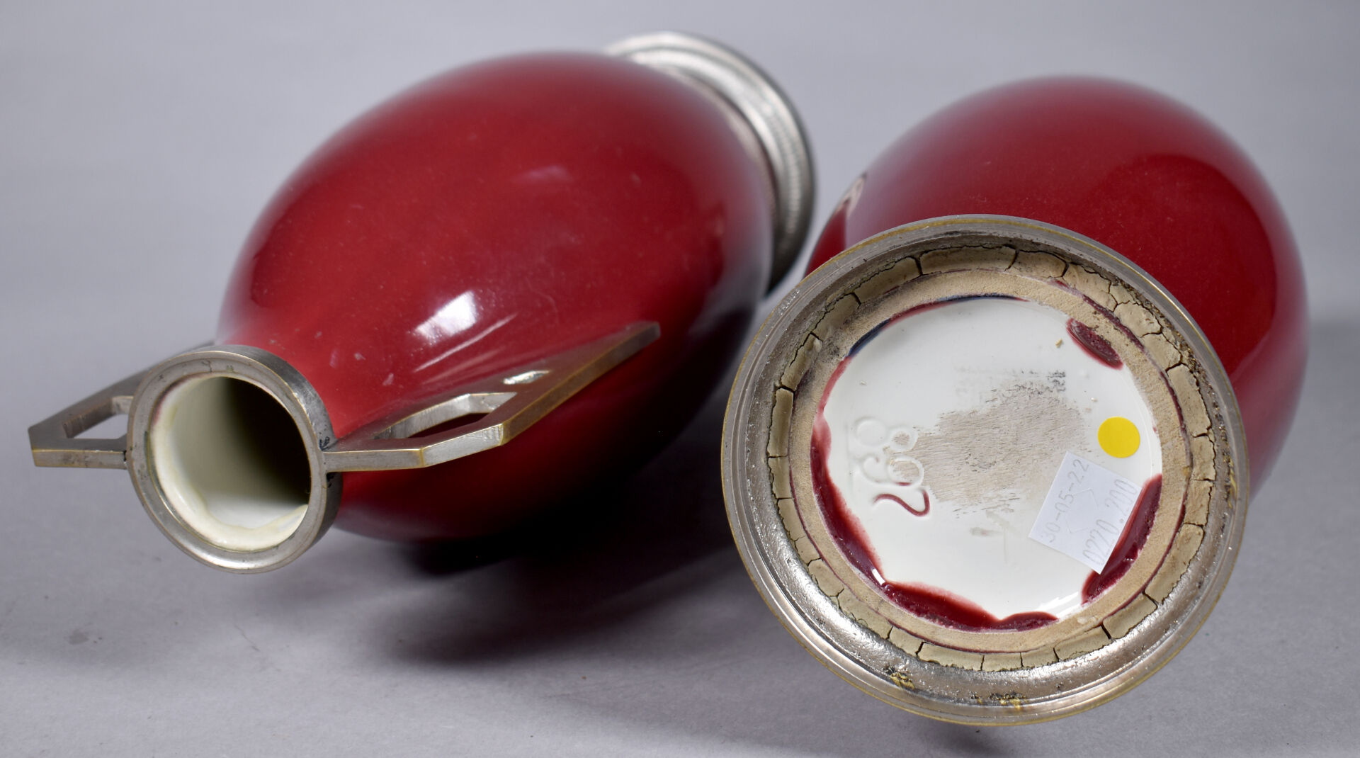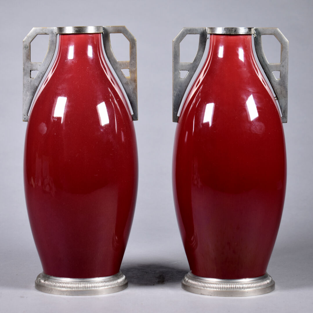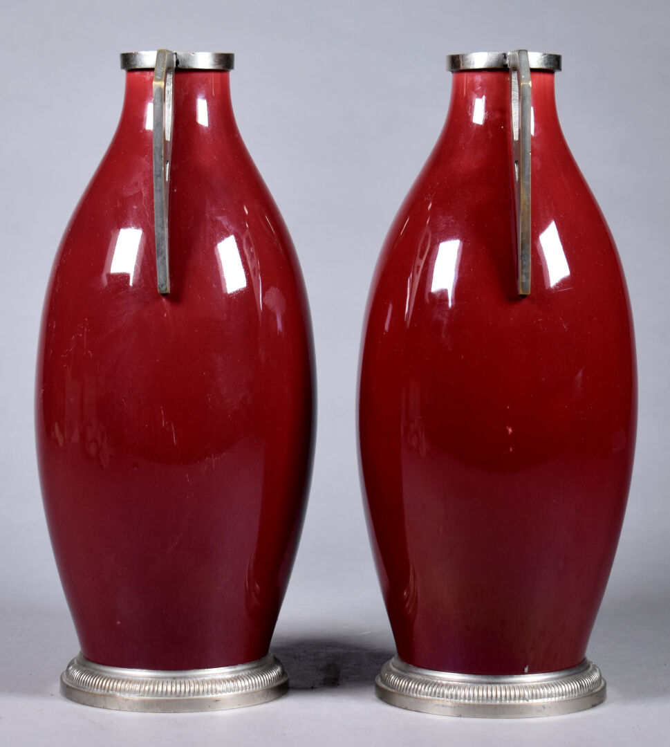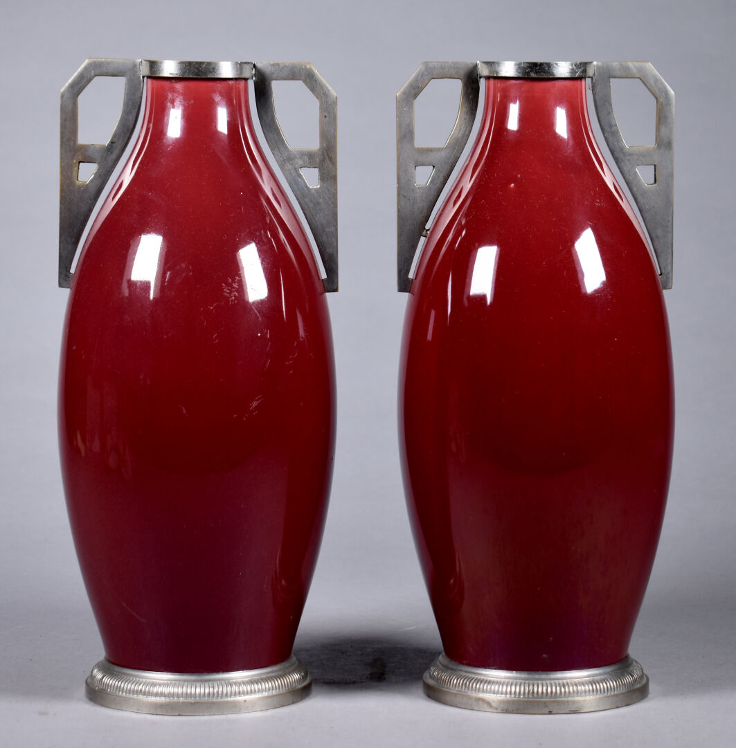 Paire de vases fuselés en faïence émaillée rouge sang de boeuf, les anses en métal gris (quelques rayures). Travail probablement Belge. Haut. : 28,5 cm.