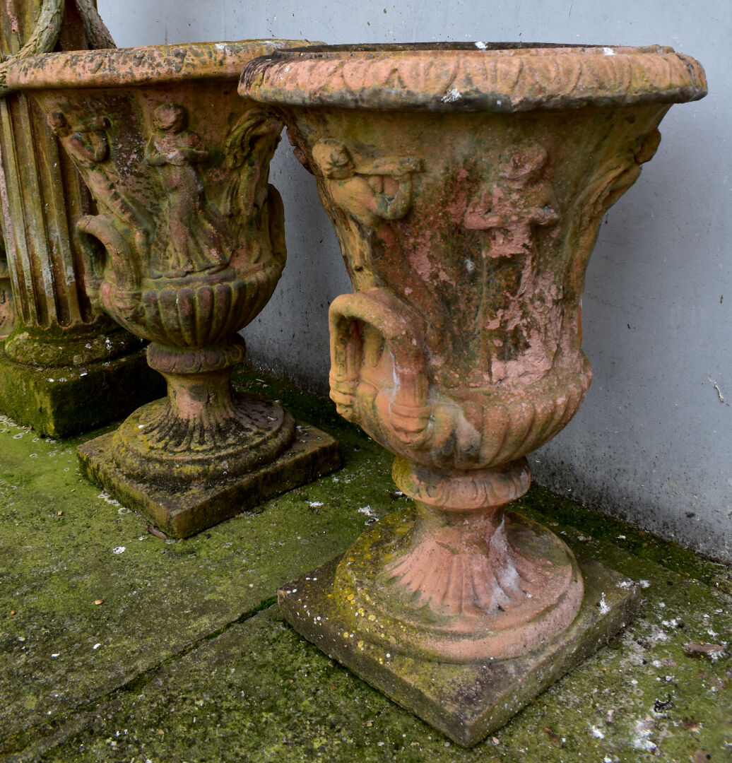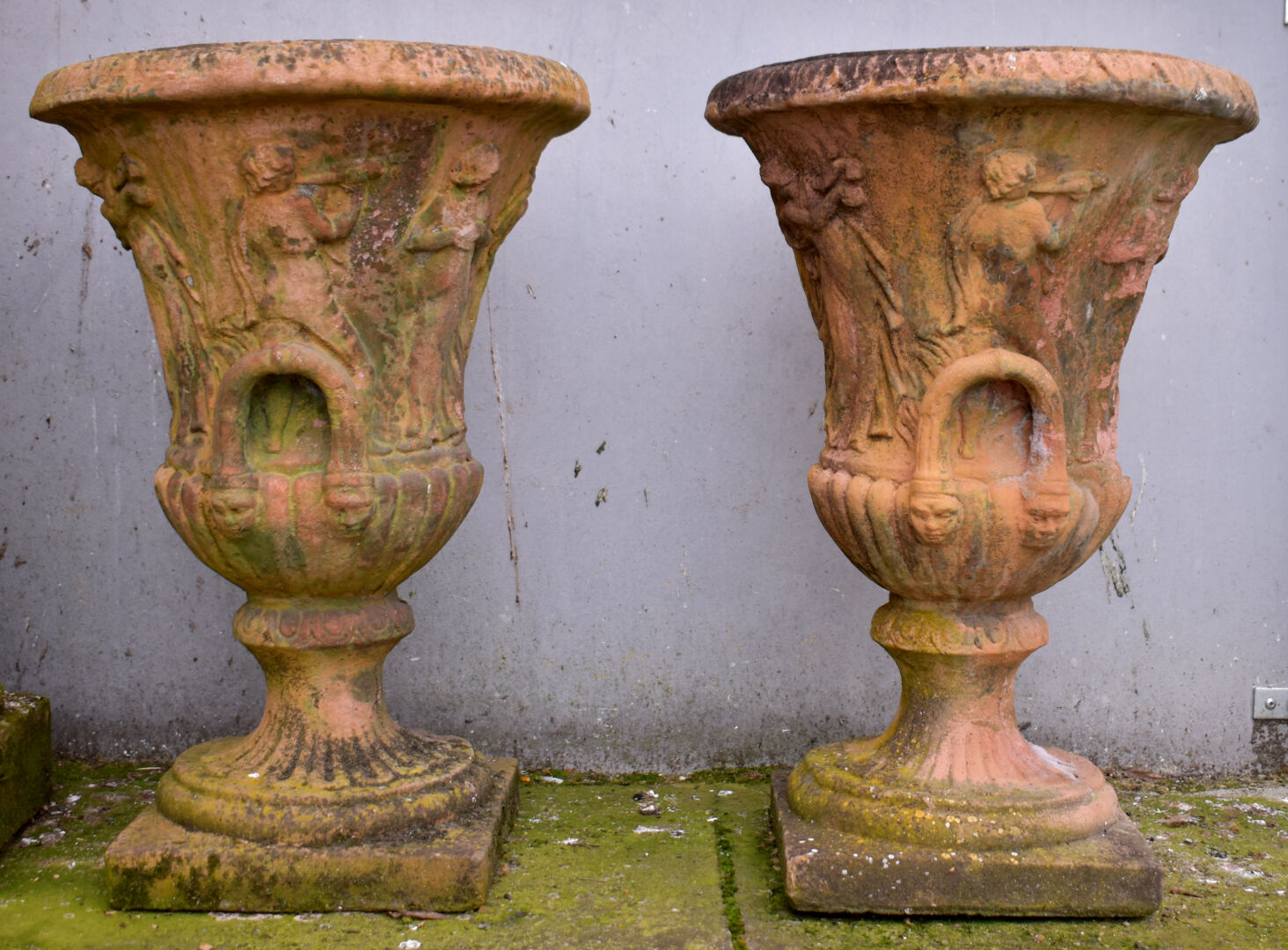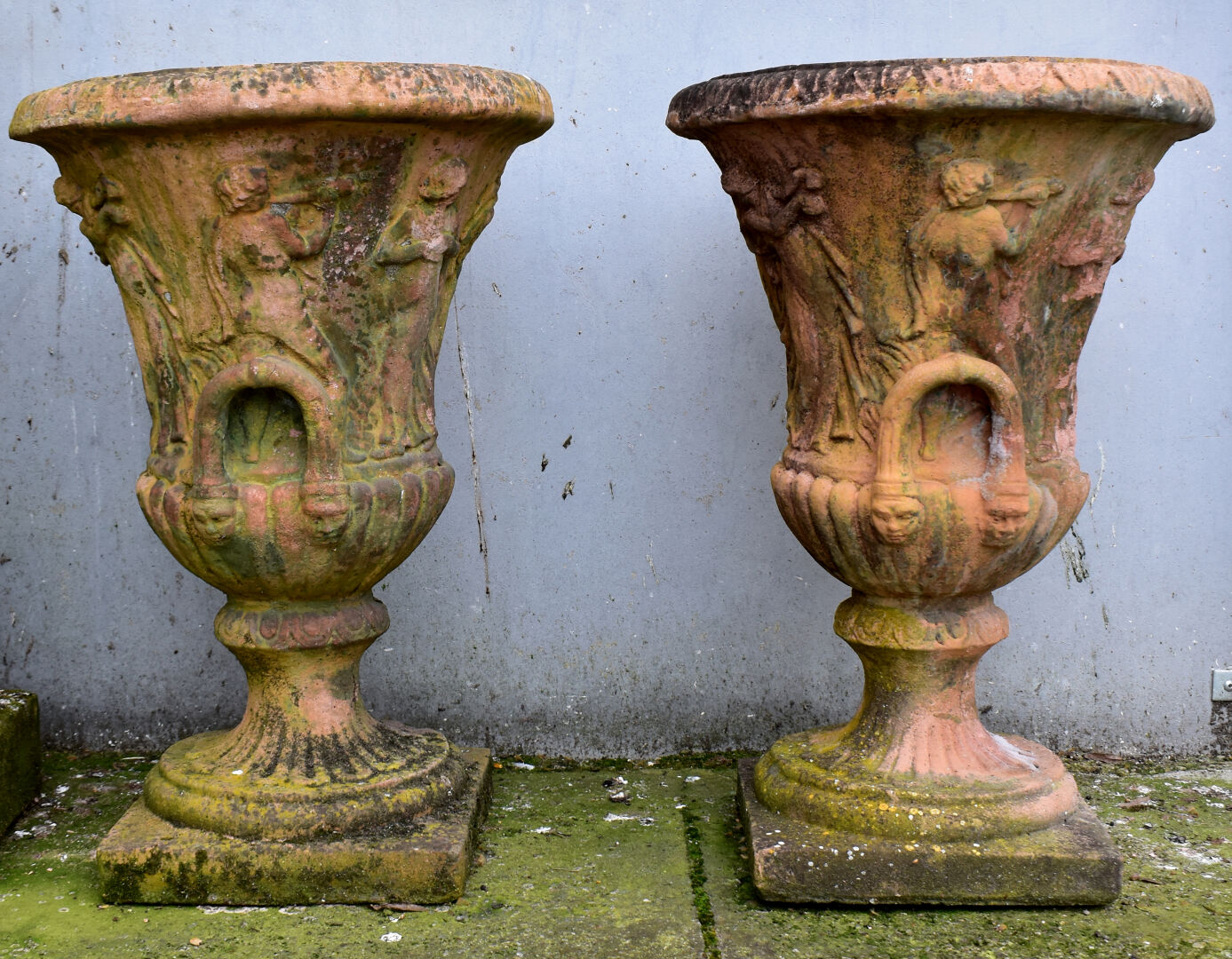 Paire de vases Médicis en ciment coloré à décor de bas-reliefs dans le goût antique (usures, éclats). Haut. : 82 cm.