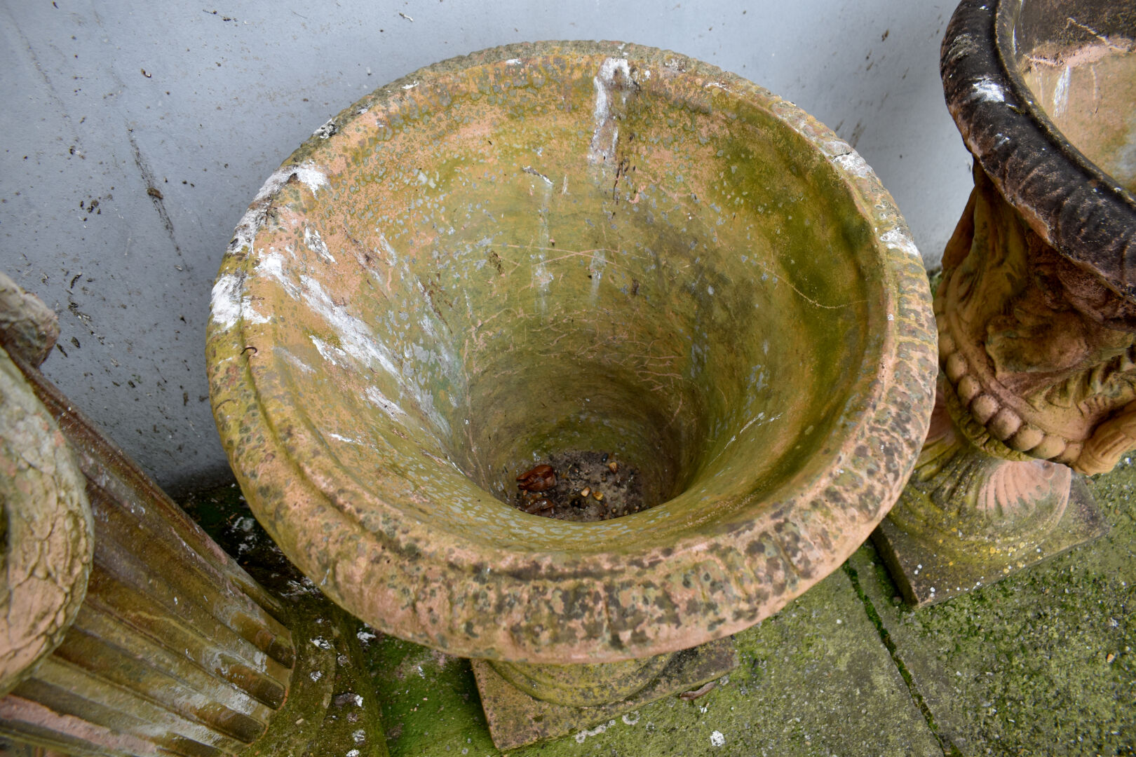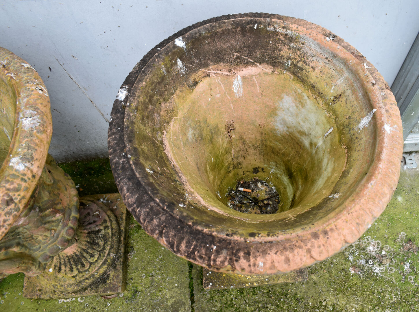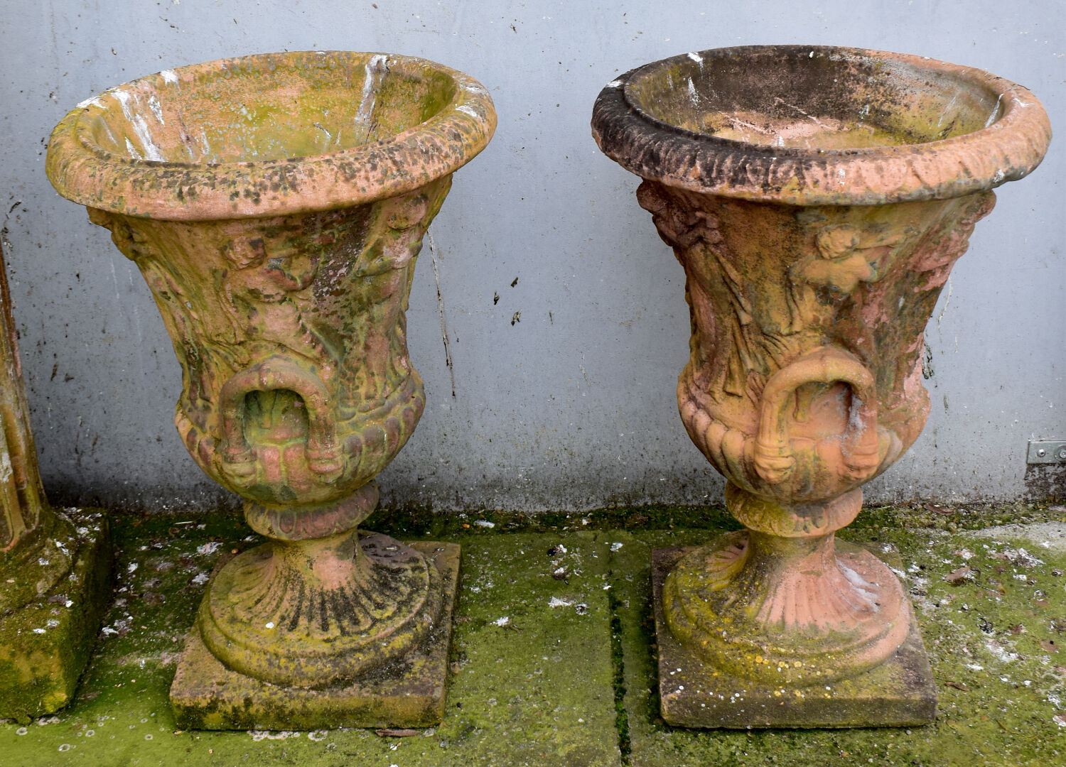 Paire de vases Médicis en ciment coloré à décor de bas-reliefs dans le goût antique (usures, éclats). Haut. : 82 cm.