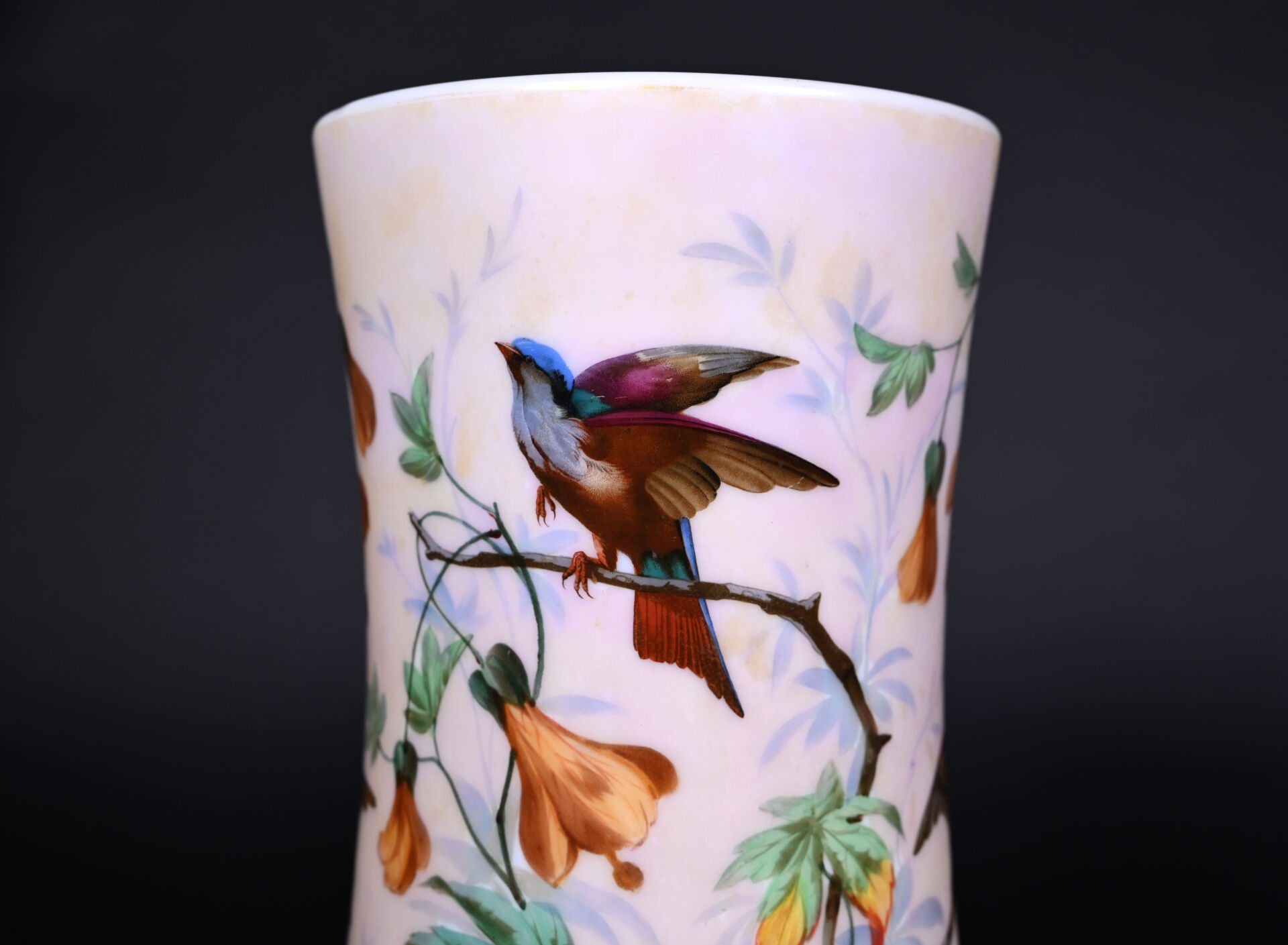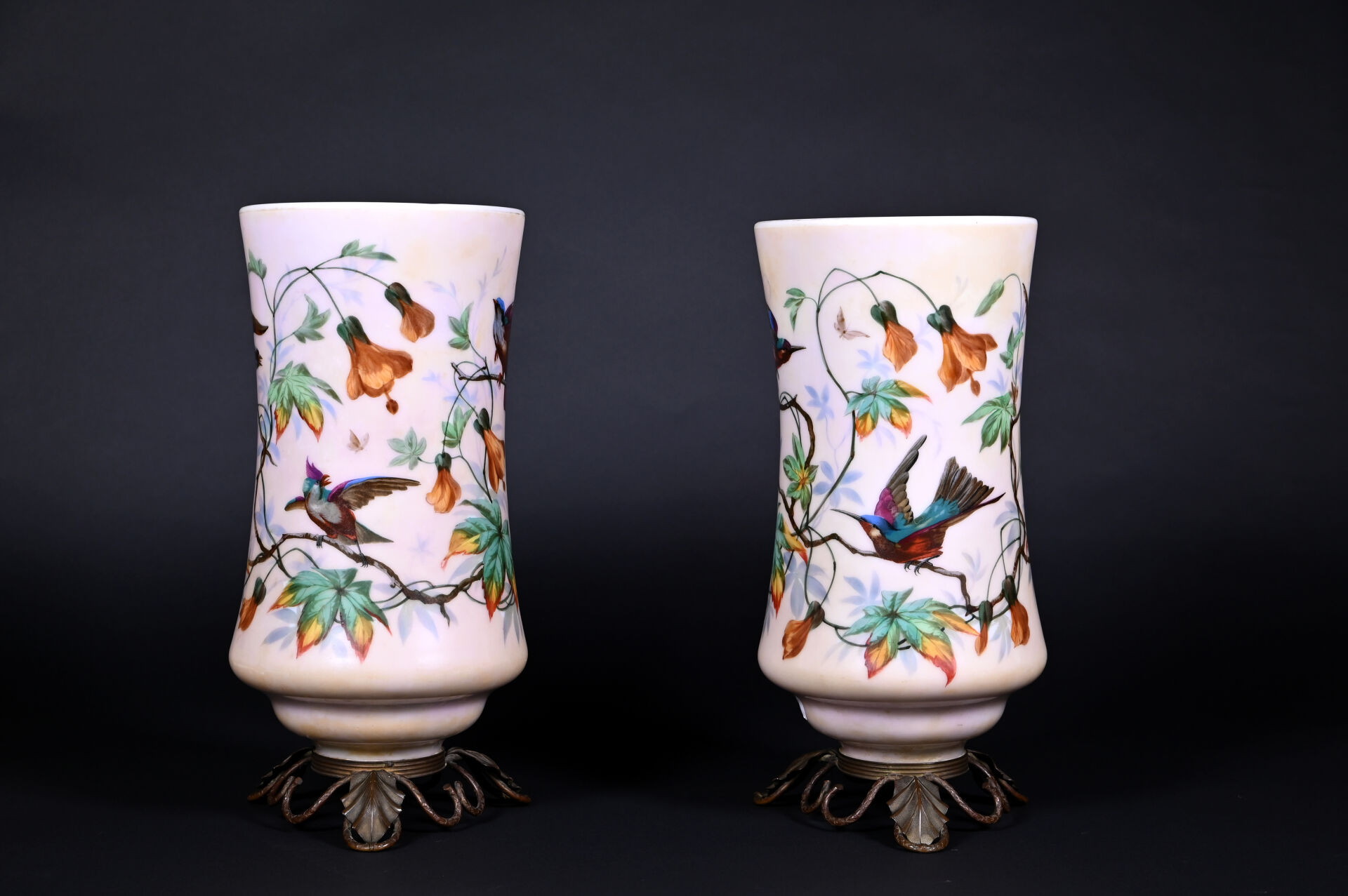 Paire de vases rouleau légèrement resserré en opaline beige à décor émaillé en polychromie d’oiseaux branchés et fleurs (salissures). Monture en bronze ajouré à décor de feuilles et branches. Vers 1900. Haut. : 39 cm.