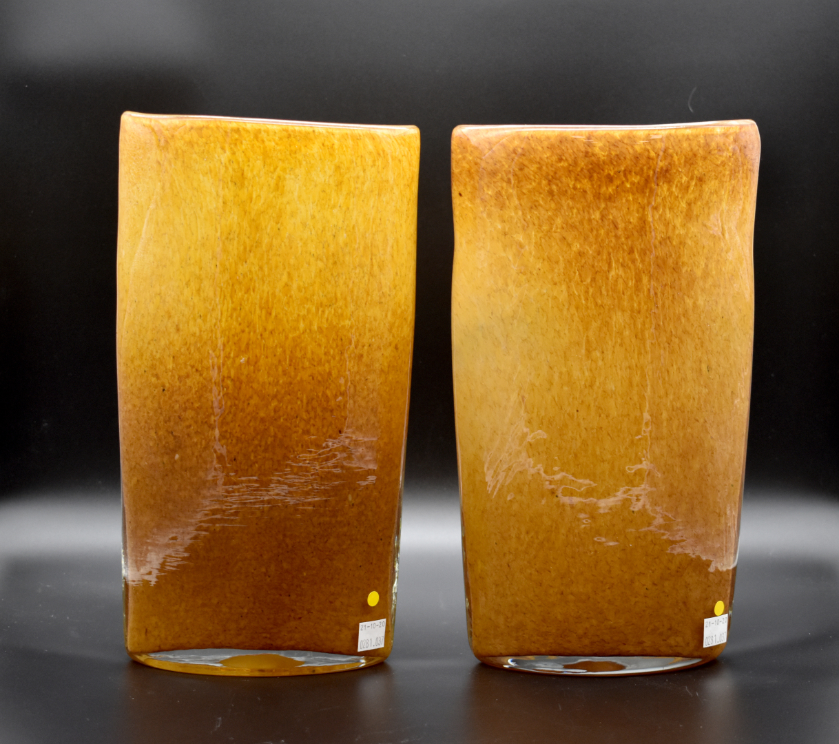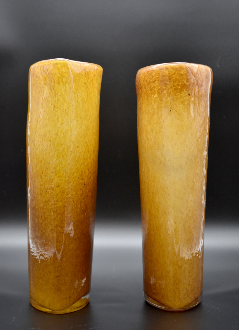 Paire de vases rouleaux en verre marmoréen tabac dans le goût de Murano. Haut. : 31cm.