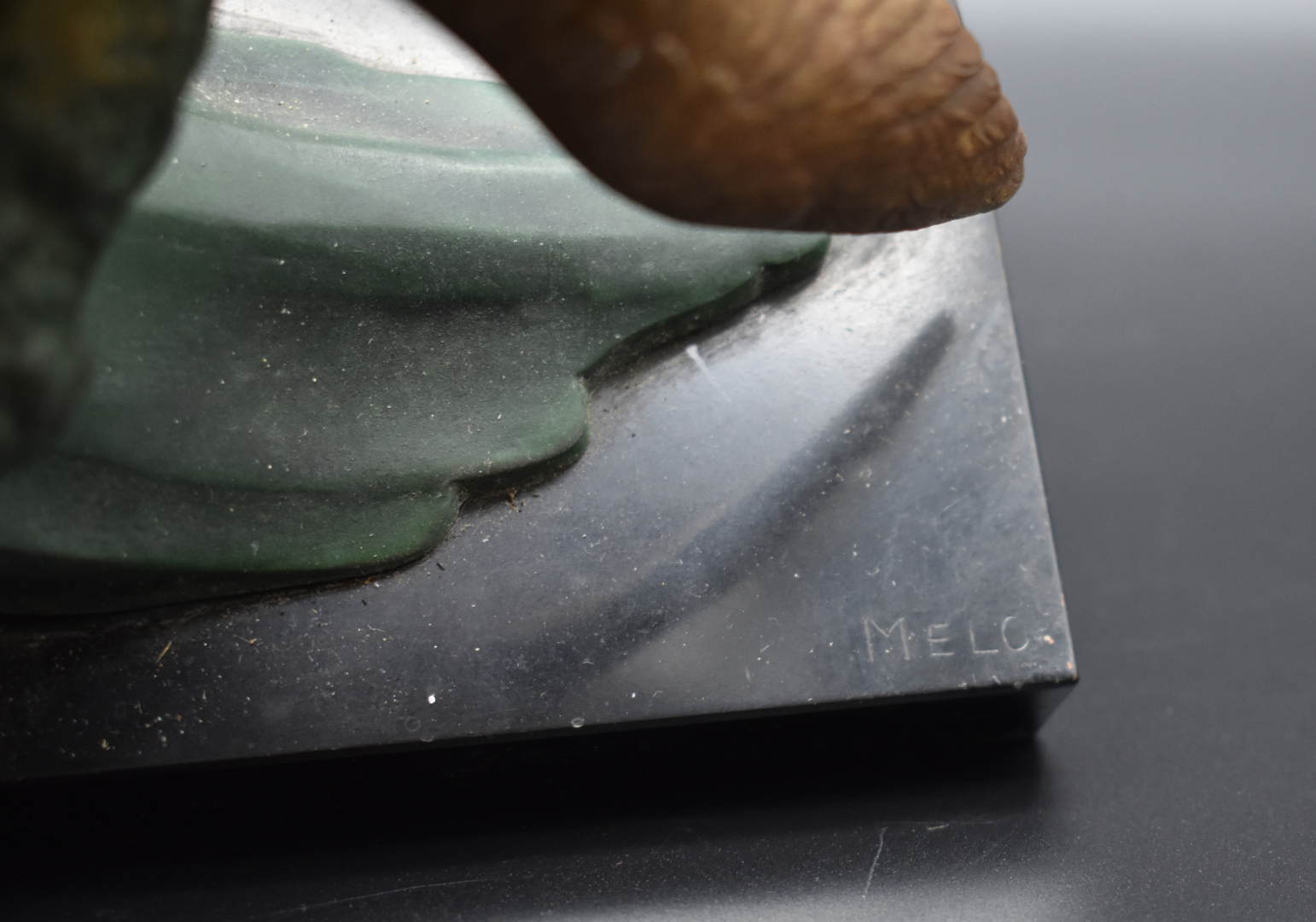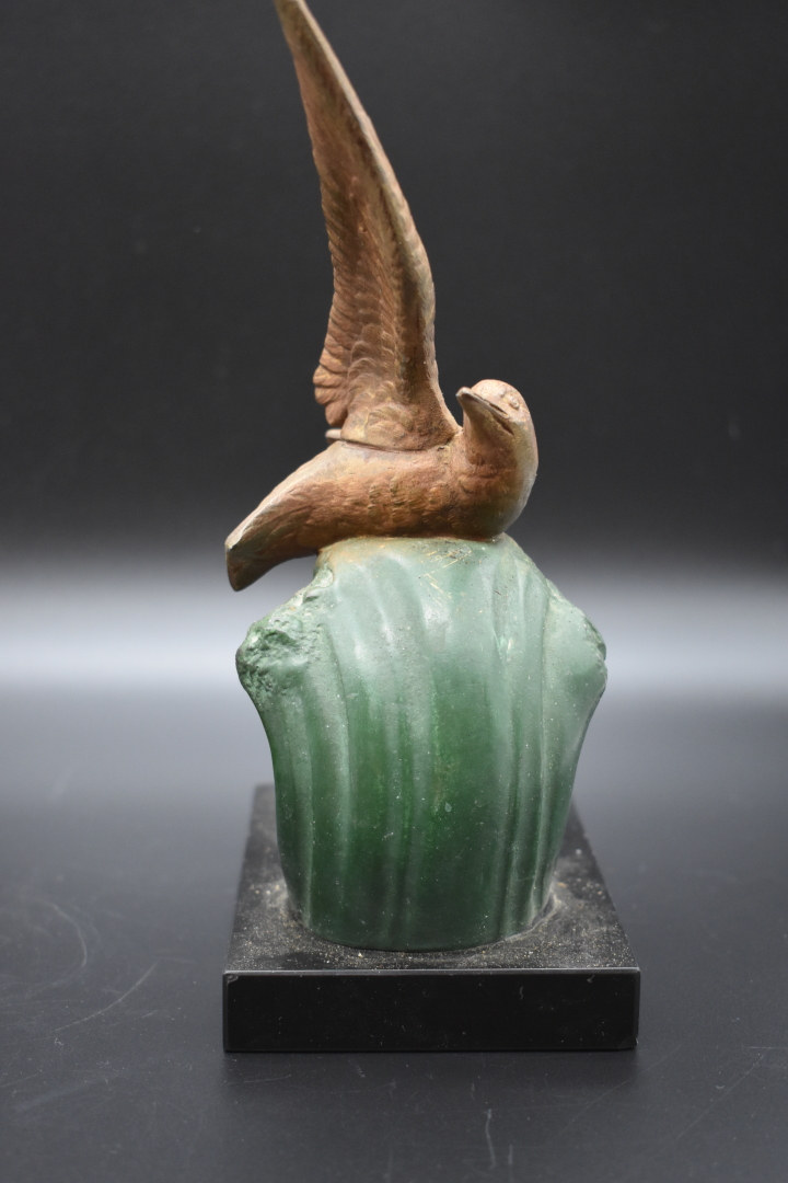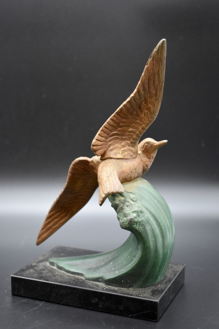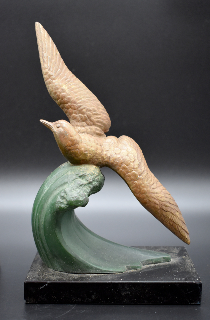 Paire serre-livres en régule figurant une mouette survolant une vague. Base en pierre dure noire. Signée MELO.