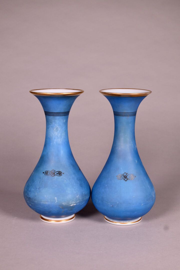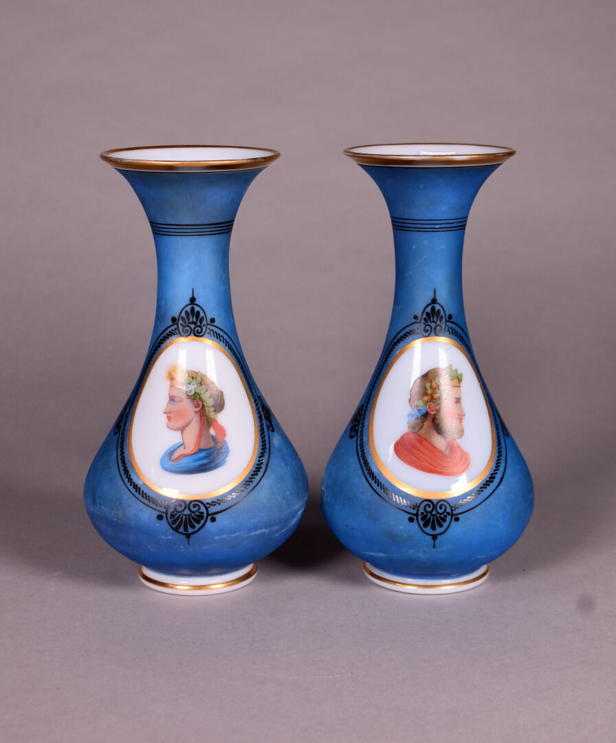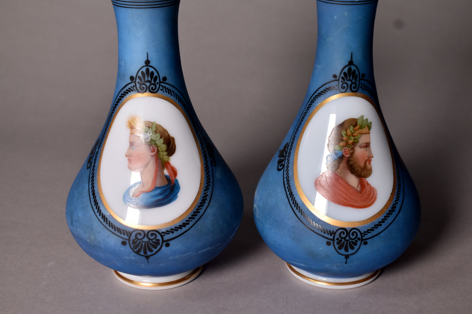 Paire vases balustre en opaline blanche et émaillée bleu à décor de profils à l’antique (quelques usures). Haut. : 24 cm.