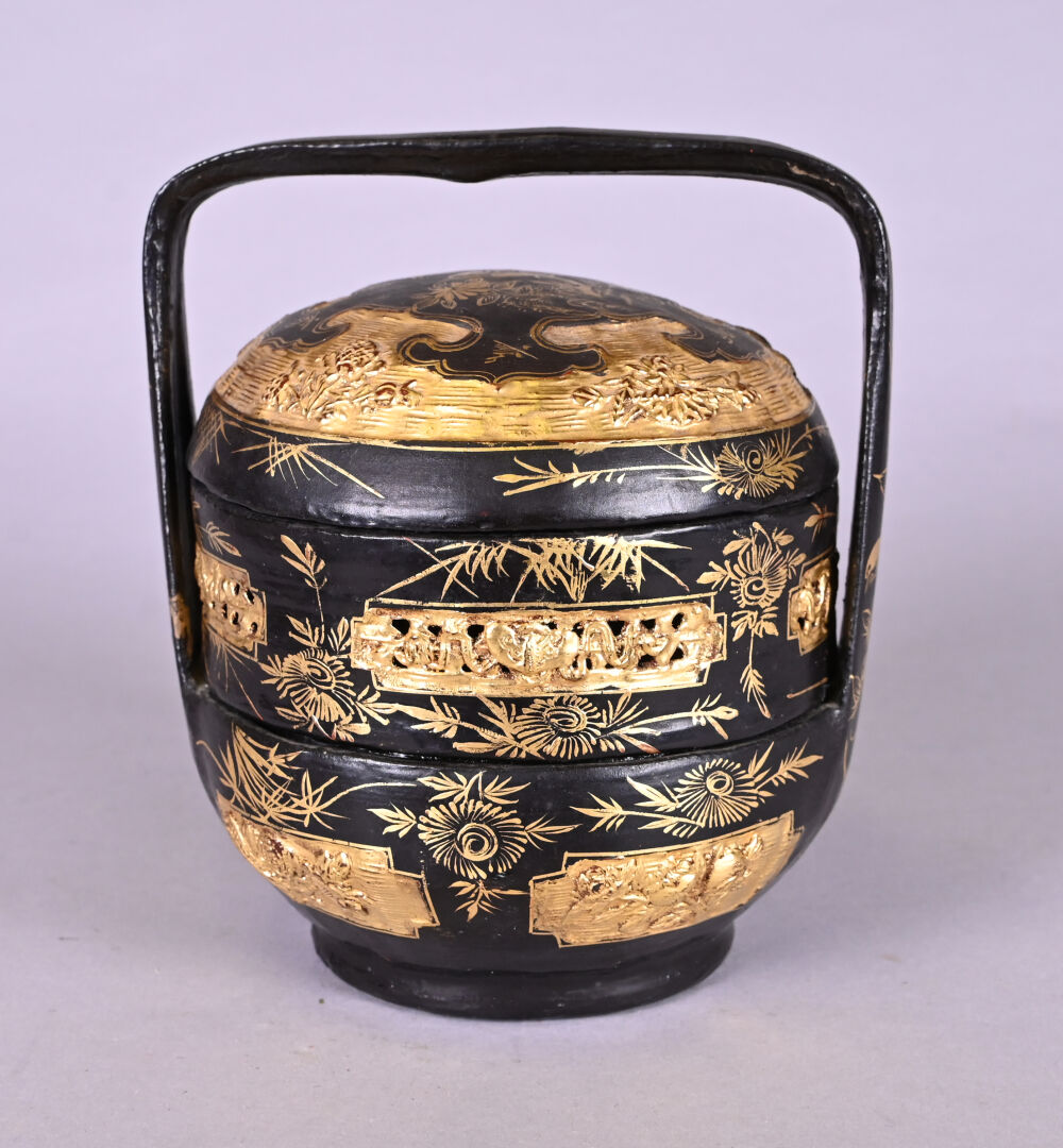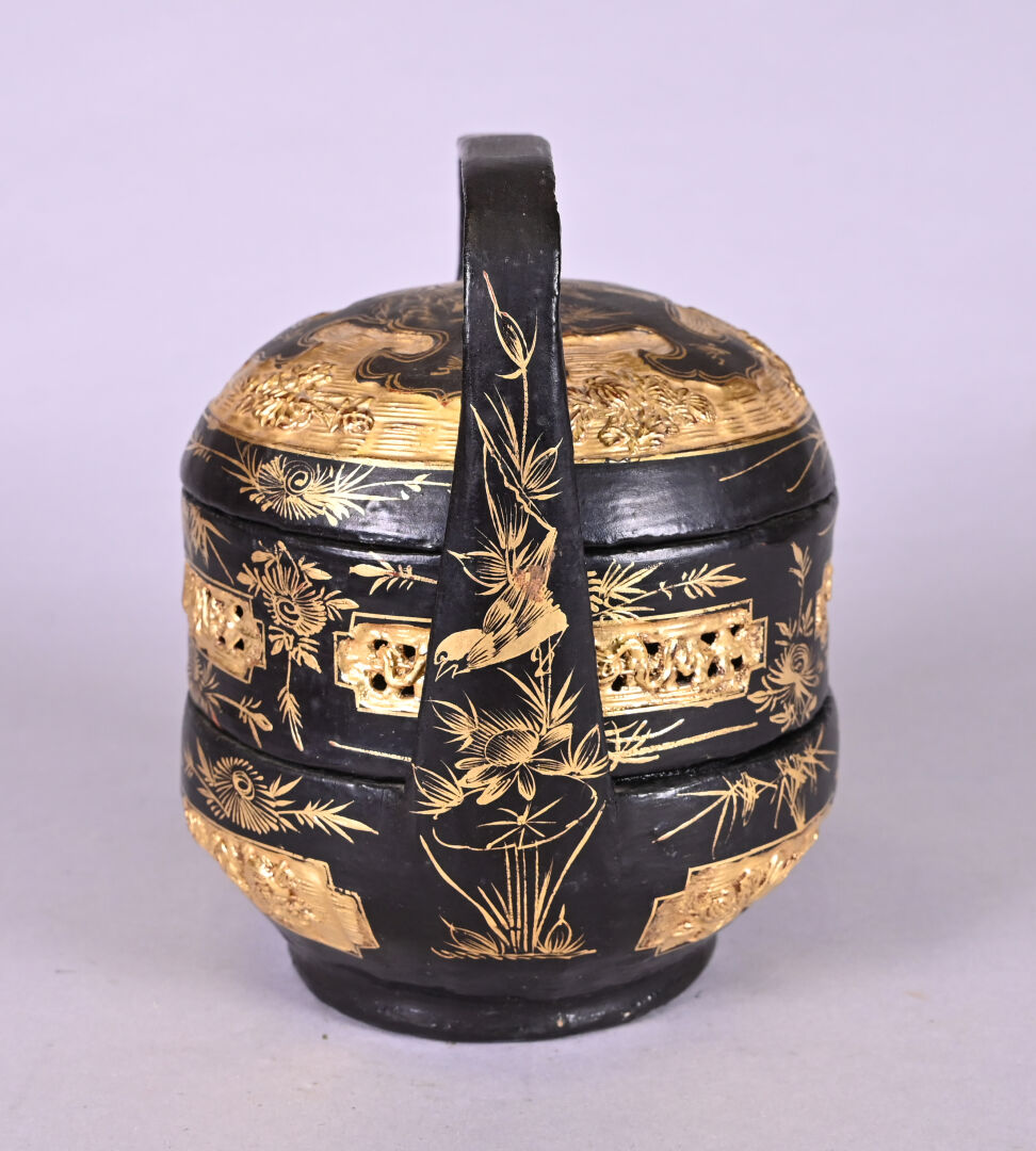 Panier à provisions ou à riz en bois laqué noir et doré à décor d’oiseaux et fleurs. Fonction probablement décorative. Haut. : 20 cm.