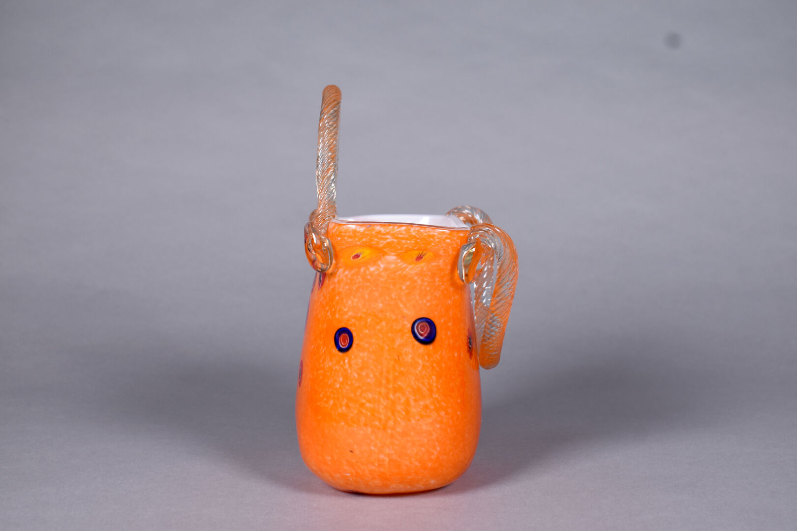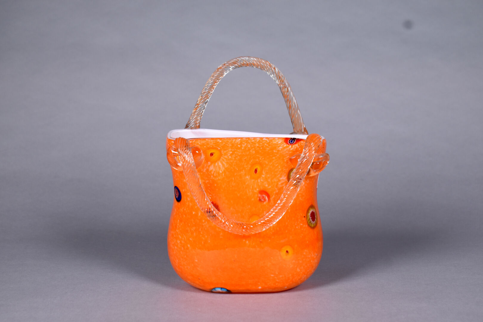 Panier en verre soufflé orange à pastilles de couleur. Murano, XXe siècle. Haut. : 21 cm.