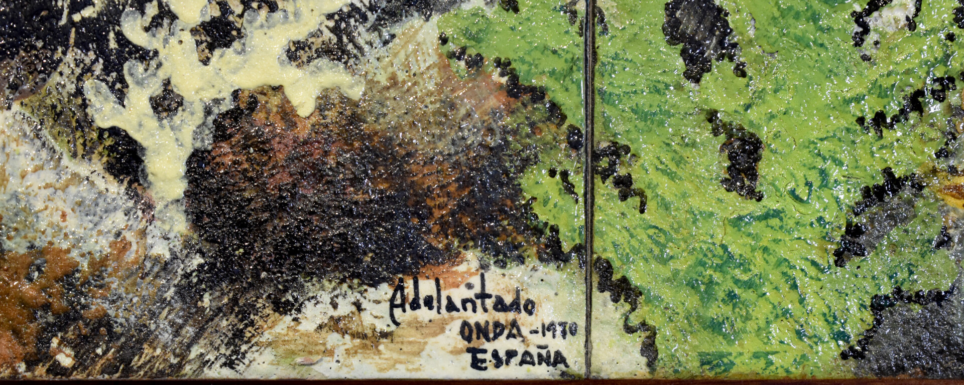 Panneau à carreaux de céramique émaillée en polychromie à décor d’un fond sous marin aux poissons sur une plaque de contreplaqué plaqué d’acajou. Marqué « ATELANTADO, ESPAGNA » et daté 1970. Dim. totales : 62,5 x 107 cm.