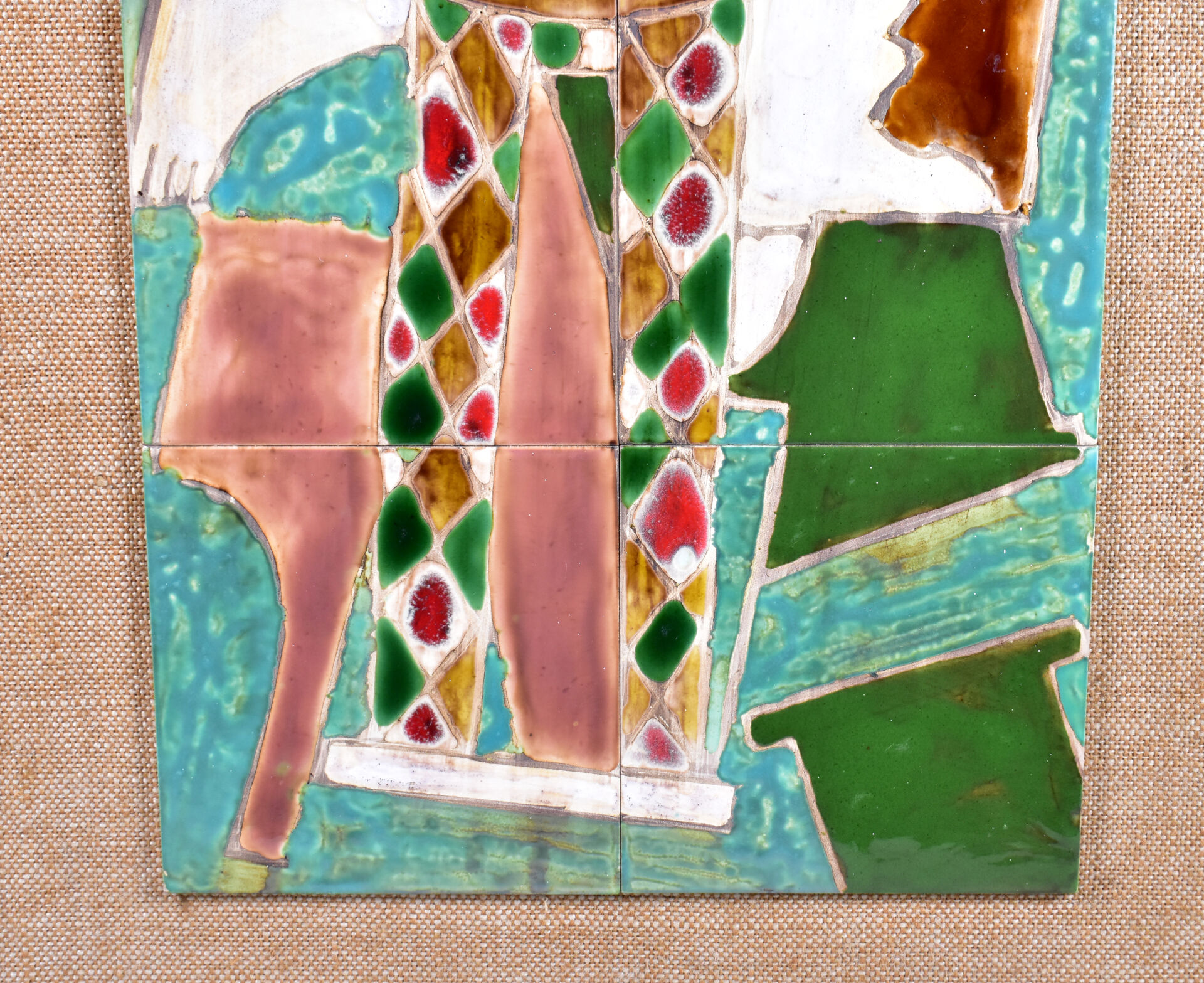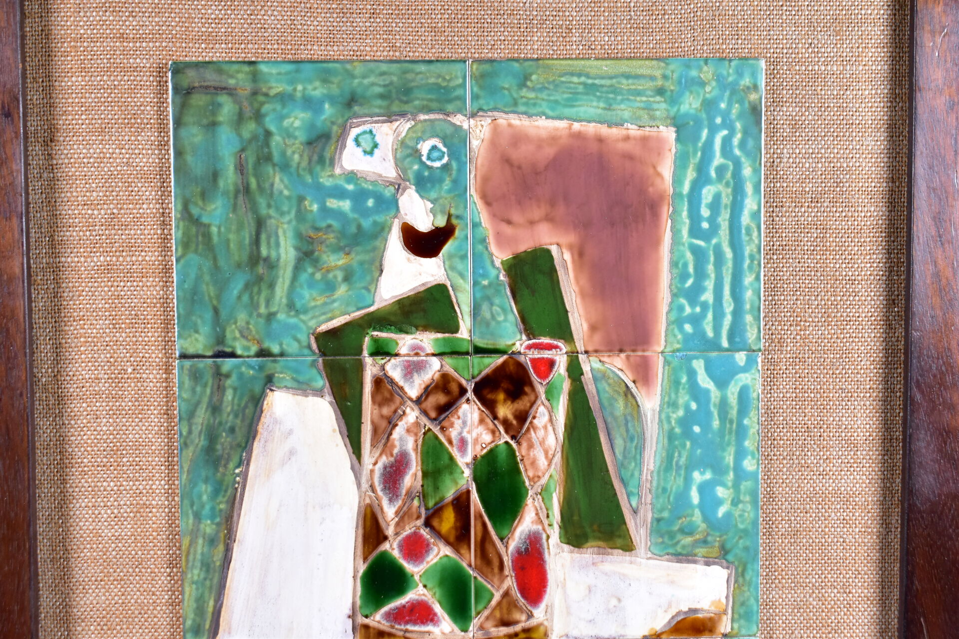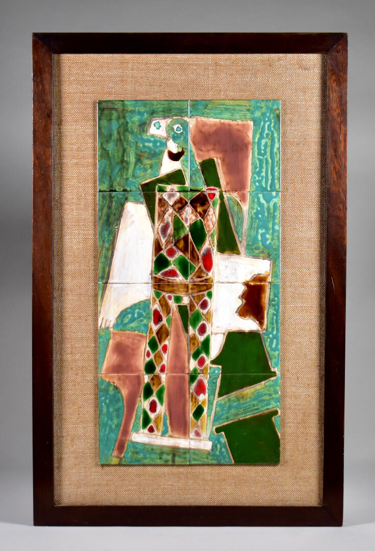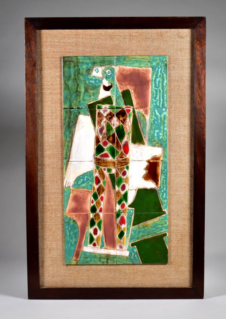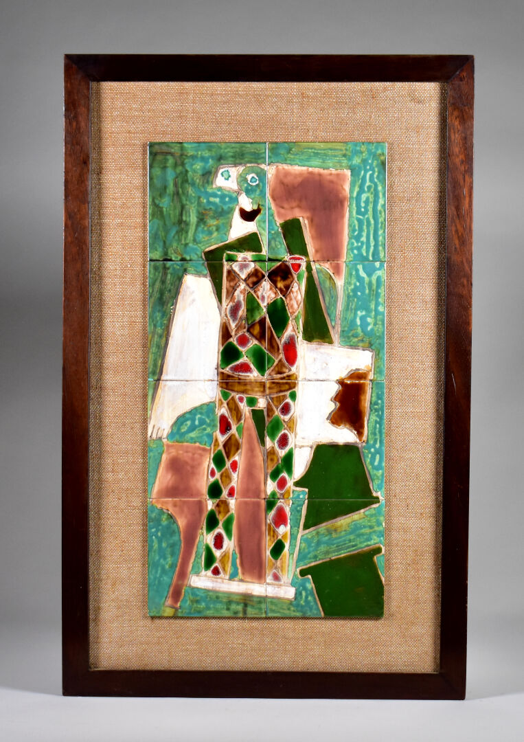 Panneau de céramique composé de 8 carreaux émaillés à décor d’un arlequin en rouge, brun et vert. Collé sur un panneau. Dim. Totales : 82 x 52 cm.