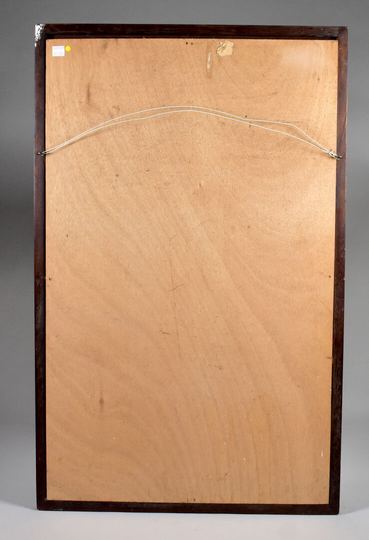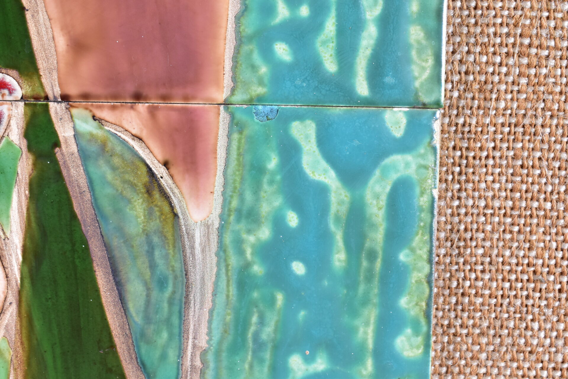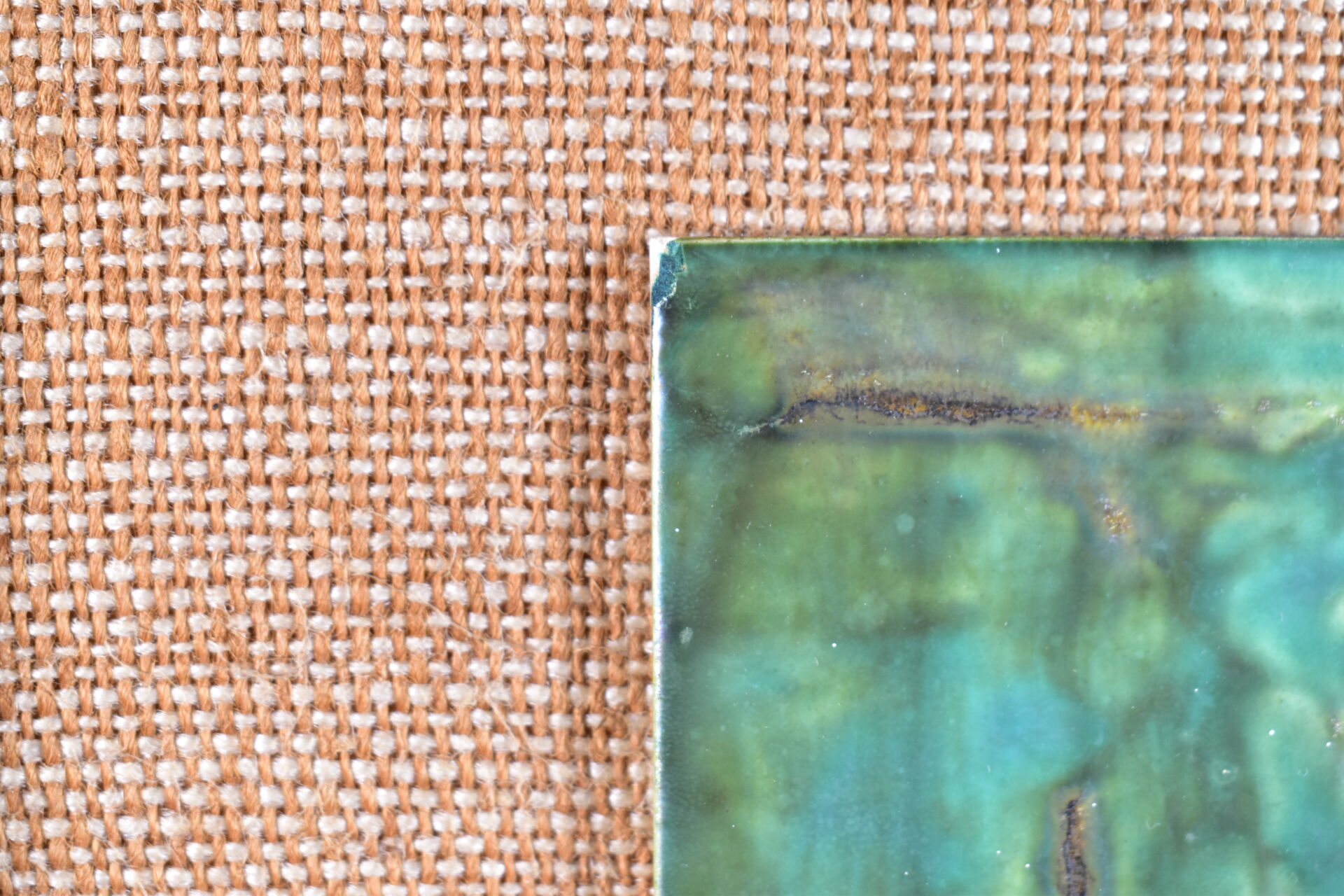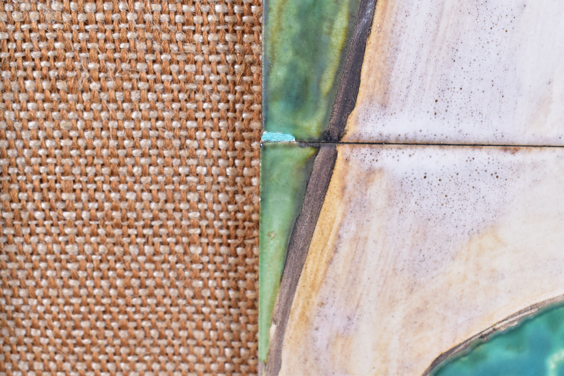 Panneau de céramique composé de 8 carreaux émaillés à décor d’un arlequin en rouge, brun et vert. Collé sur un panneau. Dim. Totales : 82 x 52 cm.
