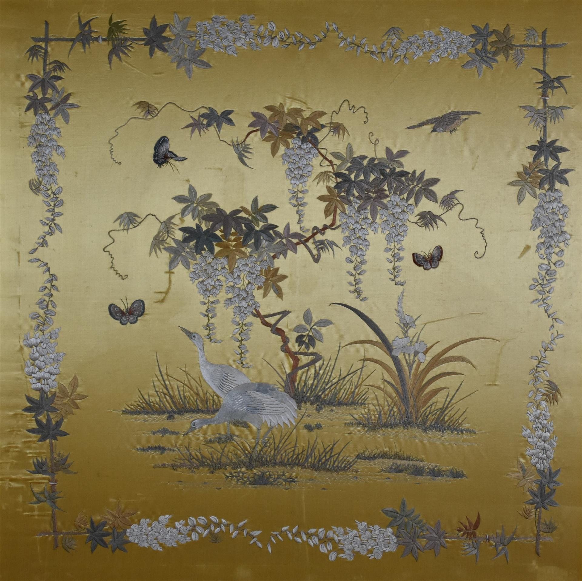 Panneau de soie brodée à décor d’échassiers et glycines sur fond or. Chine, XXe siècle. 71 x 71 cm.