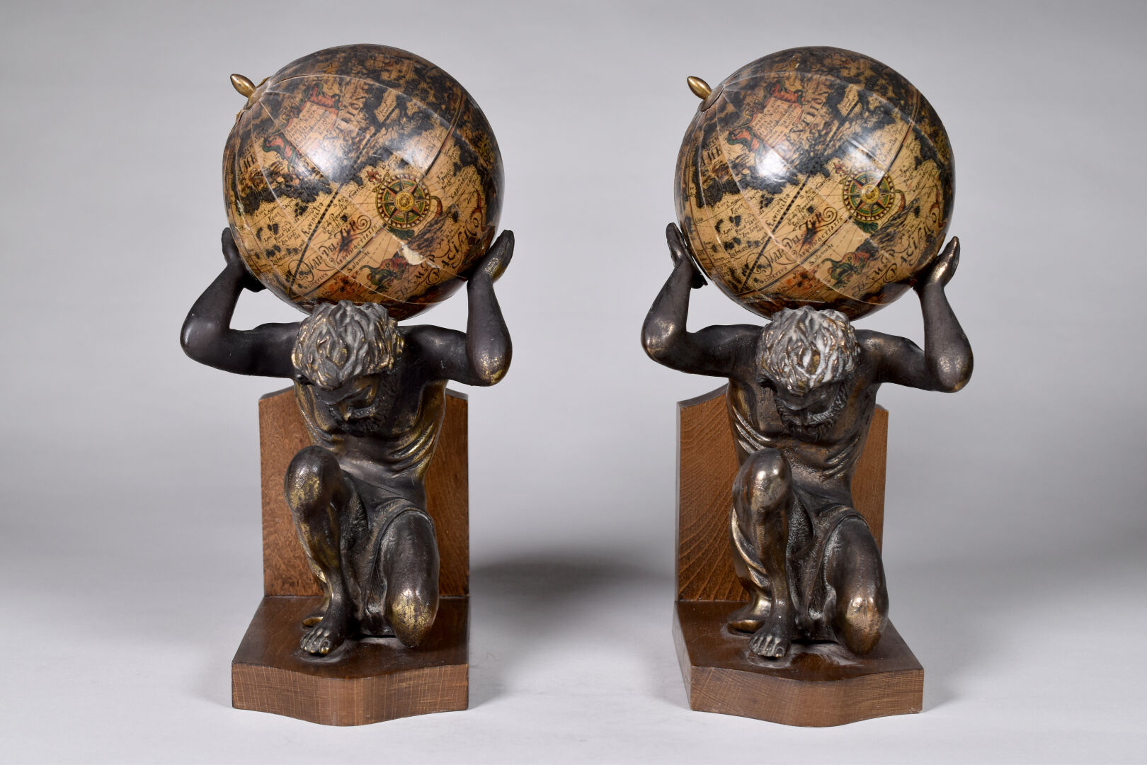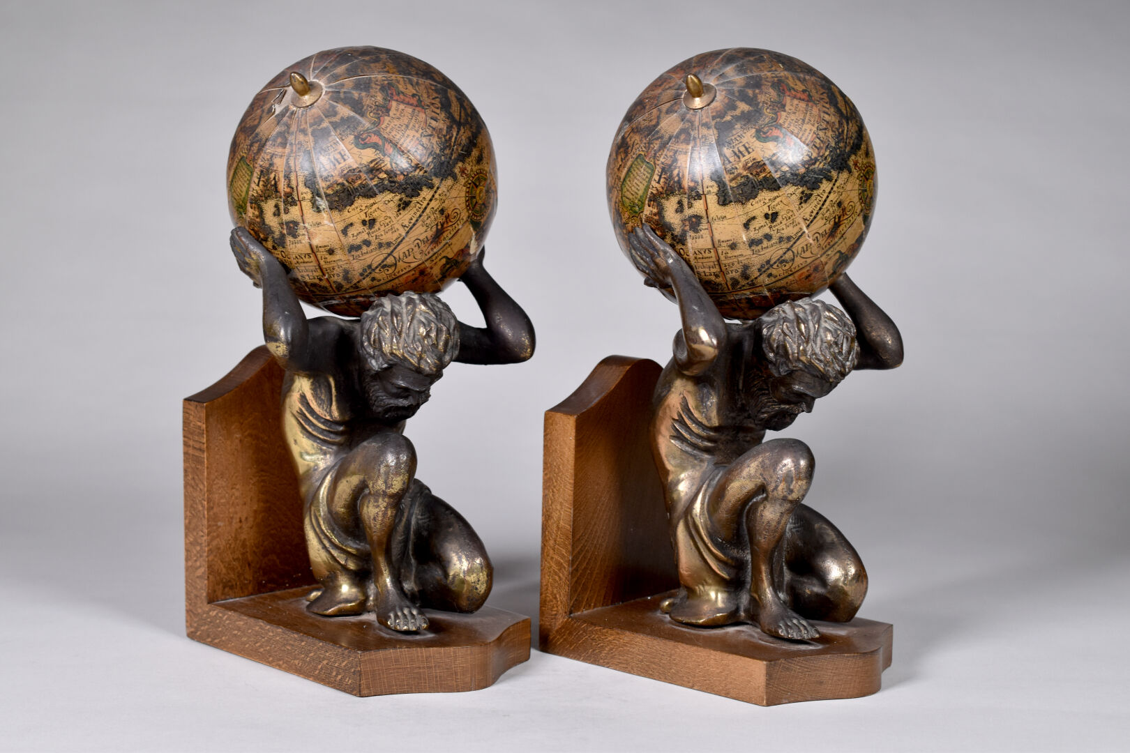Pare de serre-livres en laiton et métal lithographié représentant des atlantes tenant des globes terrestres. Socles de bois. Seconde moitié du XXe siècle. Haut. : 28 cm.